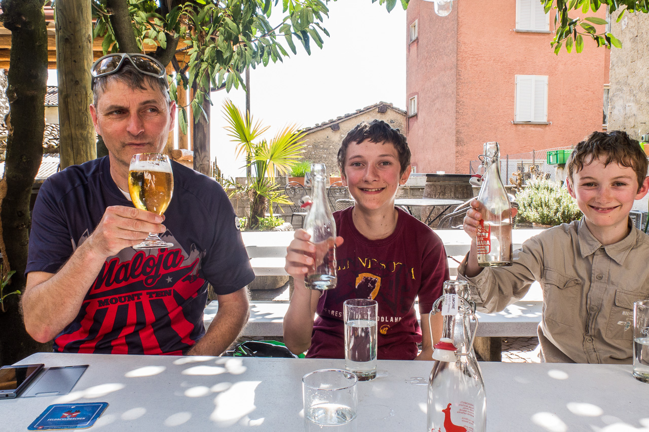 Nach so viel Abfahrt löschten wir unseren Durst in der Osteria Unione in Sonvico, bevor wir weiter abfuhren. Hätte ich die Karte genauer angeschaut, hätte ich gesehen, dass wir in eine Schlucht hinunter fahren und danach die Bikes auf der anderen Seite wieder hochschieben mussten. Eine bessere Routenwahl hatte es aber nicht gegeben, wollte man nicht noch weit im Tal hinten kehren, und das auf Asphaltstrassen. Aber auch das überstanden wir und erreichten Tesserete. Auf unserem Zähler kamen 34 Kilometer und 1560 Höhenmeter zusammen (OK, 550 Meter davon legten wir mit der Bahn zurück). Soviel zu „einfache und gemütliche Touren“!