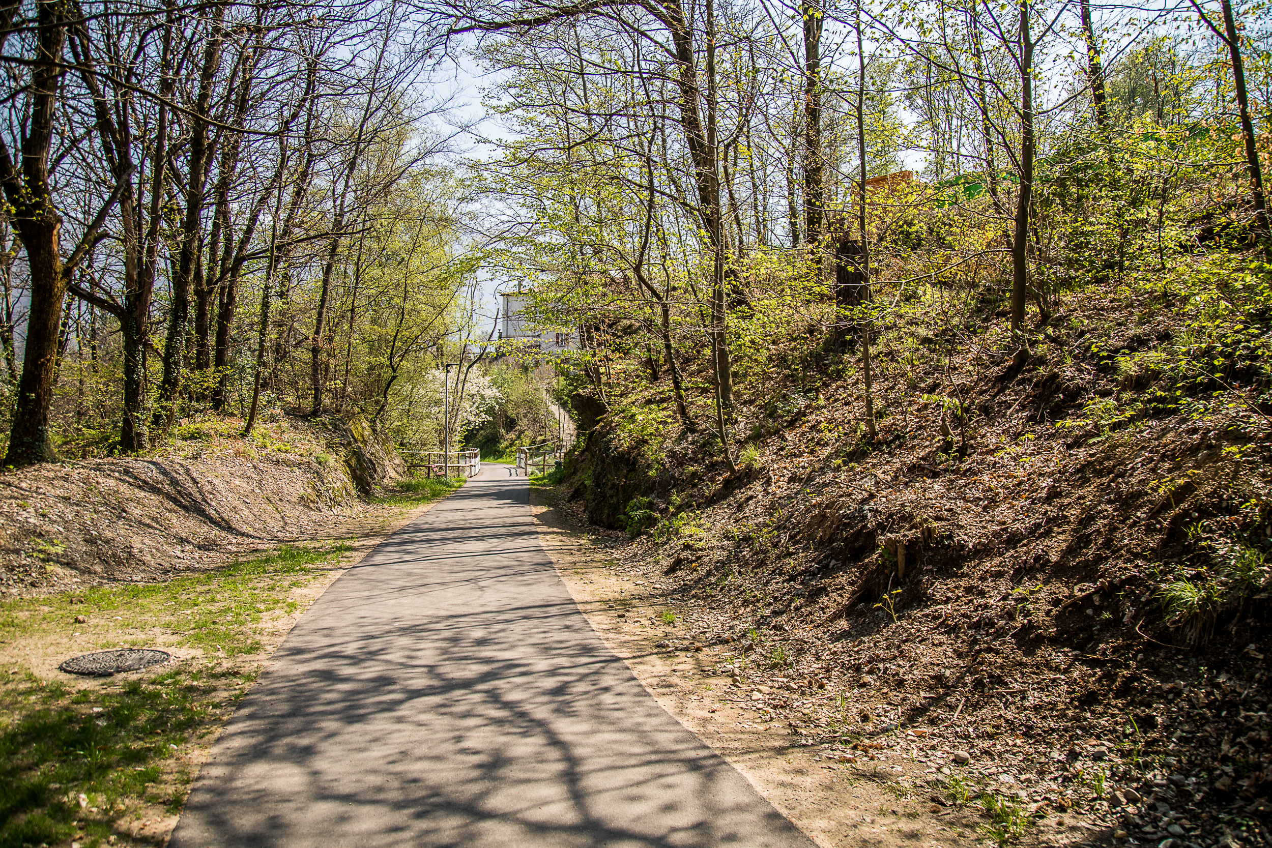 Nun ging es relativ bescheiden weiter am Freibad vorbei, jedoch nicht am anschliessenden Pumptrack. „Yeah, geil!“, und Fabian düste los. Er konnte die Runde jedoch nicht beenden, schon lag er im Kies. Na ja, Lehrgeld muss jeder bezahlen. Nach kurzem Verarzten fuhren wir nach Tesserete, wo wir uns eine wohlverdiente Pause gönnten im Ristorante Stazione. Der Rest war dann problemlos, auf dem Weg, der auf dem Gleisbett der ehemaligen Lugano-Tesserete-Bahn verläuft, gelangten wir im Nu nach Sureggio. Diesmal war die Tour wirklich einfach und gemütlich.