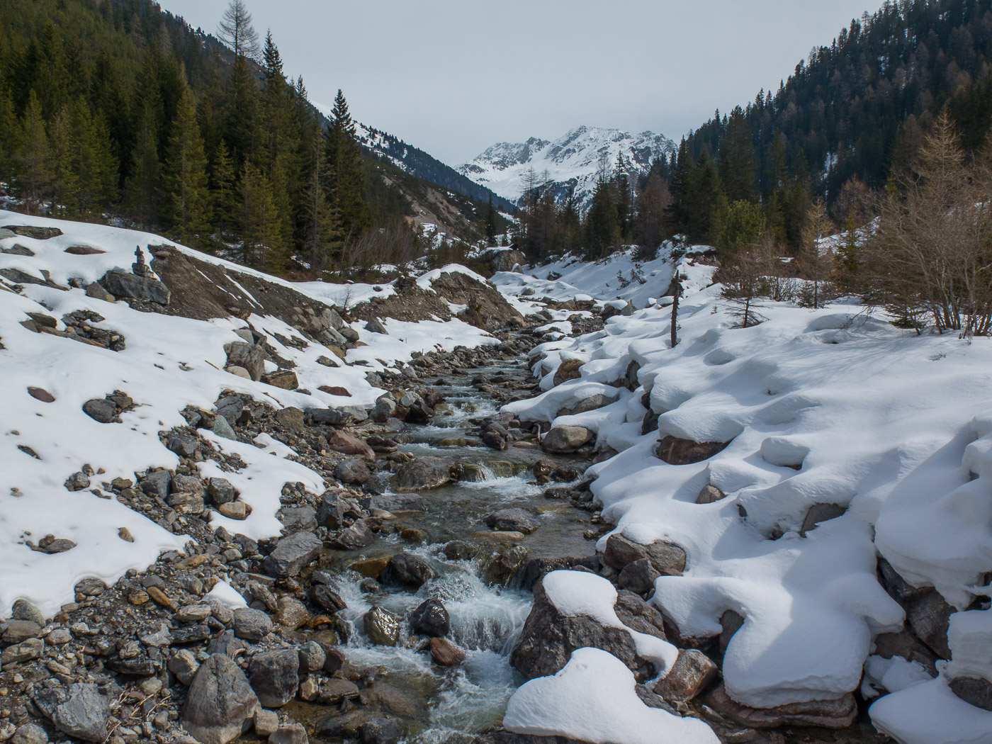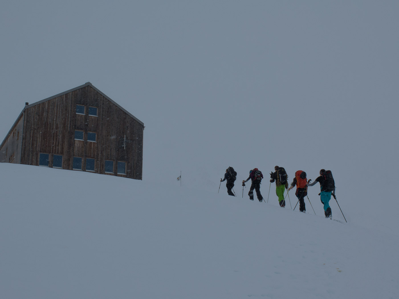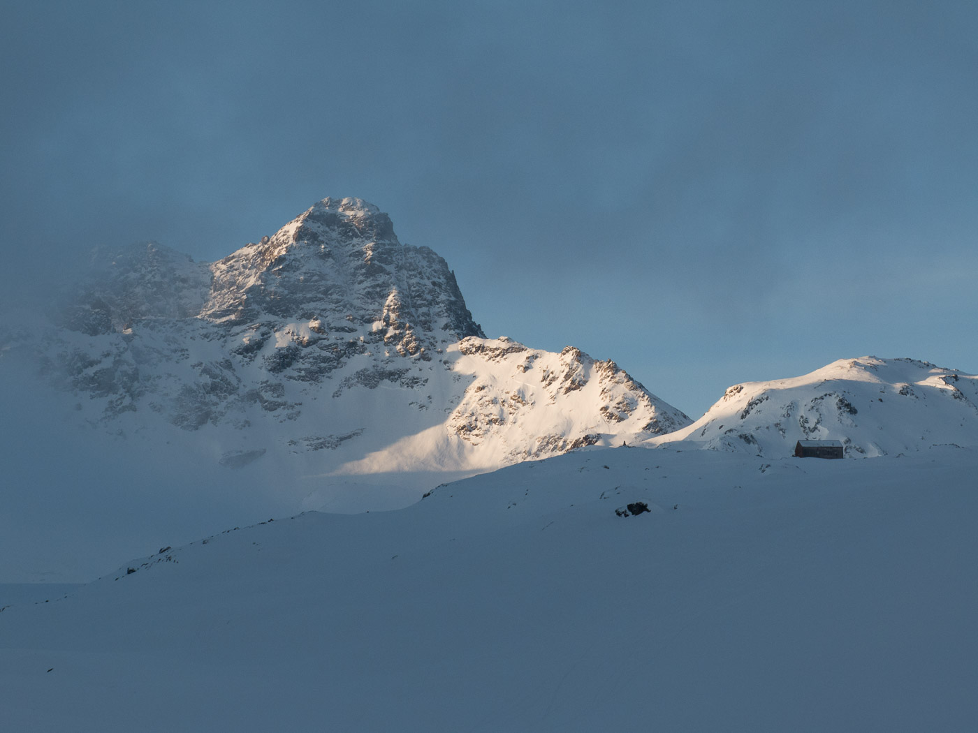 Wir gehen in aller Herrgottsfrühe auf den Zug. Nach und nach treffen wir auch auf die anderen der Gruppe. Die ÖV-Verweigerer treffen wir in Bergün, wo das Taxi wartet, ein Schulbus. Mit Kinderbestuhlung. Zum Glück dauert die Fahrt nicht stundenlang. Ich habe nach dem Schuh-Debakel am Wochenende zuvor die alten Skischuhe mitgenommen. Bei noch schönem Wetter starten wir im Val Tuors. Wie befürchtet ist der Weg flach bis Chants, wo wir eine Rast einlegen, bevor der Weg dann endlich ansteigt. Am Himmel ziehen immer dichtere Wolken auf, irgendwann beginnt es auch zu schneien. Zum Glück ist es nicht mehr weit zur Hütte.