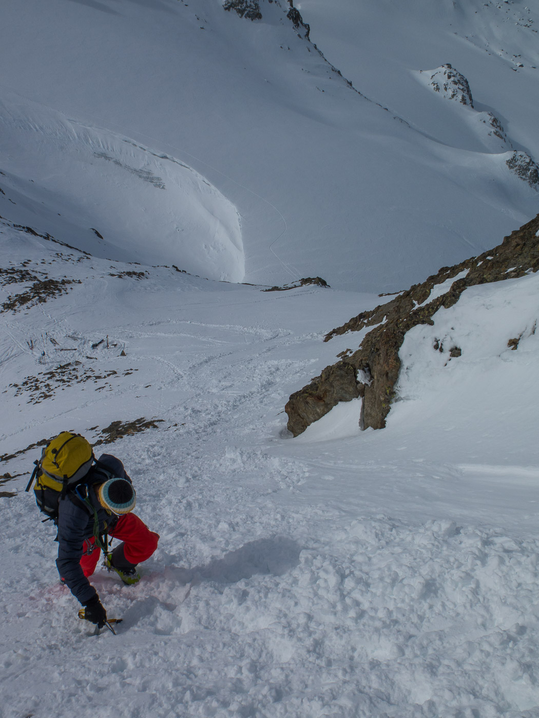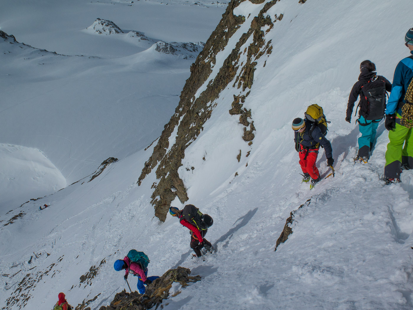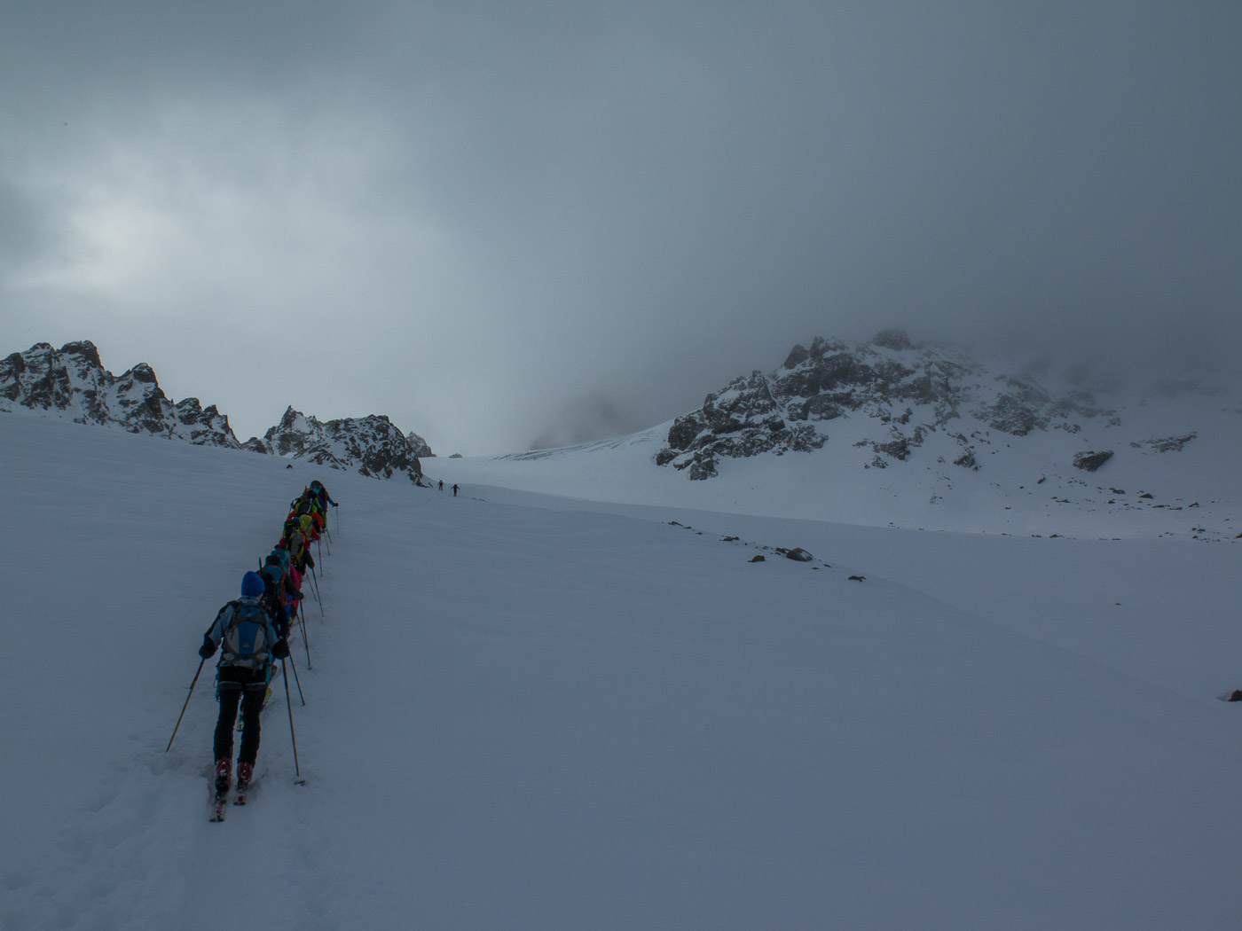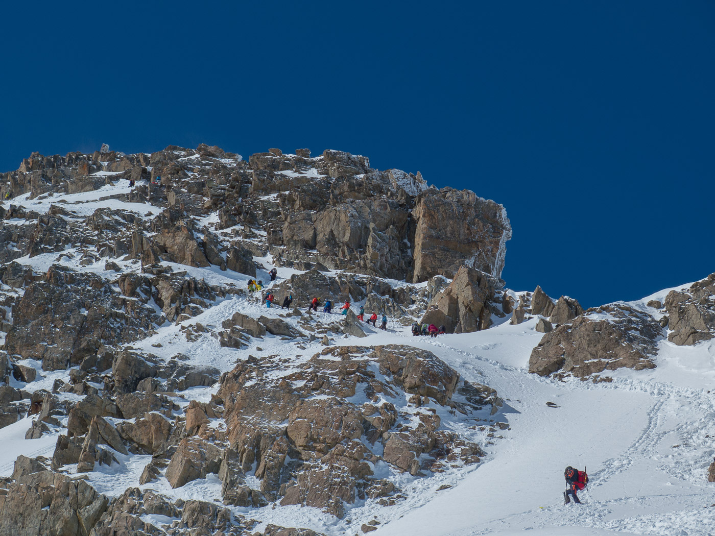 Wir legen nochmals eine Rast ein, bevor wir das Skidepot erreichen. Dort werden die Skis mit den Steigeisen und die Stöcke mit dem Pickel getauscht. Am Berg sieht es aus wie am Mount Everest, überall Leute. Trotzdem sind wir voll motiviert, nur der Tourenleiter ist skeptisch: „Mal schauen, ob wir hier hochkommen.“ Wir steigen in den bewährten Seilschaften auf über ein steiles Schneefeld. Bald sind wir mitten in Fels und Schnee. Ein steiles Couloir, wir lösen unsere Seilverkürzung auf, um den Tourenleiter zu sichern am einzigen Bohrhaken. Er klettert hoch.