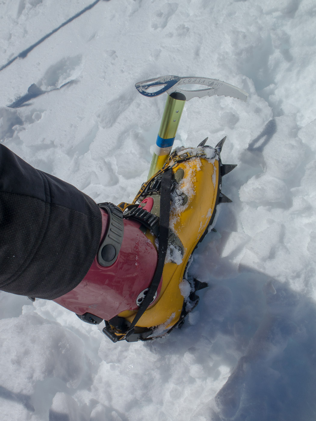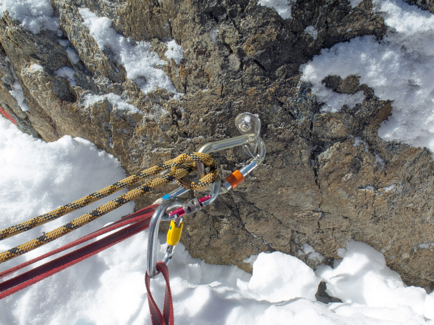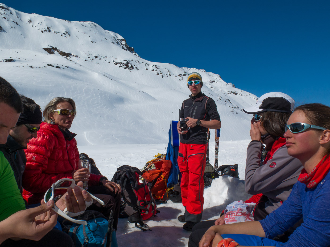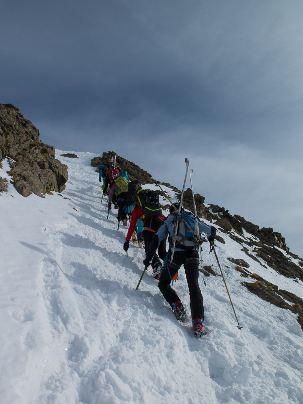 Wir legen nochmals eine Rast ein, bevor wir das Skidepot erreichen. Dort werden die Skis mit den Steigeisen und die Stöcke mit dem Pickel getauscht. Am Berg sieht es aus wie am Mount Everest, überall Leute. Trotzdem sind wir voll motiviert, nur der Tourenleiter ist skeptisch: „Mal schauen, ob wir hier hochkommen.“ Wir steigen in den bewährten Seilschaften auf über ein steiles Schneefeld. Bald sind wir mitten in Fels und Schnee. Ein steiles Couloir, wir lösen unsere Seilverkürzung auf, um den Tourenleiter zu sichern am einzigen Bohrhaken. Er klettert hoch.