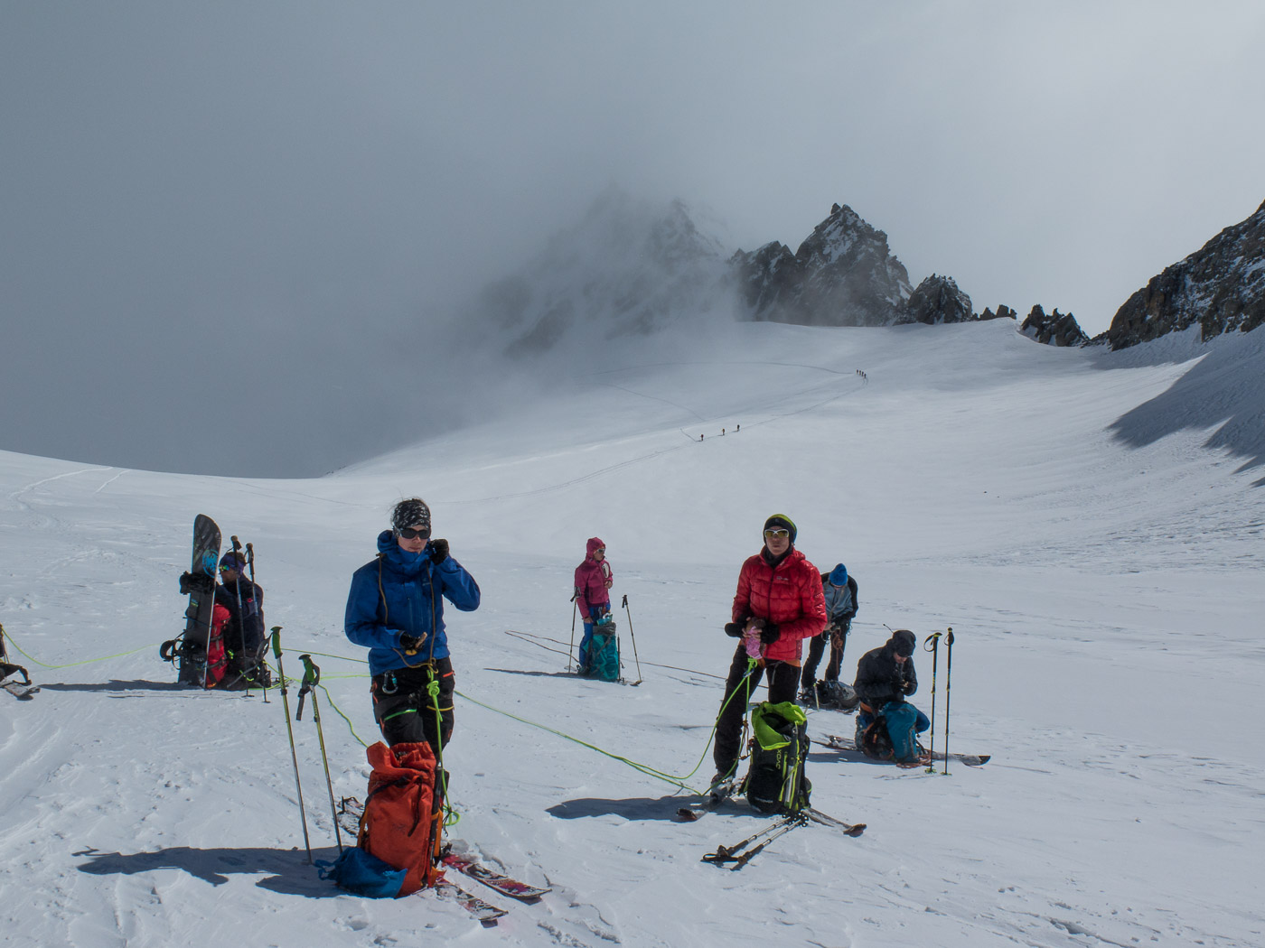Am nächsten Morgen starten wir um acht Uhr, die Tour sollte der Höhepunkt werden: Piz Kesch. Die Gipfel sind noch von Nebel umhüllt, es bläst ein starker und kalter Wind. Aber um acht soll sich die Bewölkung auflösen und um neun der Wind abstellen, so jedenfalls hat es uns der Hüttenwart, Reto, prophezeit, er hat das Orakel befragt (also den Wetterbericht auf dem iPad studiert). Das Wetter hält sich aber nicht an die Vorhersage und hat wohl etwas Verspätung. Am Rande des Gletschers seilen wir uns an. Das ist mühsam, man ist wortwörtlich angebunden und kann sich nicht mehr frei bewegen. Aber nötig ist es halt wegen den Gletscherspalten. Schliesslich kommt die versprochene Aufhellung doch noch. Zuerst nur zaghaft reisst die Wolkendecke auf und gibt den Blick auf unser Ziel frei. Sehr imposant, diese Wand, wo wir hoch wollen.