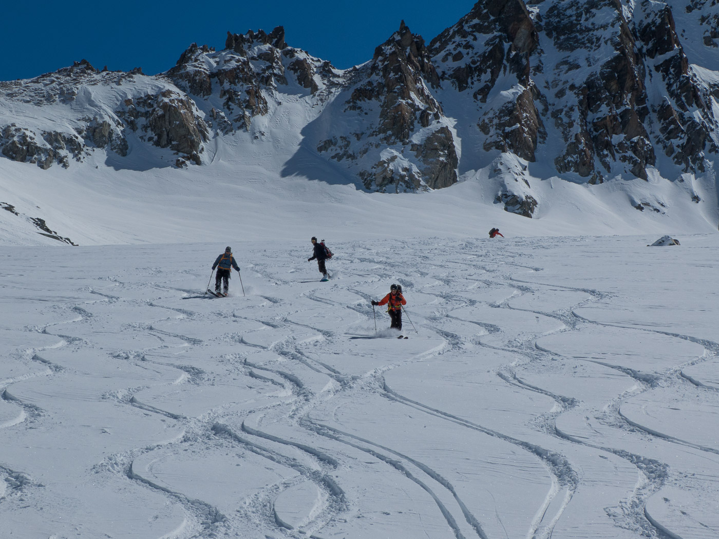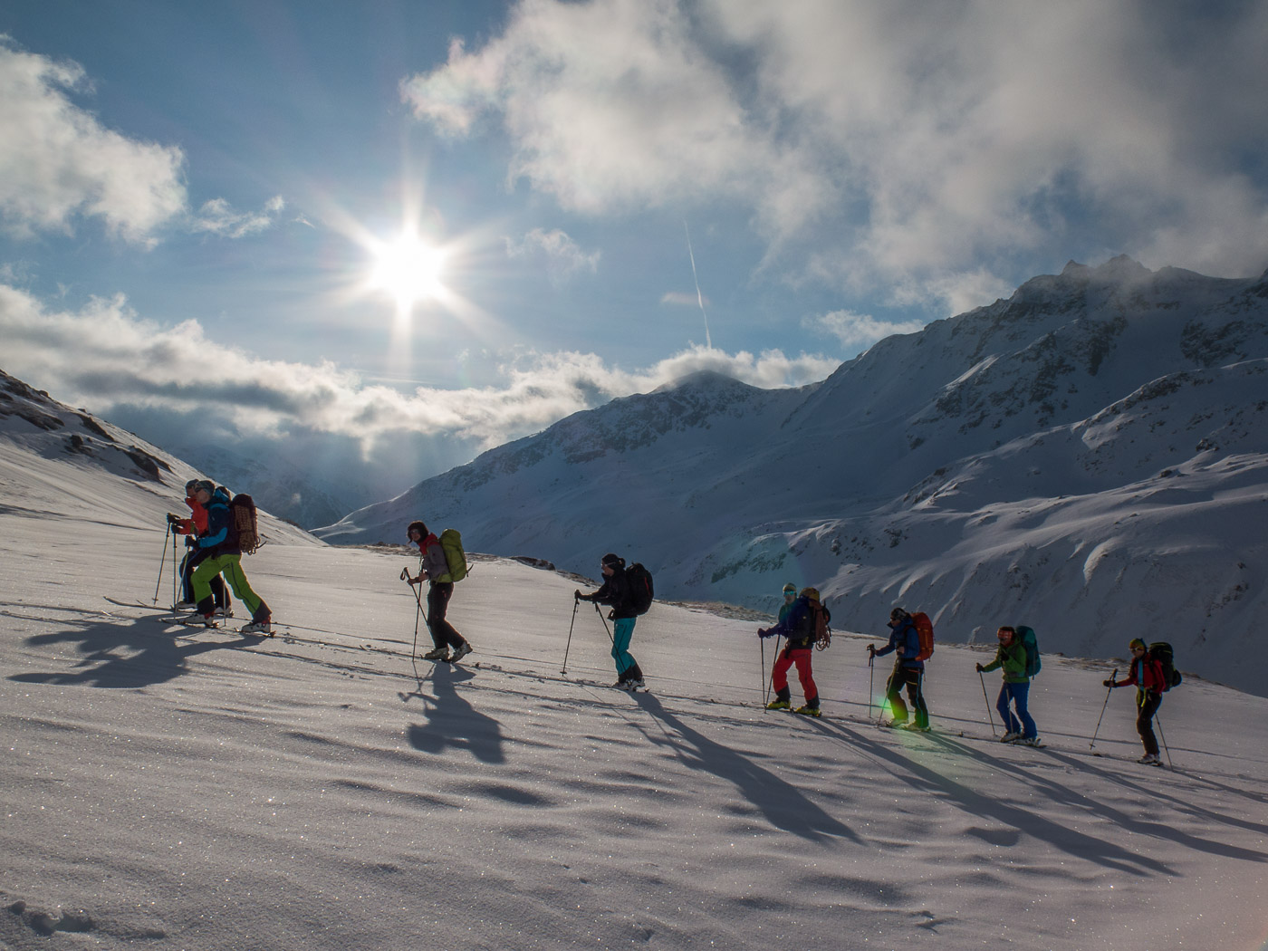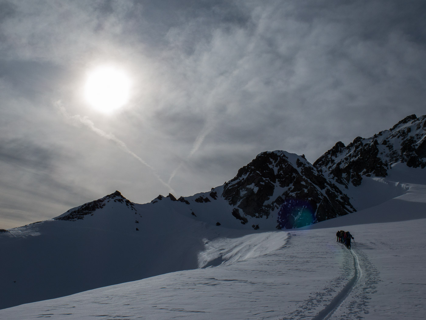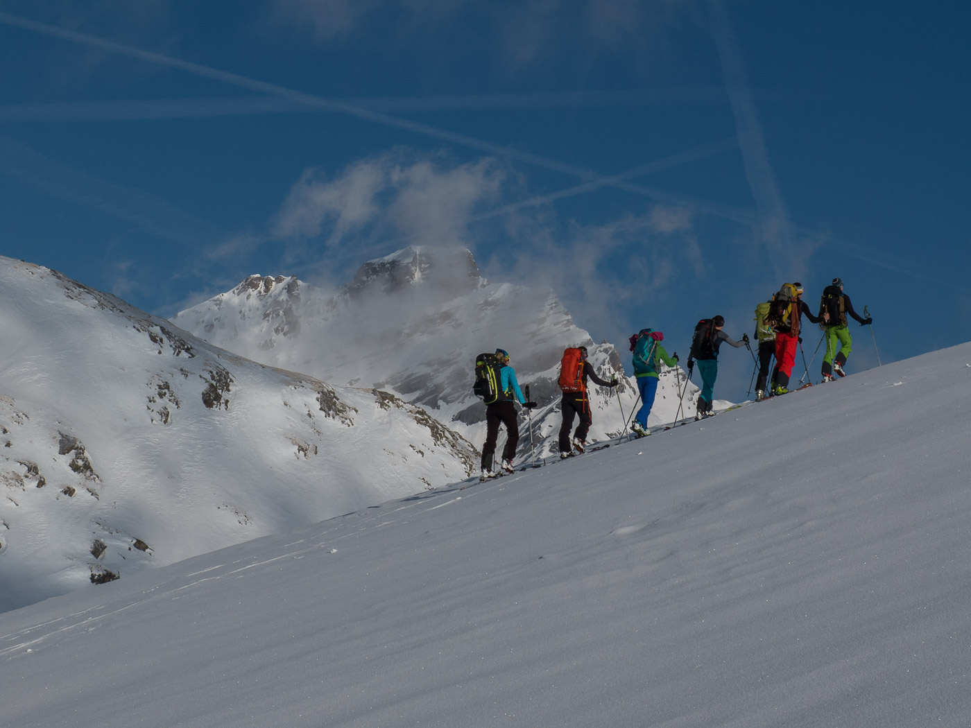 Der letzte Tag beginnt mit einer Abfahrt. Wir fahren bis ca. 2400 Meter, bevor wir die Felle aufkleben und aufsteigen Richtung Sertigpass mit der Idee, das Passhöreli noch zu besteigen. Die Sonne scheint, doch der Gipfel ist in Nebel gehüllt. Je höher wir steigen, desto windiger wird es. Und die Wolkenwalze um das Passhöreli will auch nicht verschwinden. Der namenlose Gipfel auf der anderen Seite des Sertigpasses hat Sonne. Der Tourenleiter ändert den Plan, wir besteigen diesen. Dort ist es sonnig, aber nicht weniger windig, die Gipfelpause fällt entsprechend kurz aus. Der Schnee in der Abfahrt ist vom Typ Carton de Blamage, also Bruchharst.