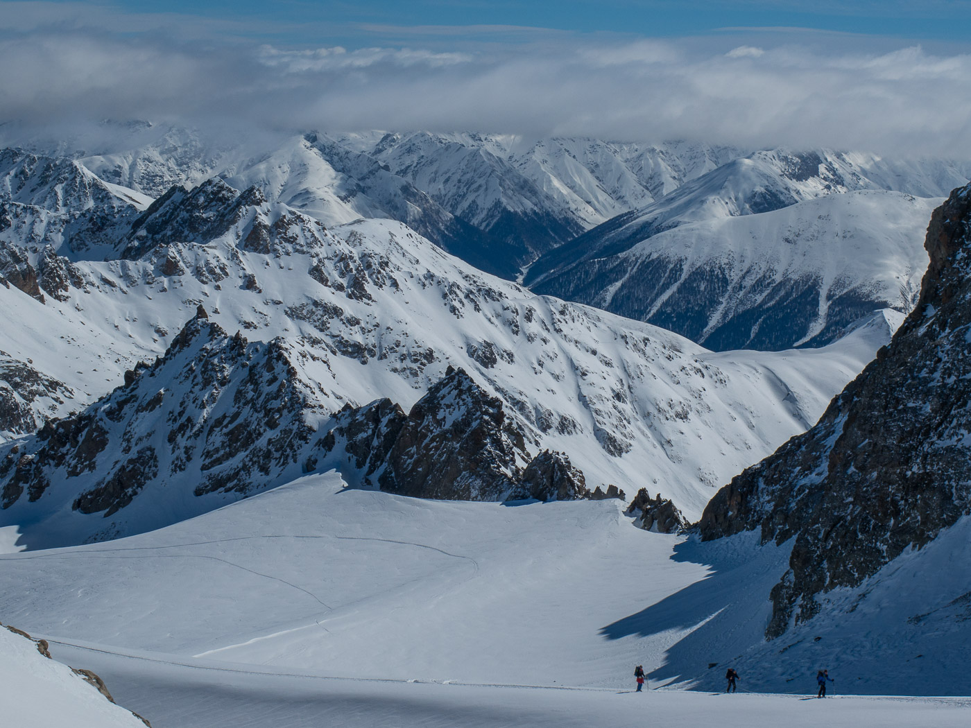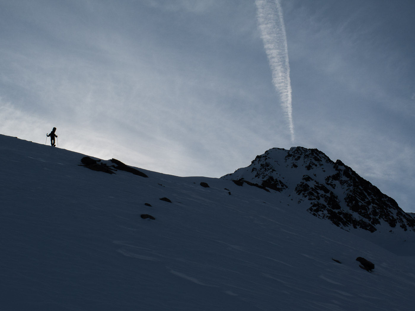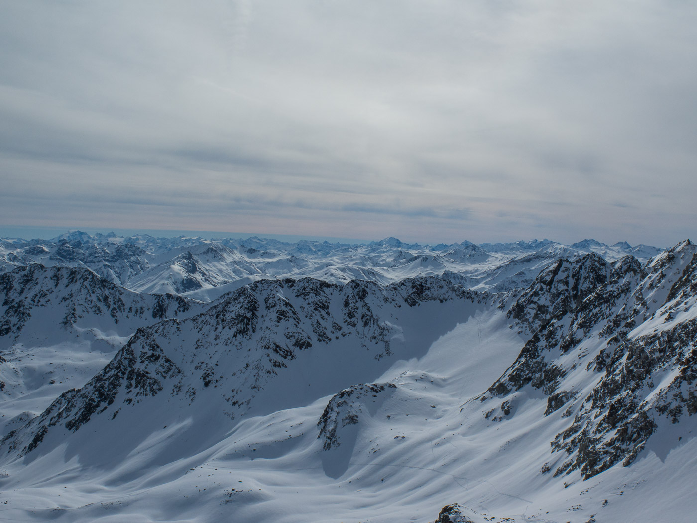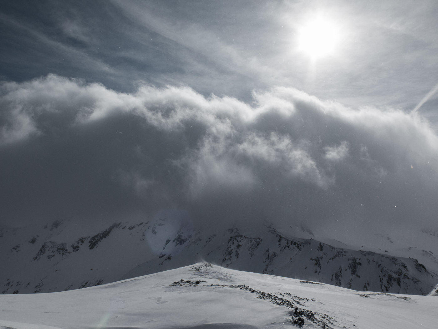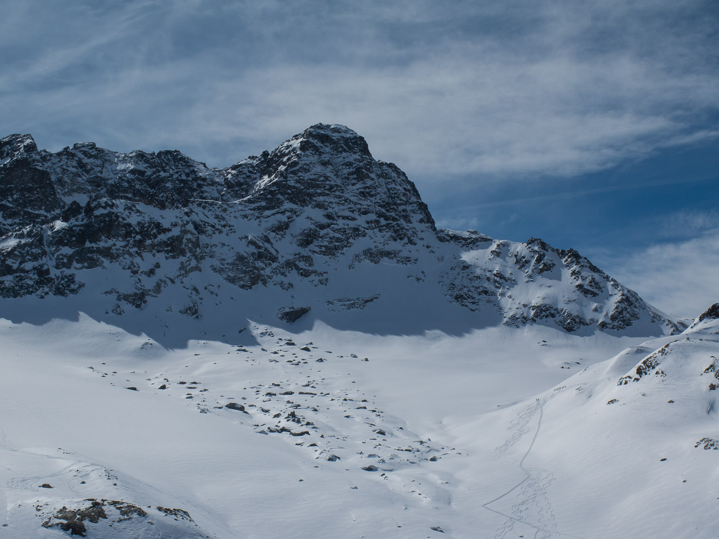 Der letzte Tag beginnt mit einer Abfahrt. Wir fahren bis ca. 2400 Meter, bevor wir die Felle aufkleben und aufsteigen Richtung Sertigpass mit der Idee, das Passhöreli noch zu besteigen. Die Sonne scheint, doch der Gipfel ist in Nebel gehüllt. Je höher wir steigen, desto windiger wird es. Und die Wolkenwalze um das Passhöreli will auch nicht verschwinden. Der namenlose Gipfel auf der anderen Seite des Sertigpasses hat Sonne. Der Tourenleiter ändert den Plan, wir besteigen diesen. Dort ist es sonnig, aber nicht weniger windig, die Gipfelpause fällt entsprechend kurz aus. Der Schnee in der Abfahrt ist vom Typ Carton de Blamage, also Bruchharst.