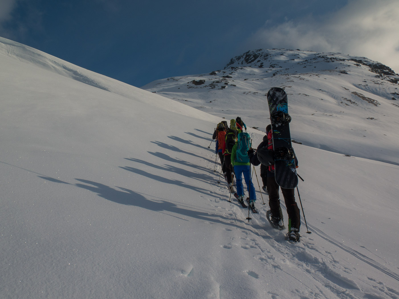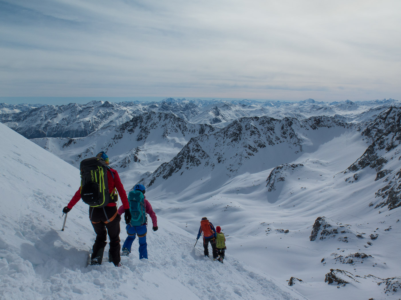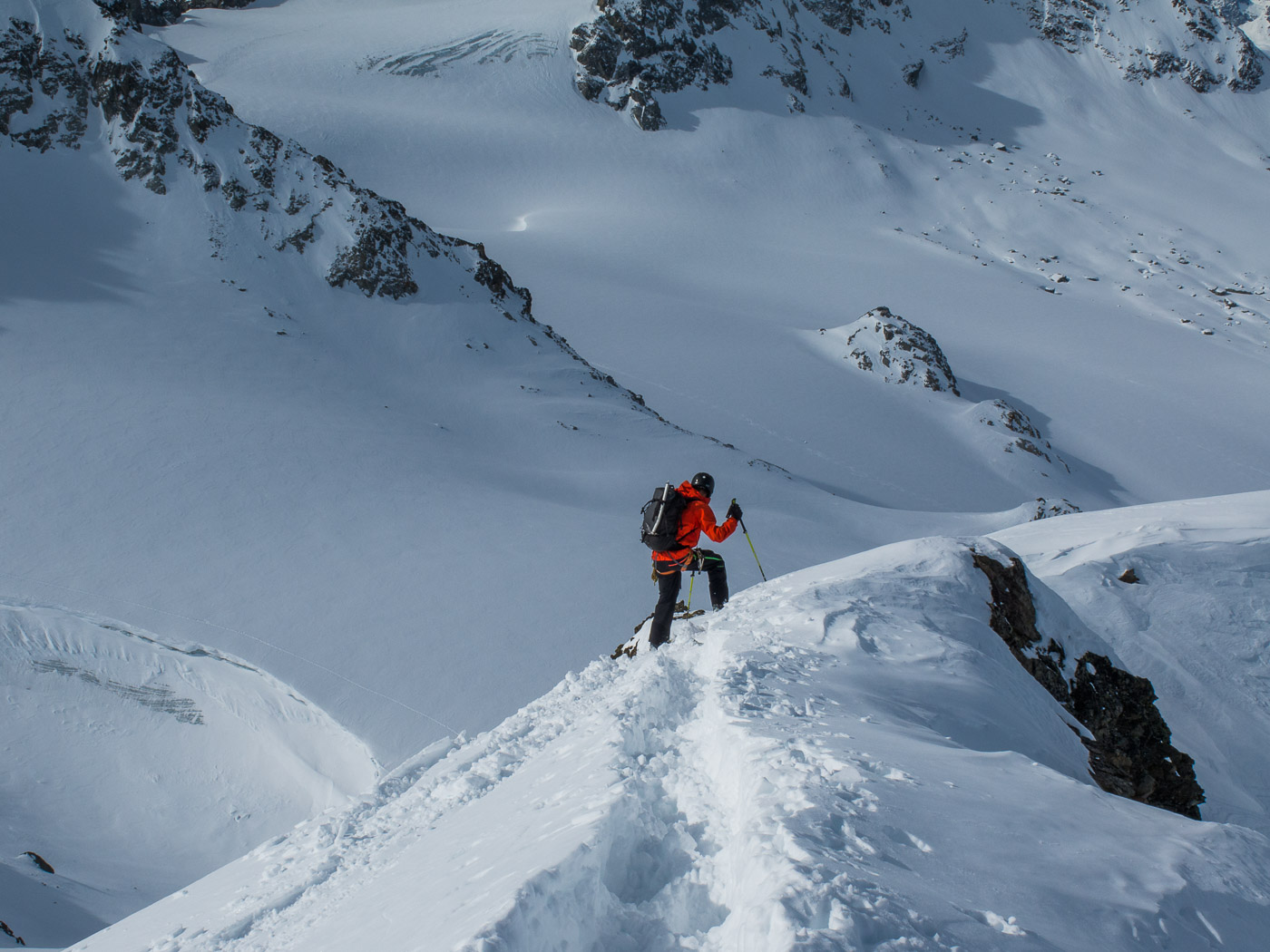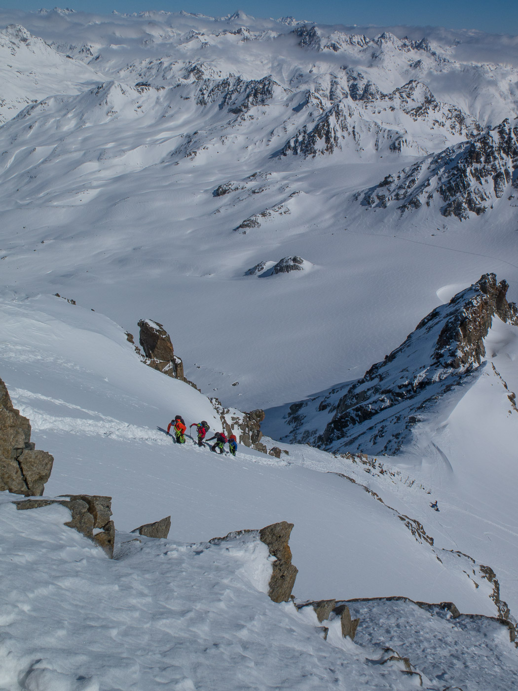 Nun wird es deftig. Die Aufstiegsspur führt uns steil aufwärts durch felsdurchsetztes Gelände. Zwischendurch tragen wir die Skis. Nach diesem Steilstück folgt ein fast flacher Gratrücken. An dessen Ende deponieren wir die Skis und gehen zu Fuss weiter, zwei nehmen allerdings die Skis noch mit. Es ist wieder ziemlich steil, aber längst nicht mehr so wie am Vortag am Piz Kesch. Über den schmalen Schlussgrat erreichen wir den Gipfel.