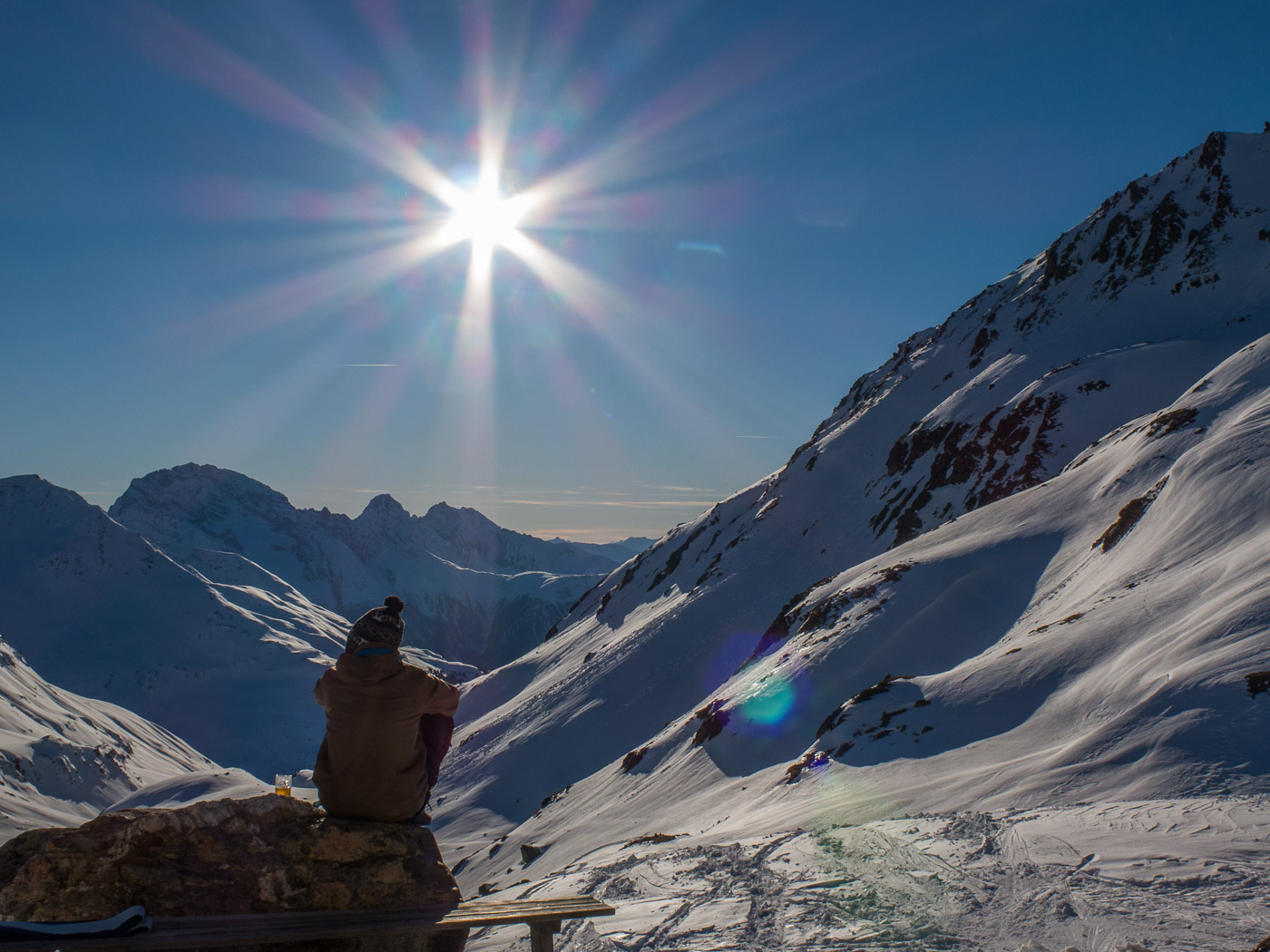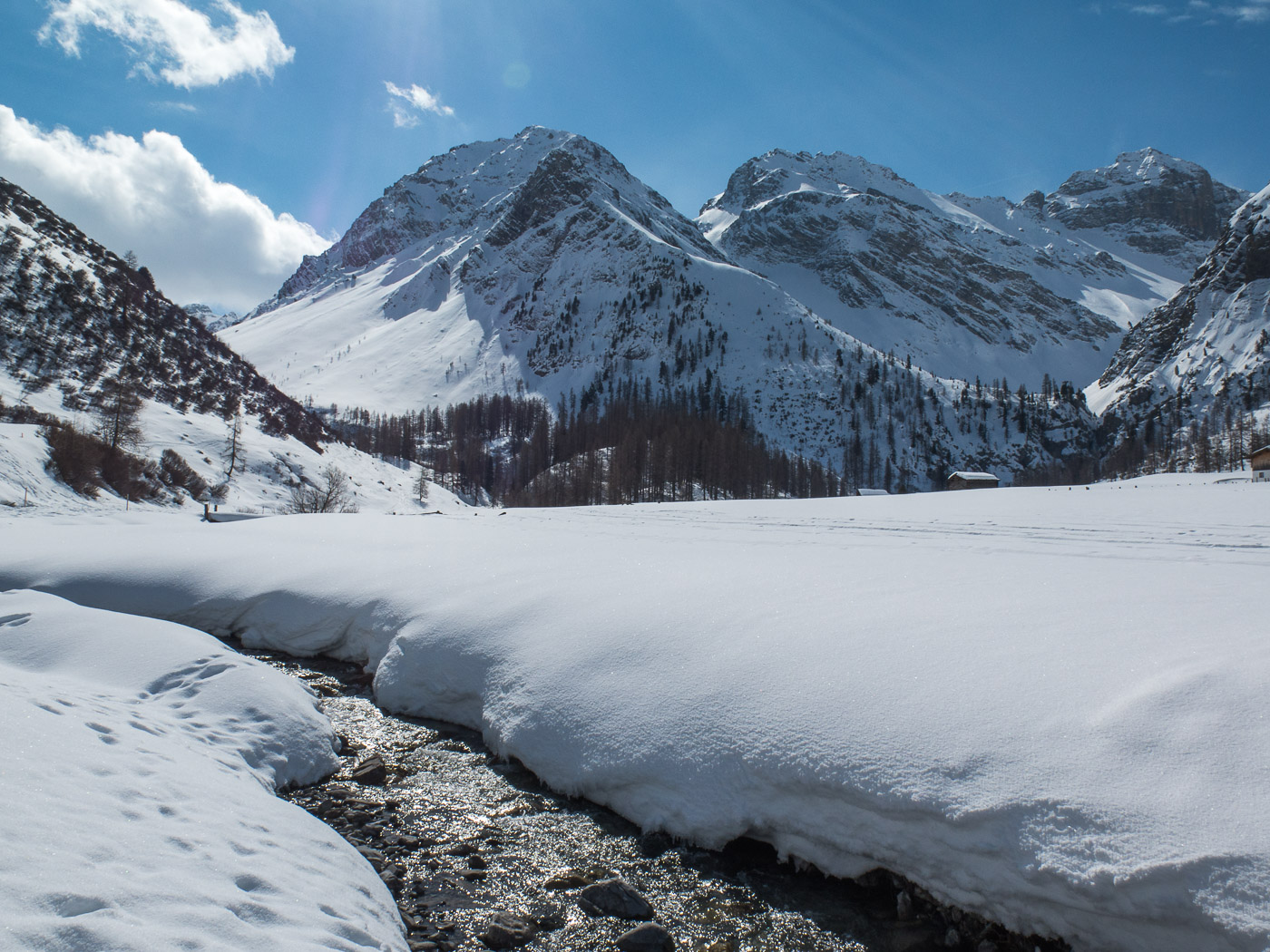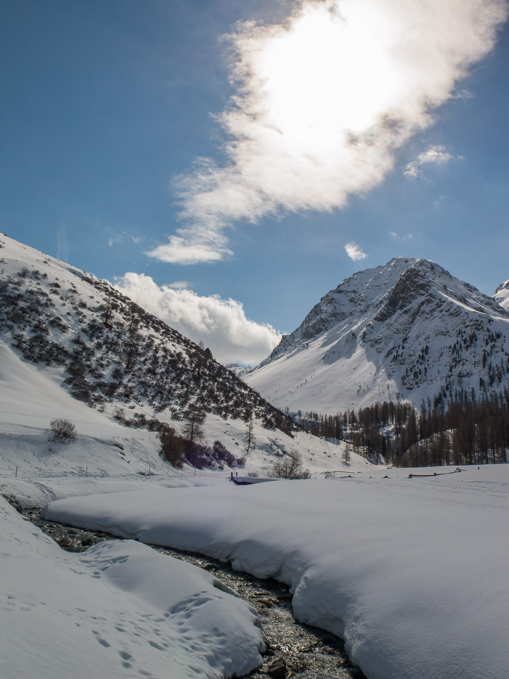 Vom Pass her fahren wir auf der entgegengesetzten Exposition ab, wo der Schnee viel besser ist. Und es windet auch nicht mehr so fest hier, so dass wir endlich eine richtige Rast einlegen wollen. Aber kaum aus den Skiern gesprungen, kommt eine Wolke und verhüllt die Sonne. Nichts mehr mit gemütlich rasten, so dass wir halt weiter fahren. Dann ein Blick zurück: Das Passhöreli strahlt im schönsten Sonnenschein. Tja, so ist das Bergsteigerleben. Auf der Karte sieht der Weg durchs Chüealptal, in dem wir jetzt sind, mühsam aus: Langgezogen und flach. Aber zum Glück geht es stetig abwärts, so dass wir bald im Sand sind, dem hintersten Weiler des Sertigtales. Ein wunderschönes Tal, das wohl zu jeder Jahreszeit einen Besuch wert ist. Wieder liegt eine gewisse Magie in der Luft. Es ist zwölf Uhr, wir haben immer noch nichts gegessen, der Magen knurrt, wir werden wieder in die Realität zurückgeholt. Da vorne ist ein Restaurant. Wer will jetzt schon noch von seinen mitgebrachten Sachen essen? Jetzt gibt es Rösti!