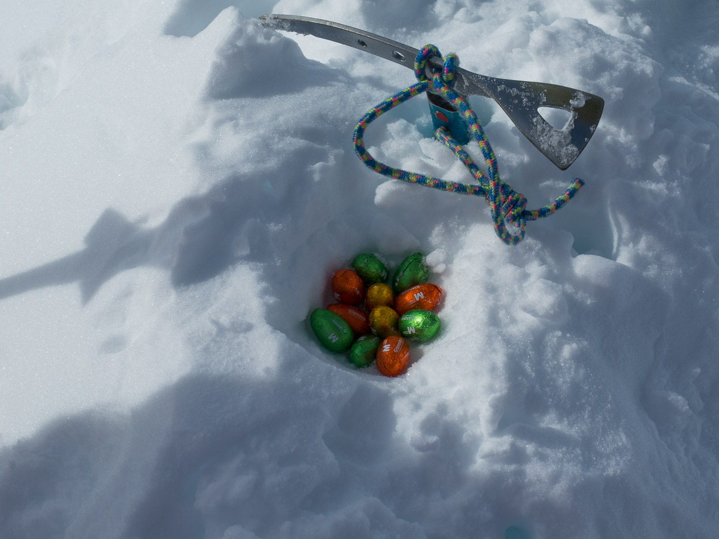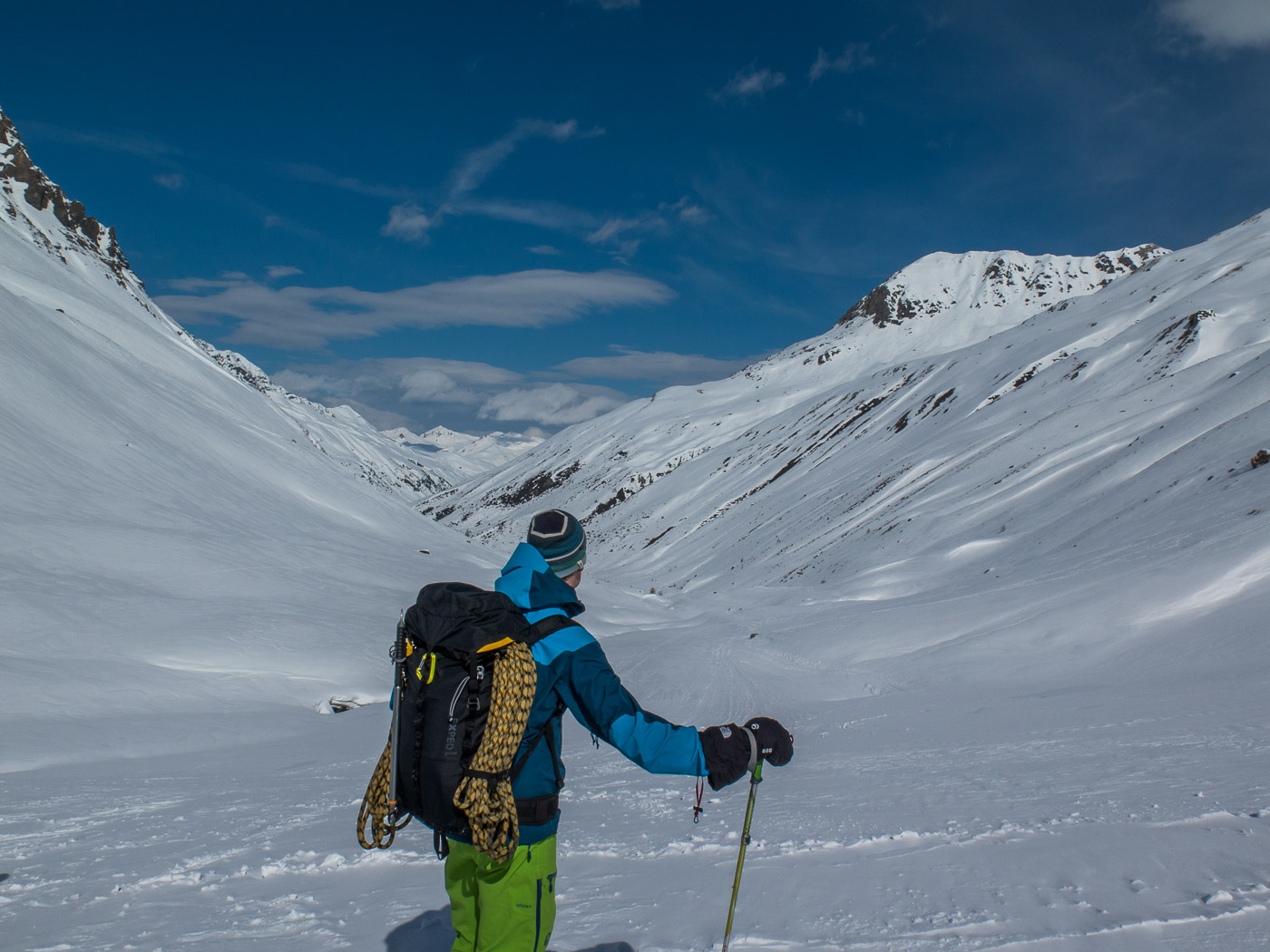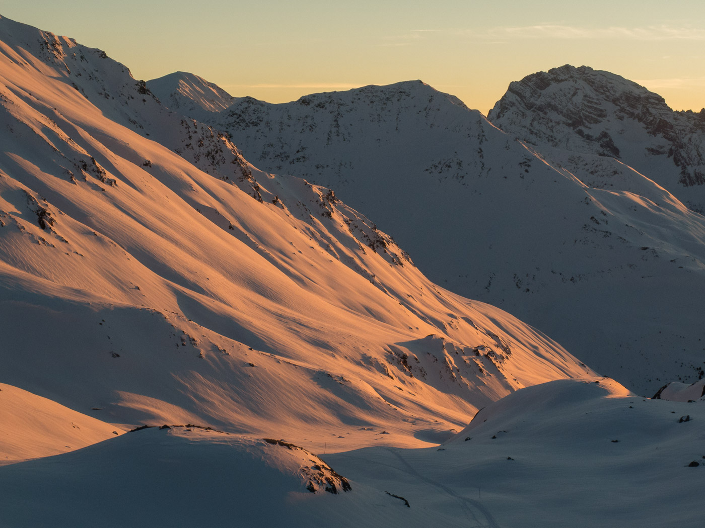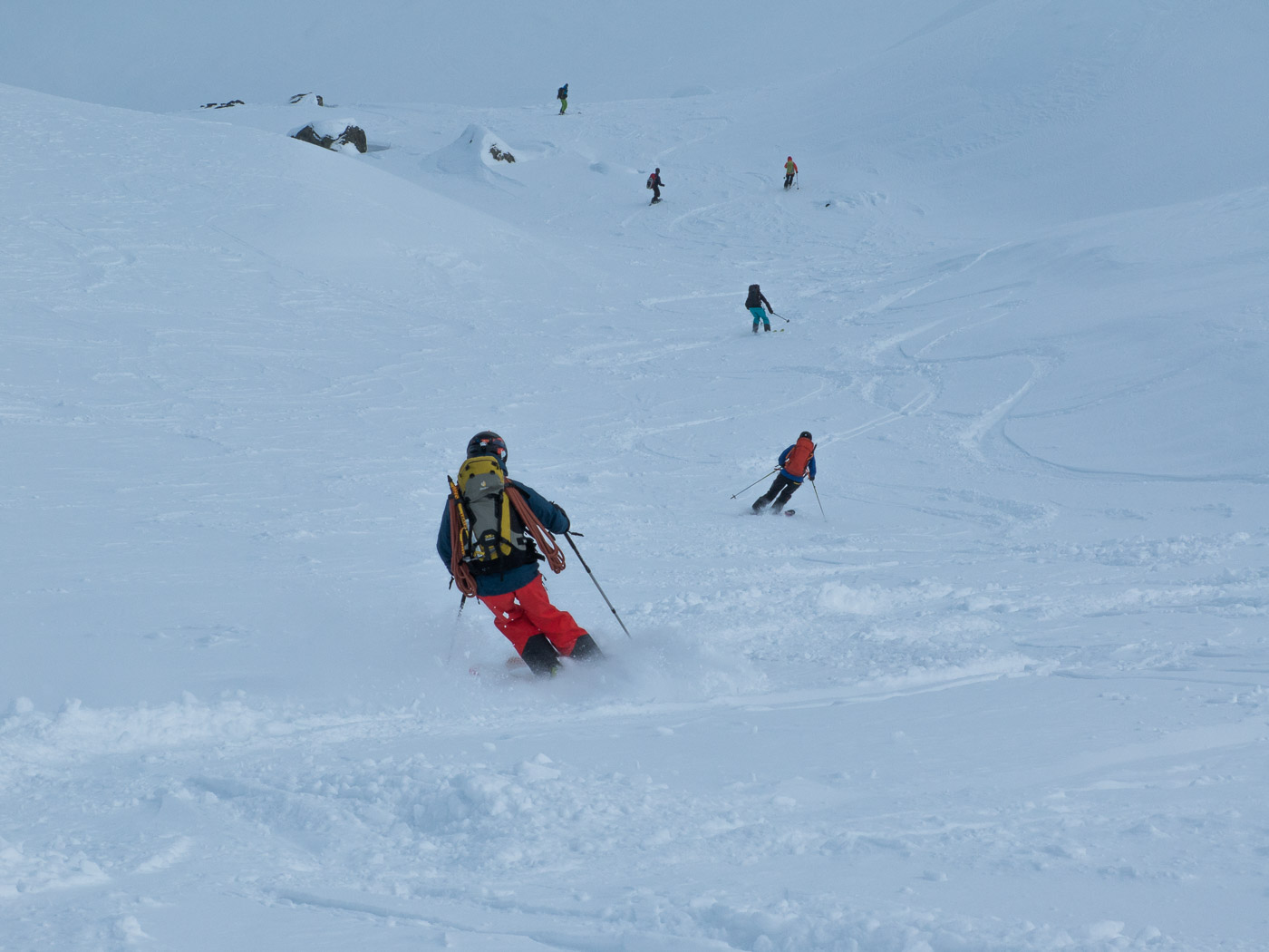 Unterhalb des Gletschers legen wir mal einen Halt ein, der Kesch Pitschen steht zur Diskussion. Ich trage ja die alten Schuhe, damit macht das Fahren weniger Spass, da ich darin keinen rechten Halt habe. Ich beschliesse, alleine zur Hütte zurück zu kehren, die anderen besteigen den besagten Berg. Wir trennen uns, ich fahre Richtung Hütte ab. Nach einem schönen Pulverhang warte ich mal und horche. Ich höre – NICHTS! Absolut nichts. Die totale Stille! Da ist wieder so einer, ein magischer Moment.