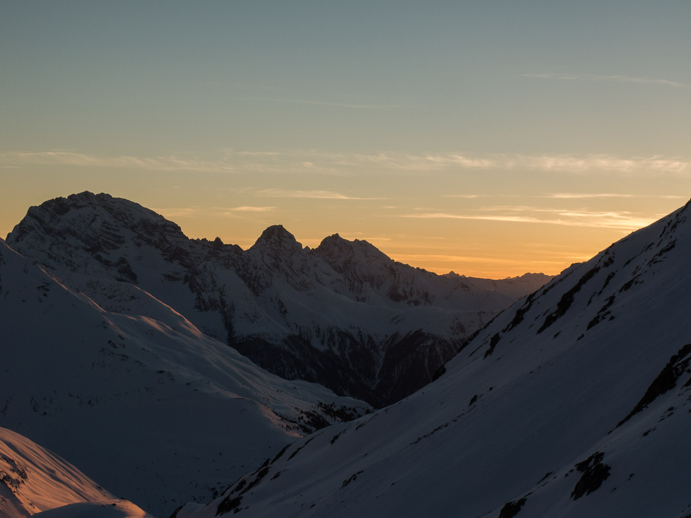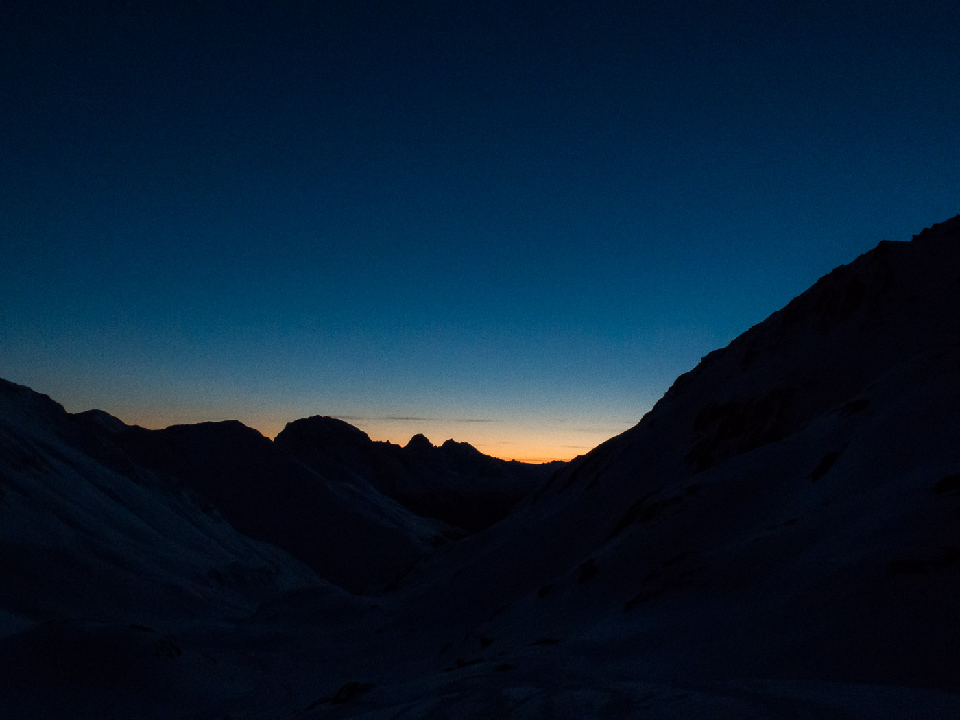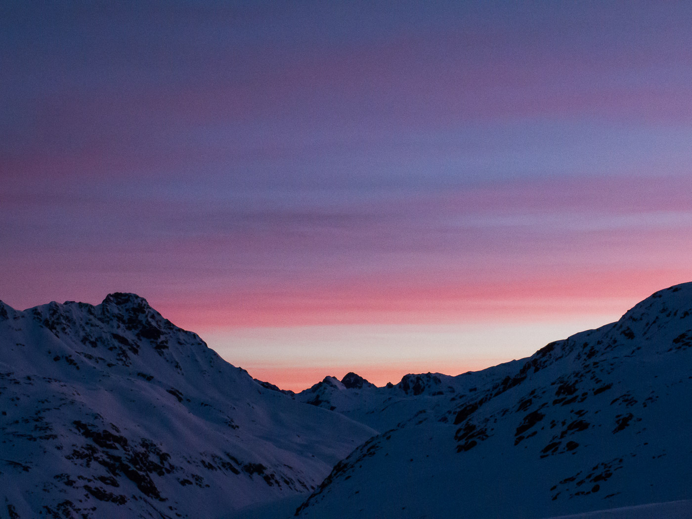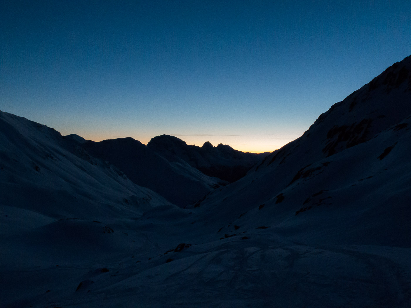 Im Titel steht ja was von magischen Momenten. Bis jetzt waren diese aber nicht wirklich magisch. Nun aber, mit der Dämmerung, brechen sie an. Die Abendsonne taucht die Berge in sanftes Licht, der Beginn der blauen Stunde.