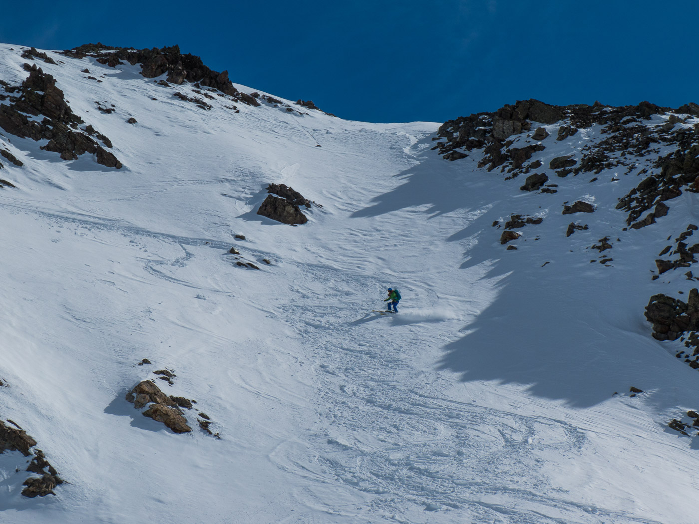 Geschafft! Ein grandioses Panorama liegt vor uns. Der Ortler steht breit und massig im Süden, rundherum eher unbekannte, aber nicht weniger schöne Gipfel. Nachdem wir uns satt gesehen haben, kehren wir wieder zum Skidepot zurück. Die beiden, die die Skis hochgetragen haben, sind bereits wieder unten. Na ja, lohnend sah die Abfahrt nicht aus. Nach einer längeren Rast suchen wir nun eine einfachere Abfahrt. Vom Depot her sollte es direkt hinunter gehen. Nach längerem Suchen finden wir dann eine gute Variante, wo der Schnee immerhin teilweise gut ist.
