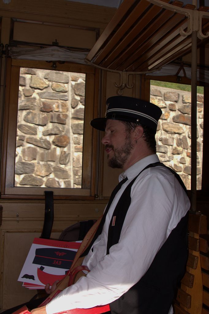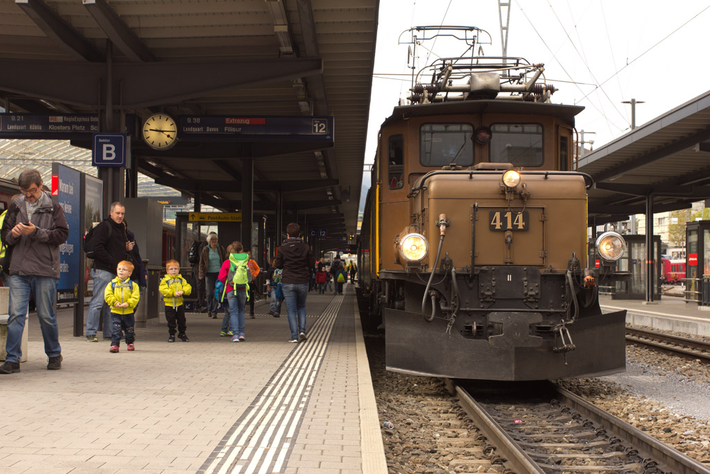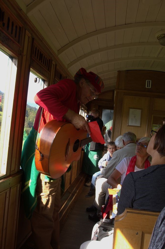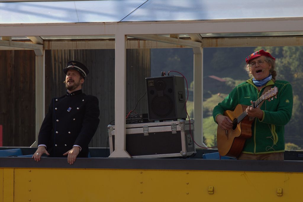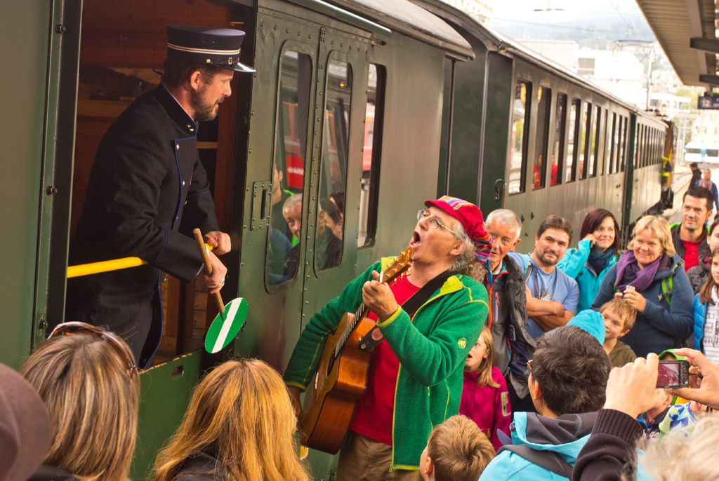 So erreichen wir pünktlich Gleis 12 in Chur, wo unser Extrazug parat steht. Und vorgespannt ist das legendäre RhB-Krokodil. Mir wird ob so viel Nostalgie gleich warm ums Herz. Und da kommt auch schon Linard Bardill daher, der Kinderbarde. Schon scharen sich die Kinder um ihn, die Mamis und Papis ebenso. Er sorgt gleich für gute Stimmung, die Kinder sind voll dabei. Und sollen nun Clà Ferrovia heraussingen. Clà Ferrovia ist der Kinder-Kondukteur bei der RhB, und das nach eigenen Aussagen bereits seit 128 Jahren. Wie das möglich ist, verrät er den Kindern unterwegs. Lauthals singen sie, bis Clà die Schiebetüre des Eisenbahnwagens öffnet. Die Kinderaugen leuchten.