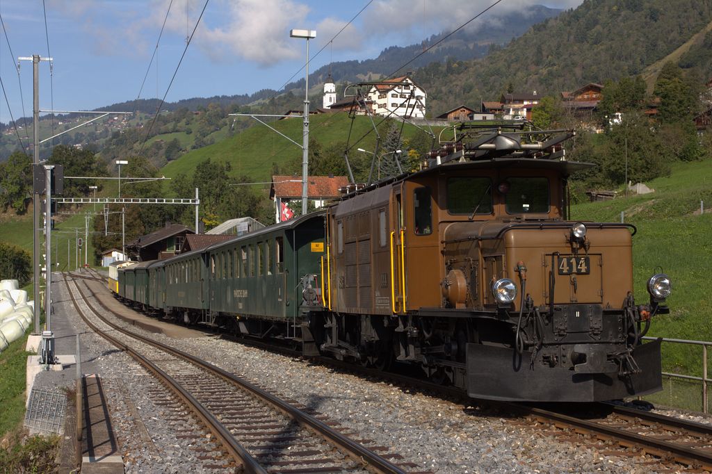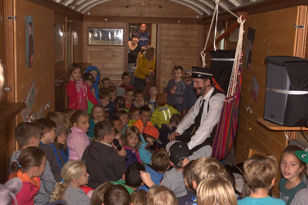 Gemeinsam singen sie das „Clà Ferrovia“-Lied. Anschliessend erklärt Clà etwas zum bevorstehenden Ausflug, ohne allzu viel zu verraten. Schliesslich wird es Zeit für die Abfahrt. Die „Kurzen“ steigen in den Geschichtenwagen ein, die „Langen“ verteilen sich in die übrigen Wagen. Zum Teil stammt das Rollmaterial aus den Siebziger Jahren des 19. Jahrhunderts! Endlich haben alle einen Platz gefunden, das Krokodil beginnt zu schnaufen. Gemütlich zuckeln wir durch die Landschaft des Churer Rheintals, es holpert und schüttelt, dass man fast Angst kriegt, die Wagen würden von den Schienen springen.