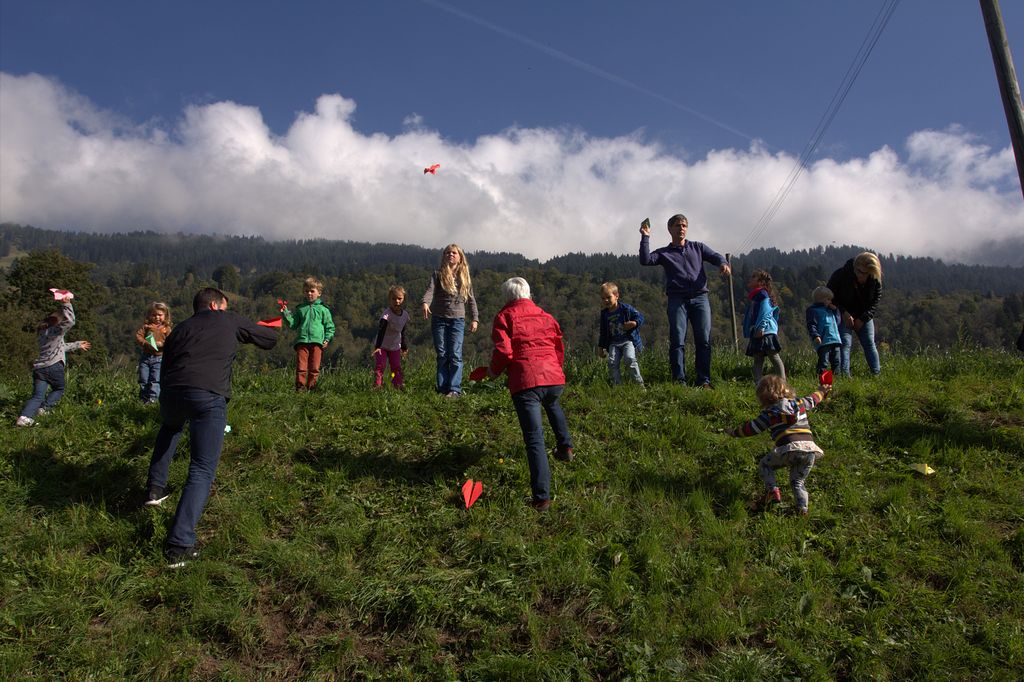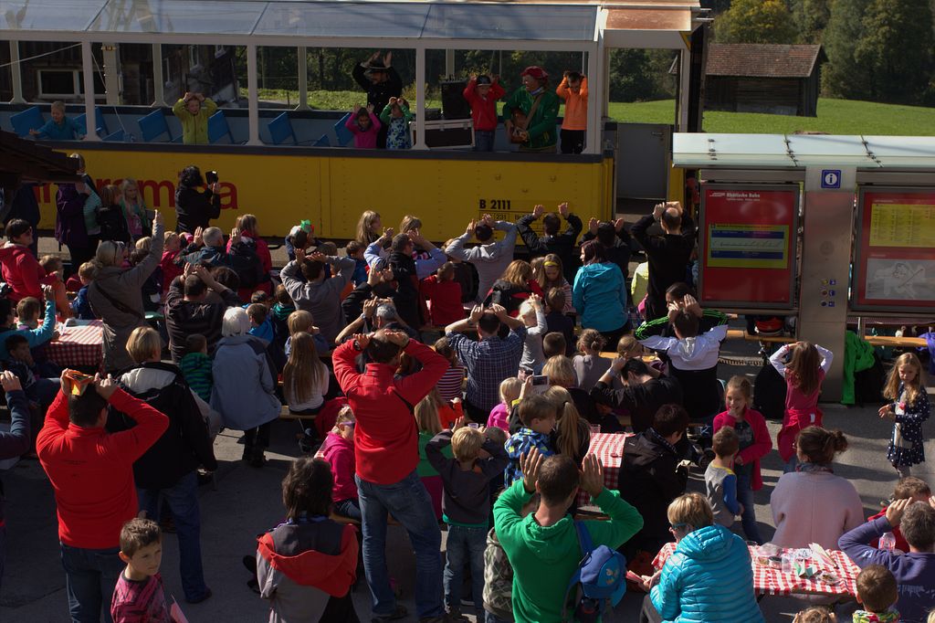 Der Zug fährt in Saas ein. Am Bahnhof stehen Tische und Bänke parat, hinter Tresen wartet das Personal auf die Gäste. Und alles ist für uns aufgebaut! Süssmost, Wasser und Sauser findet reissenden Absatz, ebenfalls das feine Birnenbrot. Die Kinder können nun die Flieger ausprobieren, die die Väter, Mütter, Grossväter, Gottis und wer auch immer gefaltet haben. Man geniesst die Sonne, die Getränke, das Birnenbrot. Clà und Linard unterhalten die Menge mit Liedern, animieren sie zum Mitmachen.