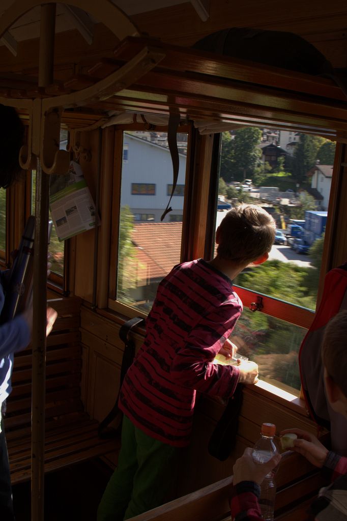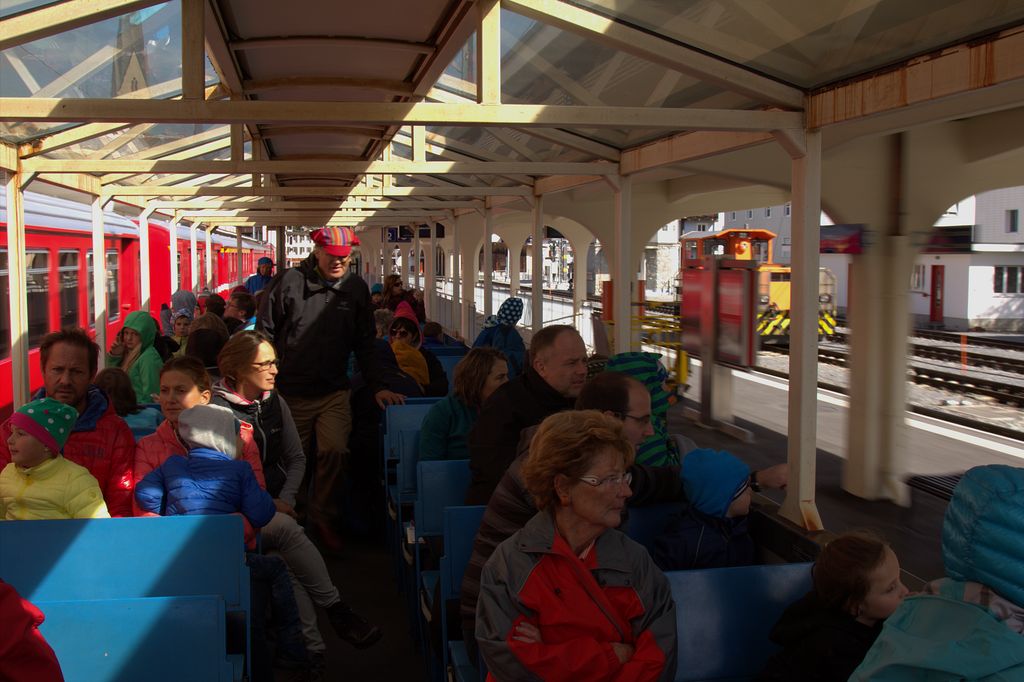 Die Stunde vergeht wie im Fluge, wir steigen wieder ein, das alte Krokodil setzt sich in Bewegung und schnauft über Klosters dem Wolfgangpass entgegen. Es ruckelt und rattert, wir geniessen die Aussicht. Es folgt der Davosersee, die verschiedenen Davos wie Dorf, Platz, Frauenkirch und so weiter.