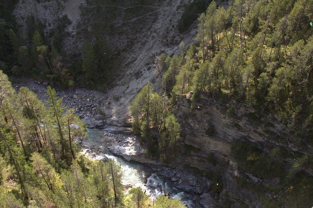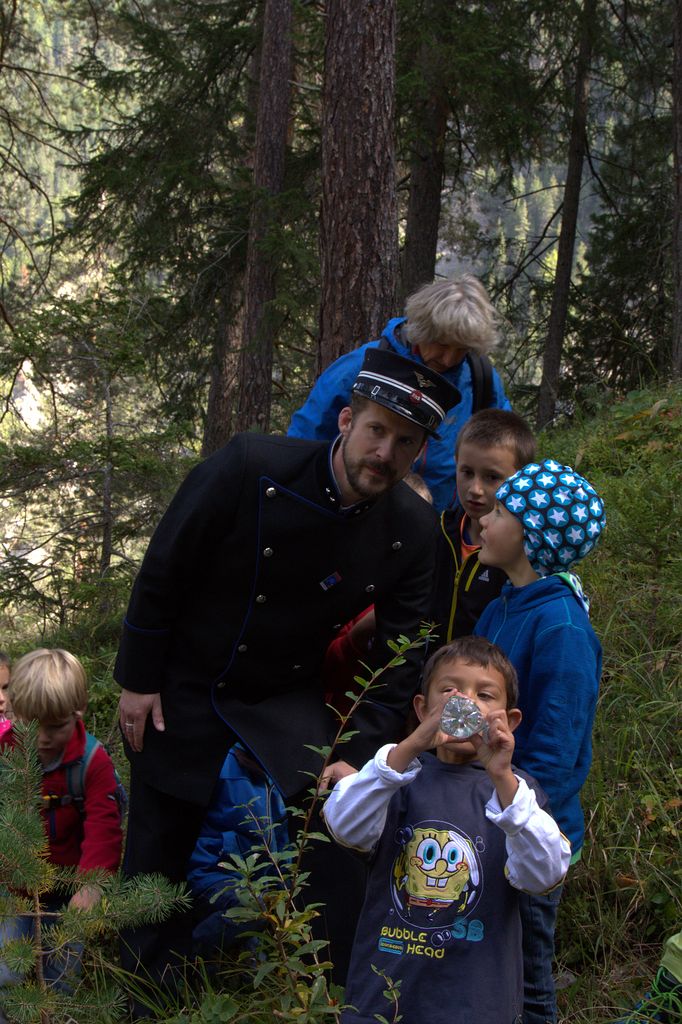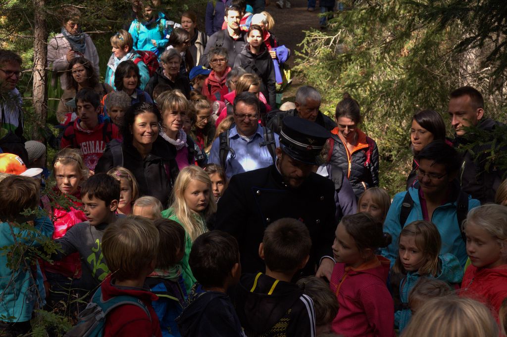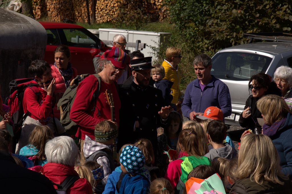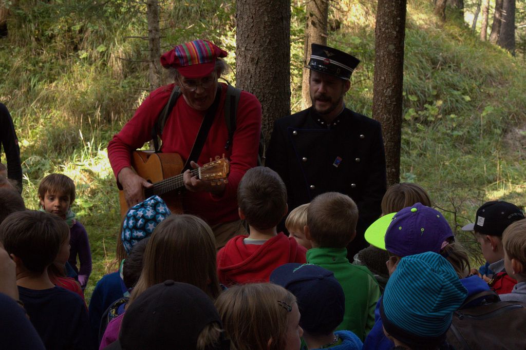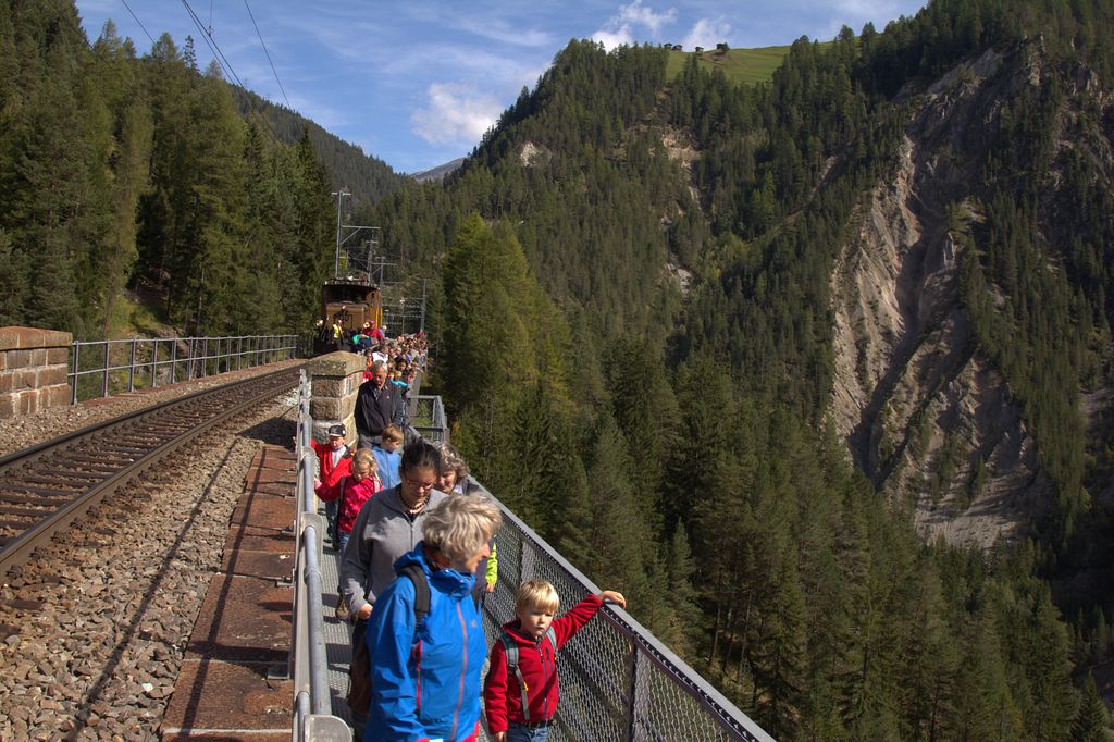 Bei Wiesen hält der Zug. Alles aussteigen! Die ganze Gesellschaft folgt nun Clà und Linard, die singend vorangehen. Wir gehen dem Gleis entlang, das – auf den Wiesener Viadukt führt! Parallel zum Geleise gibt es einen Fussgängersteg. Je weiter wir gehen, desto tiefer geht es runter. Die Landwasser fliesst 88.9 Meter tiefer unten durch. Welch ein Tiefblick! Dieser ist aber nicht allen geheuer, einige kehren um, andere schleichen dem inneren Geländer entlang und klammern sich daran fest. Die Kinder sind da weniger empfindlich. Und auf Kommando fliegen Dutzende von Papierflieger durch die Luft und verteilen sich im Tobel. Der Grund dafür? Finde den selber raus und nimm mal mit deiner Tochter, deinem Sohn, deinem Gottimeitli, deinem Enkel teil auf einer Fahrt mit Clà Ferrovia. Wir wandern weiter durch den Wald, wo Gnome hausen sollen, Clà Ferrovia voraus, mit einem Kind an jeder Hand. Er ist der Star, pausenlos reden die Kleinen auf ihn ein, stellen Fragen, erzählen.