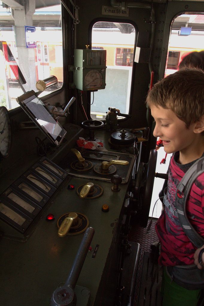 Wir wandern durch den Wald, an einer Verzweigung wird nochmals ein Lied gesungen, bis die letzten auch da sind. Dann hören wir das Krokodil pfeifen, wir steigen hinunter und ein. Weiter geht die Fahrt. Wir erreichen Filisur, fahren nach einer Pause weiter Richtung Thusis. Kurz nach Filisur wird es dunkel, wir sind in einem Tunnel. Als es hell wird, fährt der Zug direkt auf einem Viadukt. Wir sind auf dem berühmten Landwasserviadukt. Die Albula-Bahnstrecke, die 1904 eingeweiht wurde, ist eine technische Meisterleistung. Wer noch mehr darüber erfahren möchte, sollte das Albula-Bahnmuseum in Bergün besuchen, einen Bericht findest du hier. Clà Ferrovia verteilt Bastelbogen und andere Geschenke. Zwischendurch kommt Hektik auf im Zug, der Zugchef eilt mit einer Verbandsbüchse hin und her, ein Kind hat sich mit der Schere geschnitten. Dann wird ein Vater gesucht, Leute eilen hin und her, Türe auf, Türe zu. In Chur hat sich alles wieder beruhigt, mit einem Lied wird Clà Ferrovia verabschiedet. Und wir dürfen noch einen Blick in den Führerstand des Krokodils. Und wieder fasziniert mich diese Technik. Einzig das iPad will nicht so recht zum nostalgischen Bild passen. Das ist aber wohl ein Zugeständnis an die modernen Sicherheitsanforderungen.