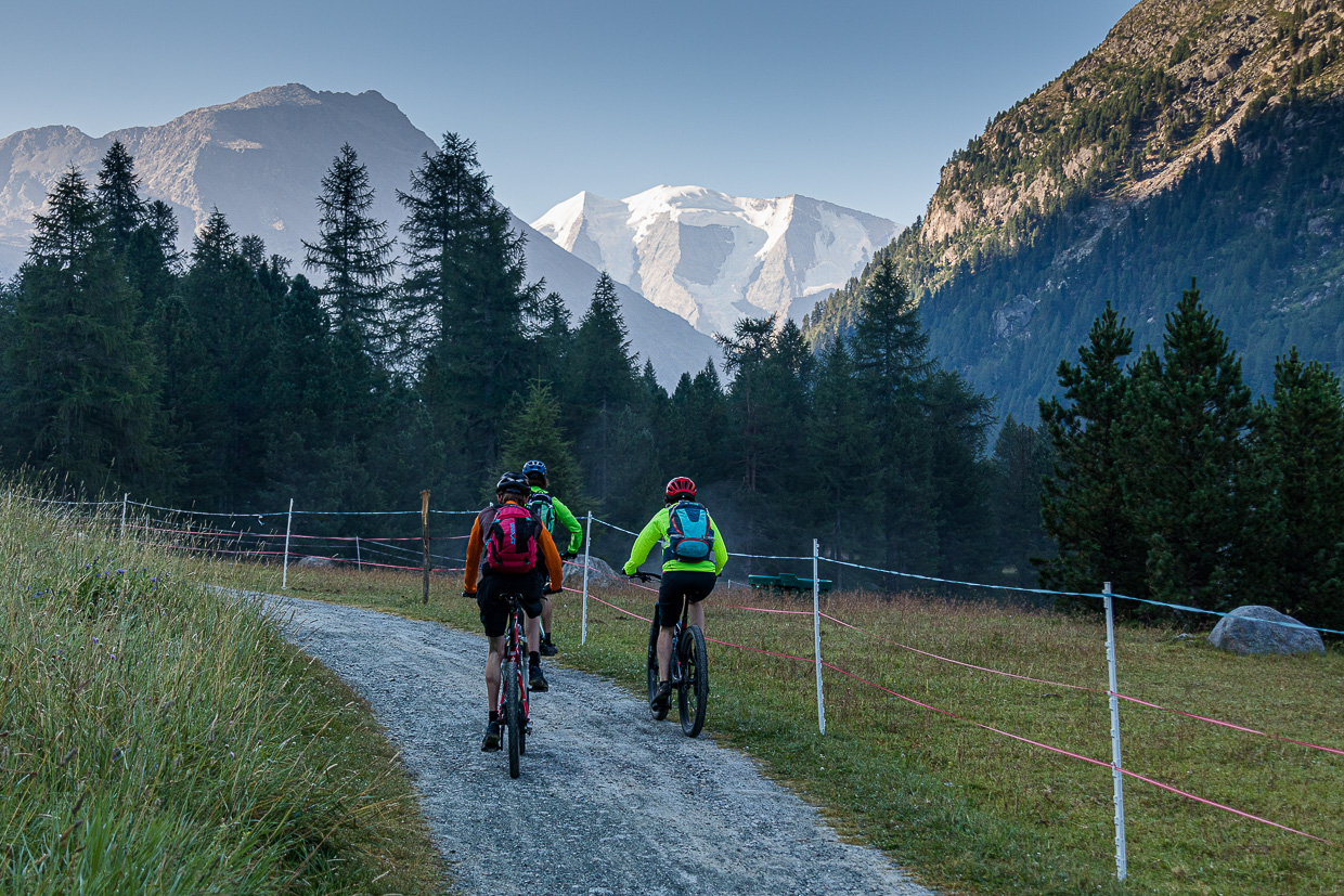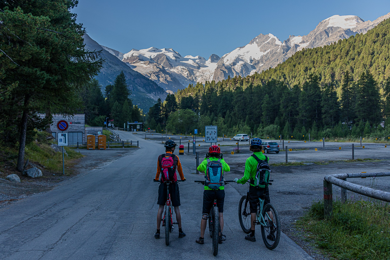 Auch wenn wir in Pontresina auf 1800 Meter sind, es lohnt sich, früh zu starten. Um 20 nach sieben fahren wir los durchs Dorf, wechseln bei bester Gelegenheit auf die andere Seite des Berninabaches. Noch ist die Strecke gemütlich, erst nach dem Zeltplatz in Morteratsch steigt der Weg an, so dass wir zum Teil schieben müssen. Vorher aber bestaunen wir die Eisriesen, die in den nächsten Jahrzehnten keine mehr sein werden, so schnell und unaufhaltsam schmilzt das „ewige“ Eis.