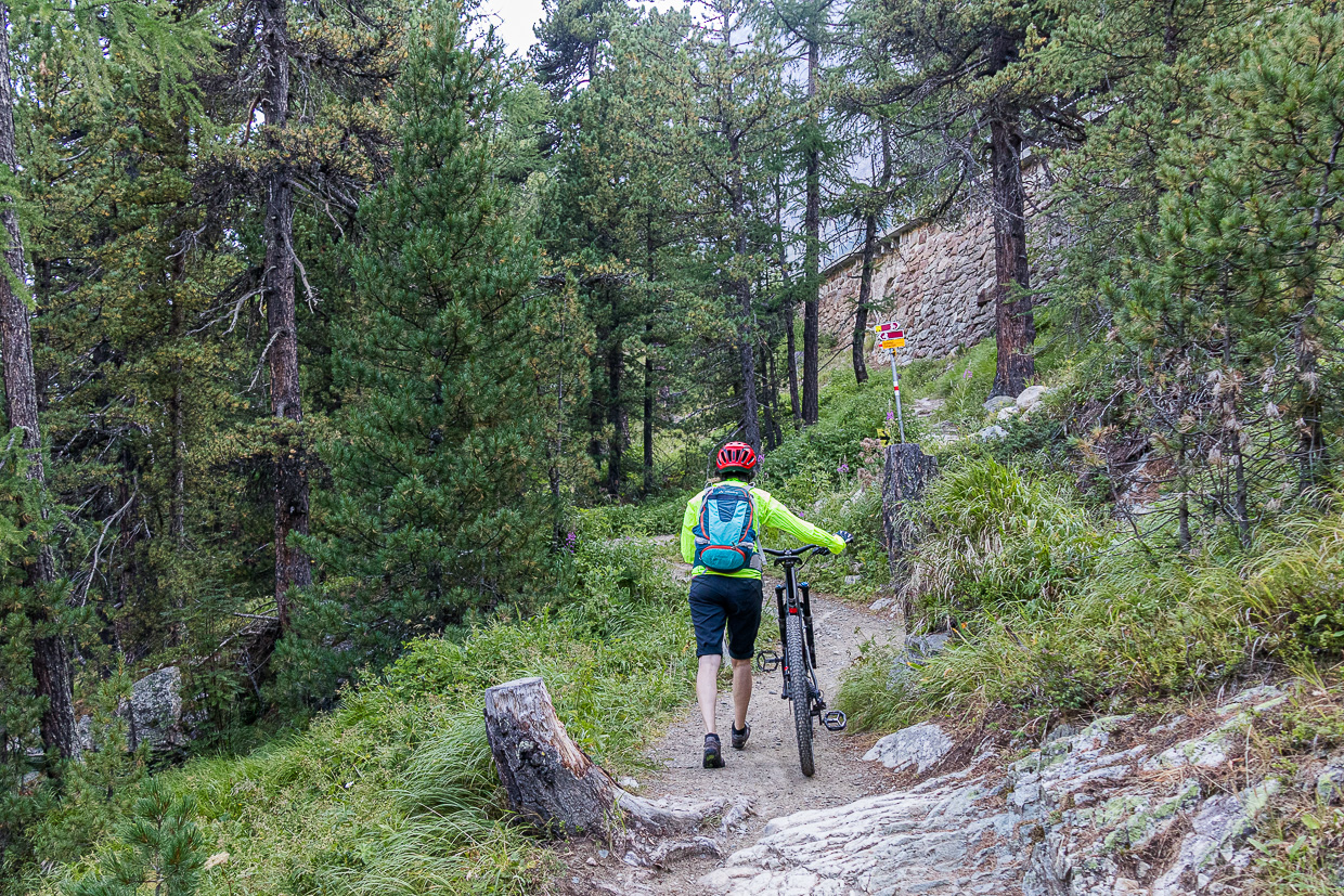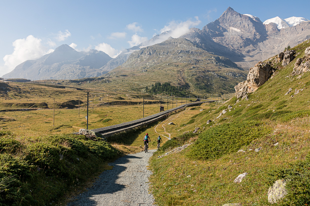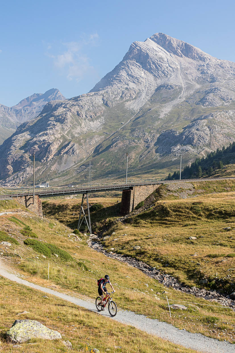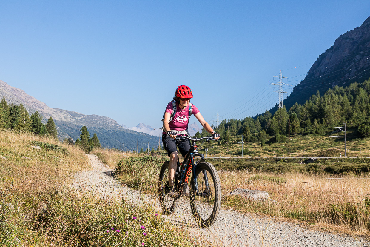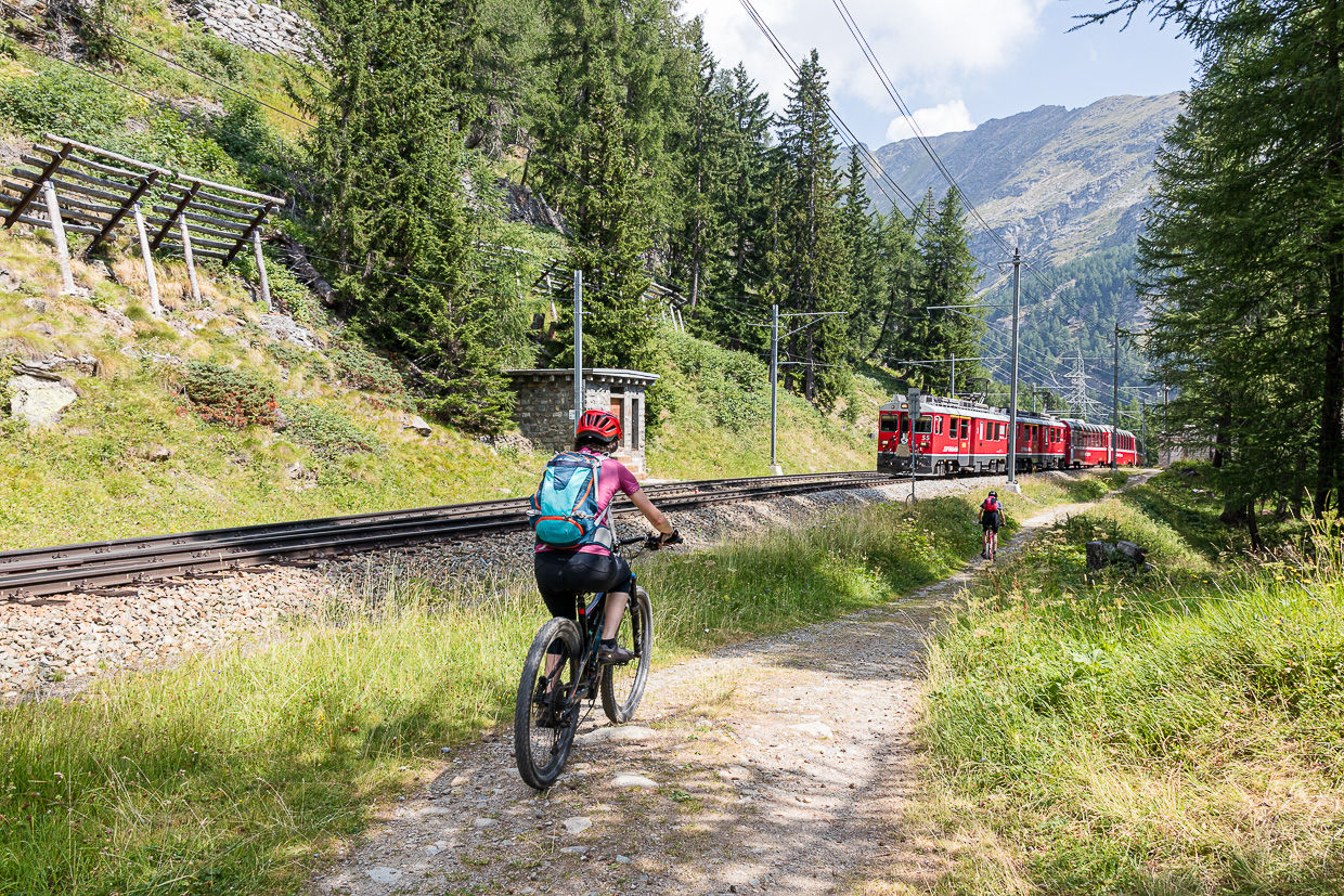 Der Bernina-Express ist eine sehr abwechslungsreiche Biketour vom alpinen Gelände bis hinunter in den Süden. Auf Schweiz Mobil ist es die Route 673. Man sollte schon vertraut sein mit Singletrails, „eMTB-sind-hipp-wir-sind-schon-lange-nicht-mehr-velo-gefahren-aber-mieten-wir-welche-und-probieren-da-mal“-Leute haben hier nichts verloren.