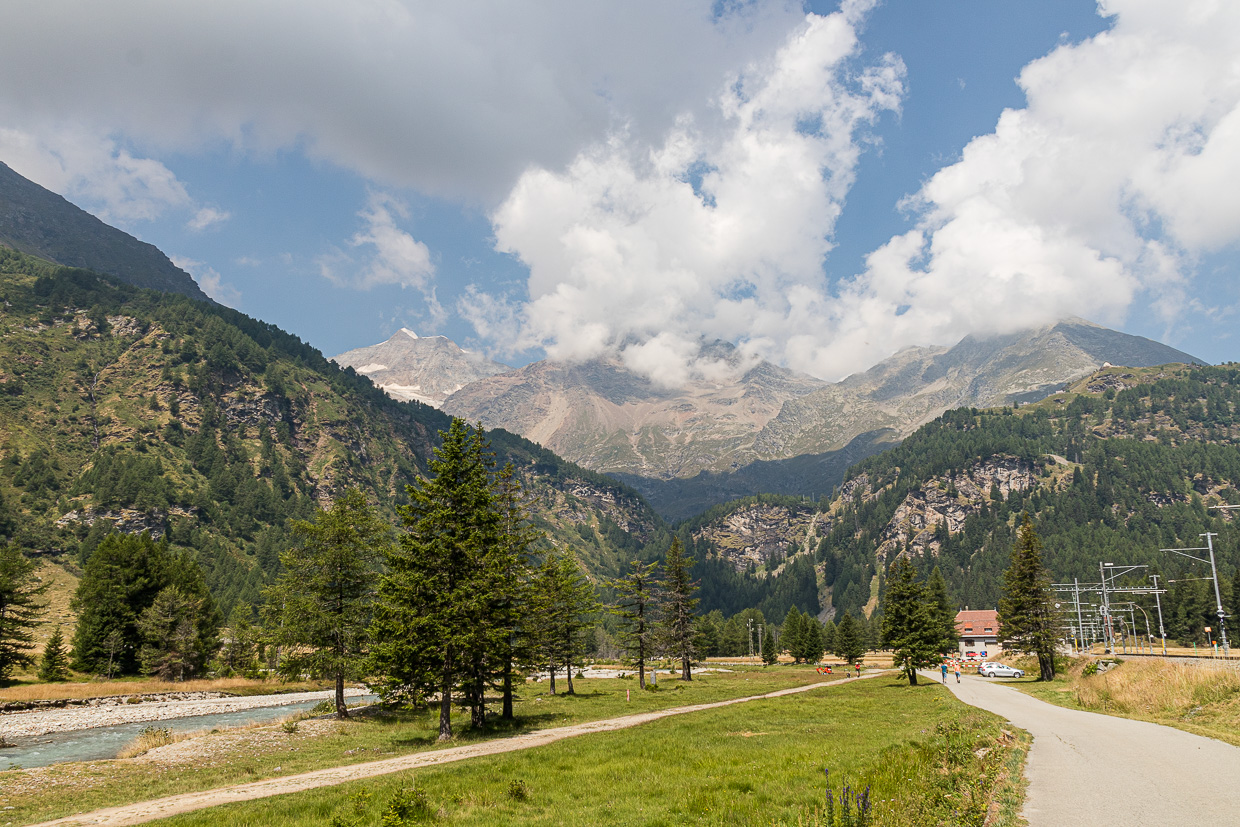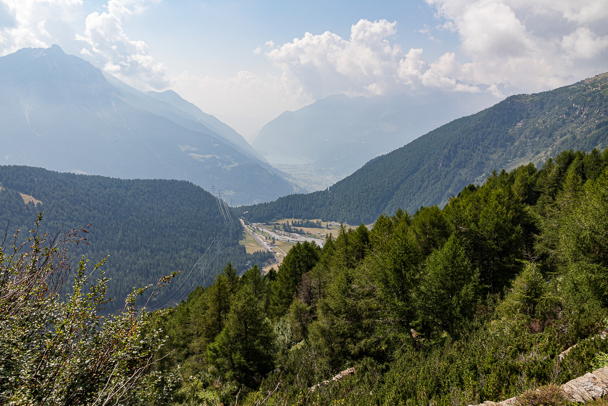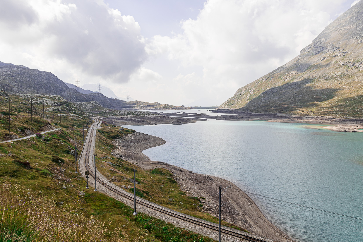 Bei der Haltestelle ‚Ospizio Bernina‘ geht der Weg in eine Strasse über. Der See hat wenig Wasser, überall ragen Felsen heraus. Am Ende des Sees erblicken wir erstmals das Puschlav. Von nun an geht es hauptsächlich abwärts.