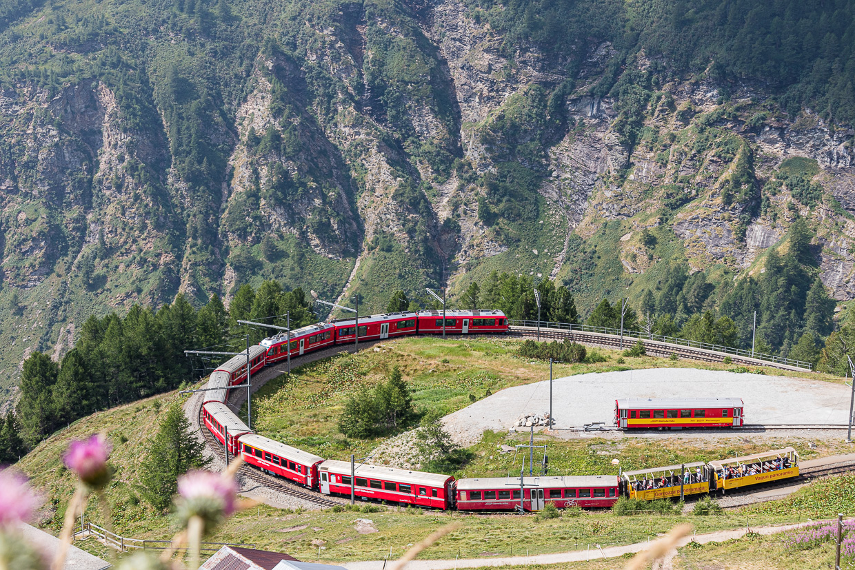 Und weiter sieht man von hier die berühmte Alp Grüm mit der 180-Grad-Kurve. Klar, dass man da auf einen der roten Züge wartet und ein Foto schiesst. Nach der Stärkung fahren wir zum Bahnhof hinunter, dann weiter einen steilen Weg hinunter. Hier trennt sich zum ersten Mal die Spreu vom Weizen.