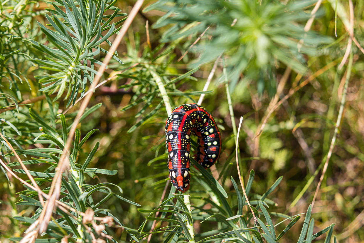Rechterhand sehen wir den Palügletscher, oder das, was noch übrig ist von ihm. Weiter geht die Fahrt hinunter nach Cavaglia, die Ebene lässt uns vorerst mal ausruhen. Danach geht es aber wieder abwärts, mal schön flowig, mal ruppig, aber immer fahrbar. Jedenfalls ist die Strecke sehr abwechslungsreich. Zwischendurch verschnaufen wir, was Silvan gleich dazu nutzt, den Wegrand zu inspizieren. Prompt entdeckt er Raupen des Wolfsmilchschwärmers. Sie sind sehr auffällig gefärbt, sie wollen damit sagen: „Friss mich nicht, ich bin giftig!“ Das rührt daher, dass sie sich hauptsächlich von Zypressenwolfsmilch ernähren, die ihrerseits giftig ist.