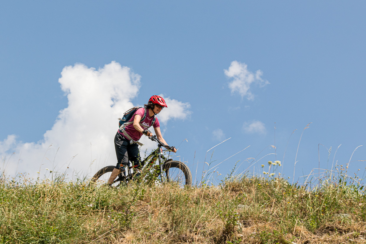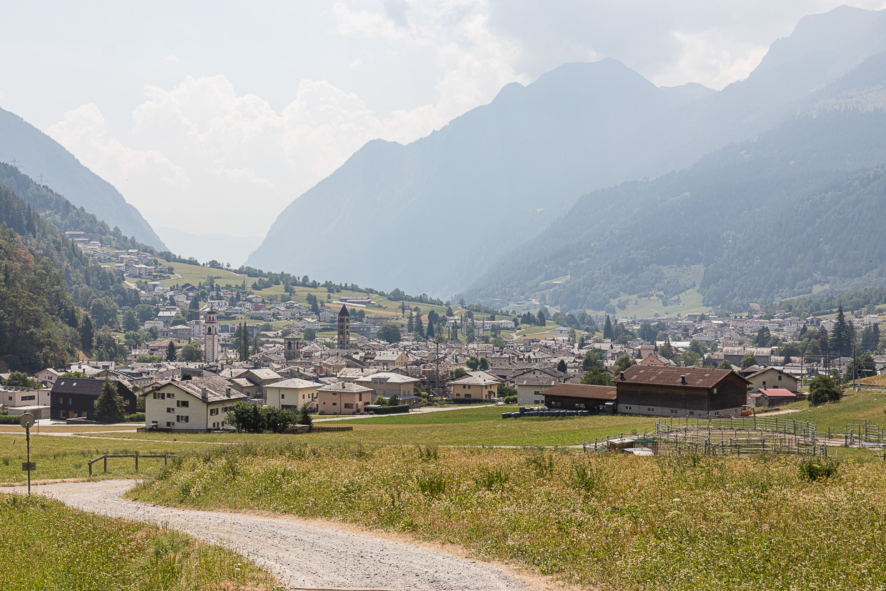 Weiter geht die Fahrt, Fabian weit voraus, wir hintendrein, irgendwann. Netterweise wartet er ab und zu auf uns. Es wird immer wärmer, je weiter wir nach unten kommen. Der letzte Singletrail, dann erreichen wir eine Strasse. Gemütlich rollen wir nach Poschiavo, wo es schon unangenehm warm ist, obwohl der Ort auf rund 1000 Meter liegt. „Das war eine schön flowige Tour!“, meint Fabian. Na ja, flowig stelle ich mir anders vor, aber Spass hat es gemacht.