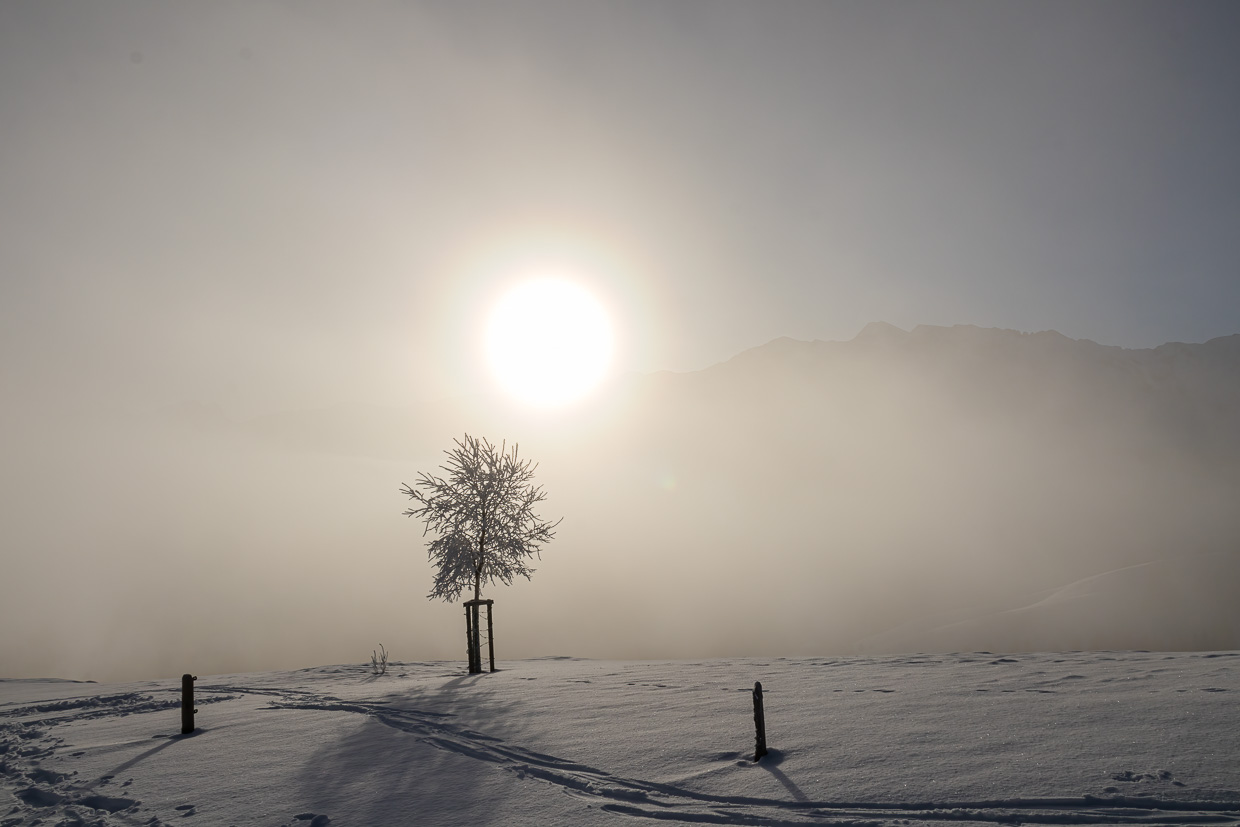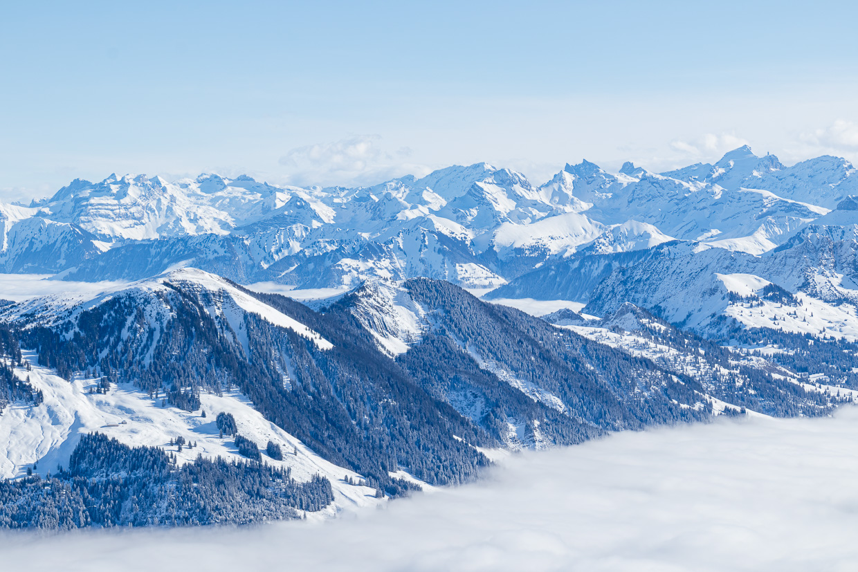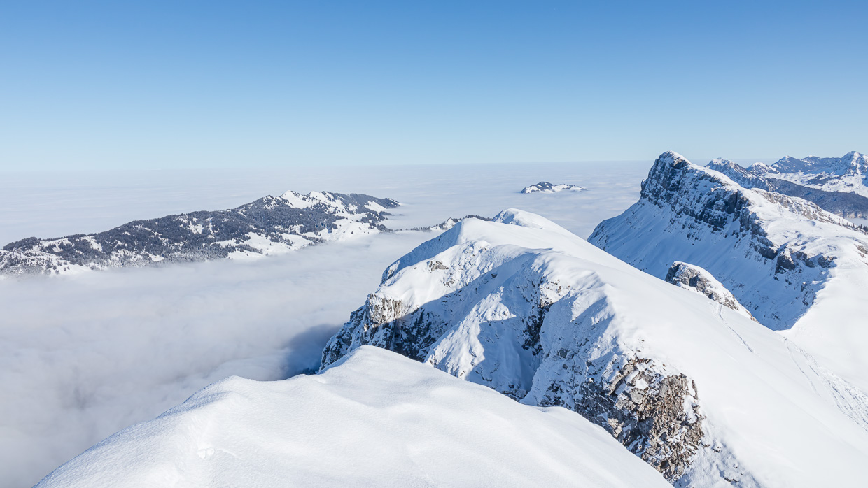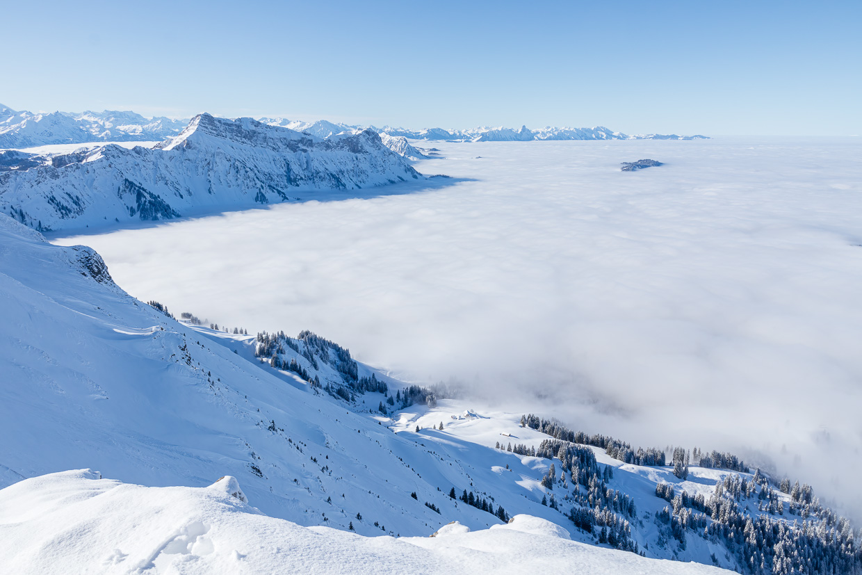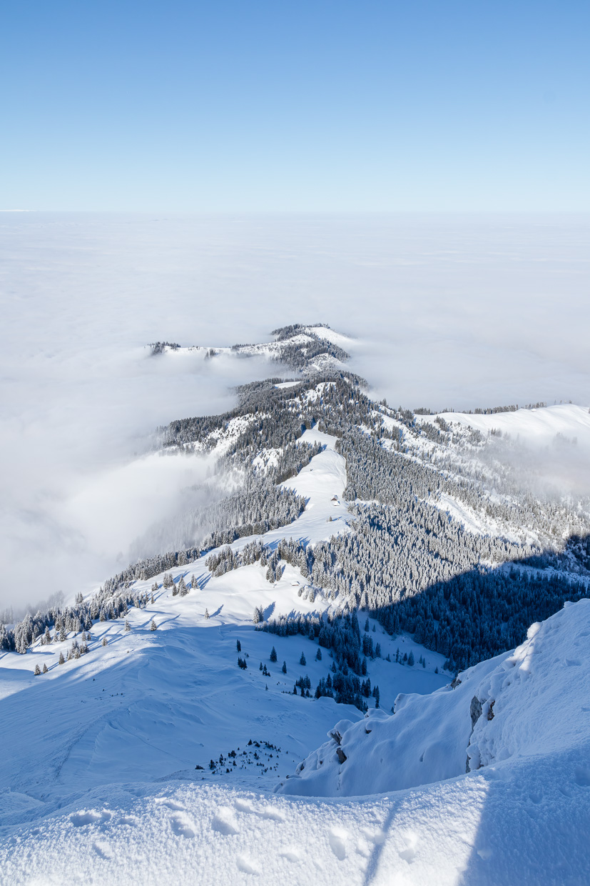 Nach dieser geht es durch einen Wald, der Spur folgend. Interessant ist, dass, wenn jemand eine schlechte Spur hingelegt hat, alle anderen dieser Spur folgen, egal, wie schlecht sie ist. Niemand versucht, eine bessere Spur zu legen. Auch wir korrigieren nur unwesentlich, da Fabian vorauseilt. Früher gingen wir schön gemütlich, damit die Kinder folgen können, heute müssen wir schauen, dass wir Fabian nicht aus den Augen verlieren. Über der Waldgrenze ist das einfacher, insbesondere bei dem sonnigen Wetter, das wir geniessen. Das können offensichtlich nicht alle, über Sörenberg liegt eine dicke Nebeldecke. Bald erreichen wir den Gipfel, von wo wir nun ins Mittelland schauen können. Schauen könnten, denn dieses liegt natürlich erst recht unter dem Nebel. Wir lassen den Blick weit schweifen, bis wir wieder eine Erhebung sehen. Im Nordwesten den Feldberg, im Westen den Jura. Die Alpen sind da schon besser bedient, hunderte Gipfel steigen aus dem Nebel empor. Es ist jedenfalls schön.