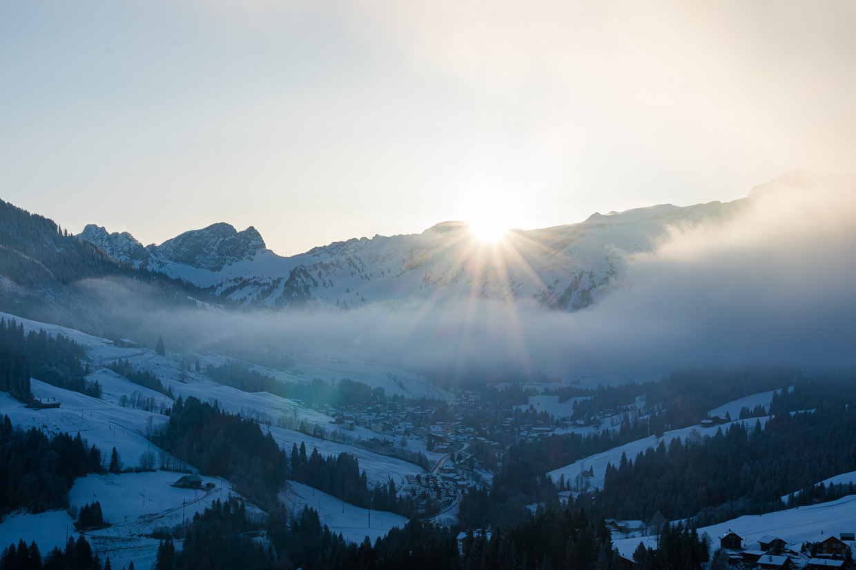 So fährt uns Fabian also an diesem Samstagmorgen Richtung Sörenberg zum Startpunkt der Tour. Nicht mal um die Anreise müssen wir uns noch kümmern! Nur ab und zu sagen, wo es langgeht, da er zwar gut Auto fährt, aber die Wege noch nicht kennt. Je näher wir Sörenberg kommen, desto höher sind wir natürlich. Aber selbst in Flühli noch keine Spur von Schnee weit und breit. So langsam sollte der schon kommen. Noch vor Sonnenaufgang erreichen wir den Ausgangspunkt. Und hier hat es endlich auch Schnee, gerade genug. Wir starten also, wie einige andere auch noch. Auf der ersten Alp kommt die Sonne hervor.