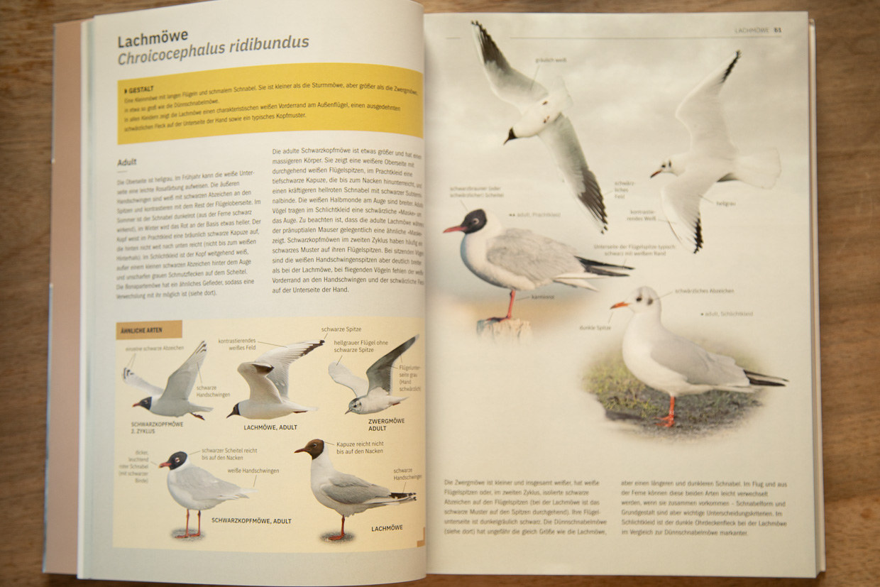 Die Lachmöwe hat eine dunkelbraune Kapuze, die nicht bis in den Nacken reicht, im Gegensatz zur Schwarzkopfmöwe. Dies wird auch gleich in Vergleichsbildern veranschaulicht. Das Buch arbeitet mit Fotos, nicht mit Zeichnungen wie andere Bestimmungsbücher.