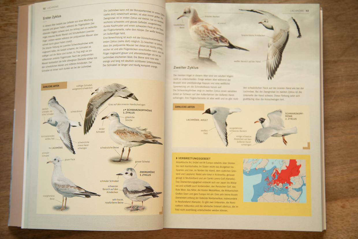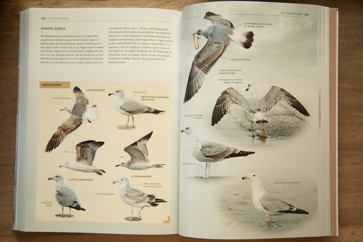 Dieses Buch wendet sich, anders als das letzte, das ich vorgestellt habe, an eingefleischte Ornithologen, also Möwen für Nerds. Wer sich nur schon ein bisschen auskennt und eine Lachmöwe von einer Mittelmeermöwe unterscheiden kann, weiss, wie schwierig die Unterscheidung der Vögel in den verschiedenen Mauserstadien ist.