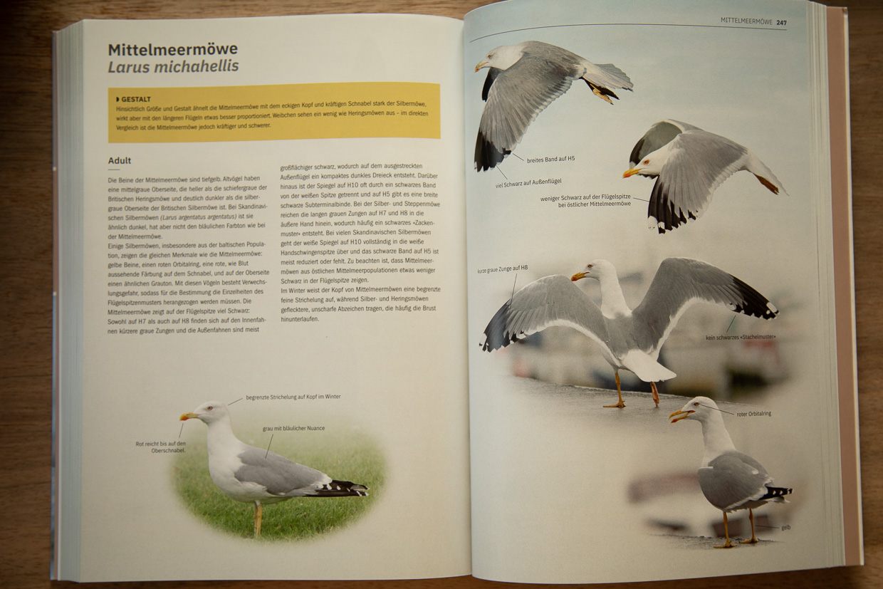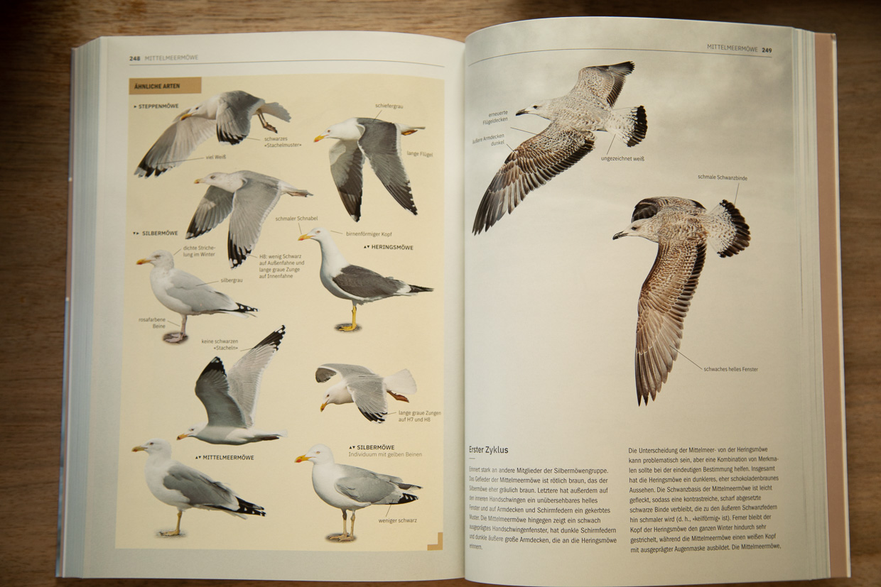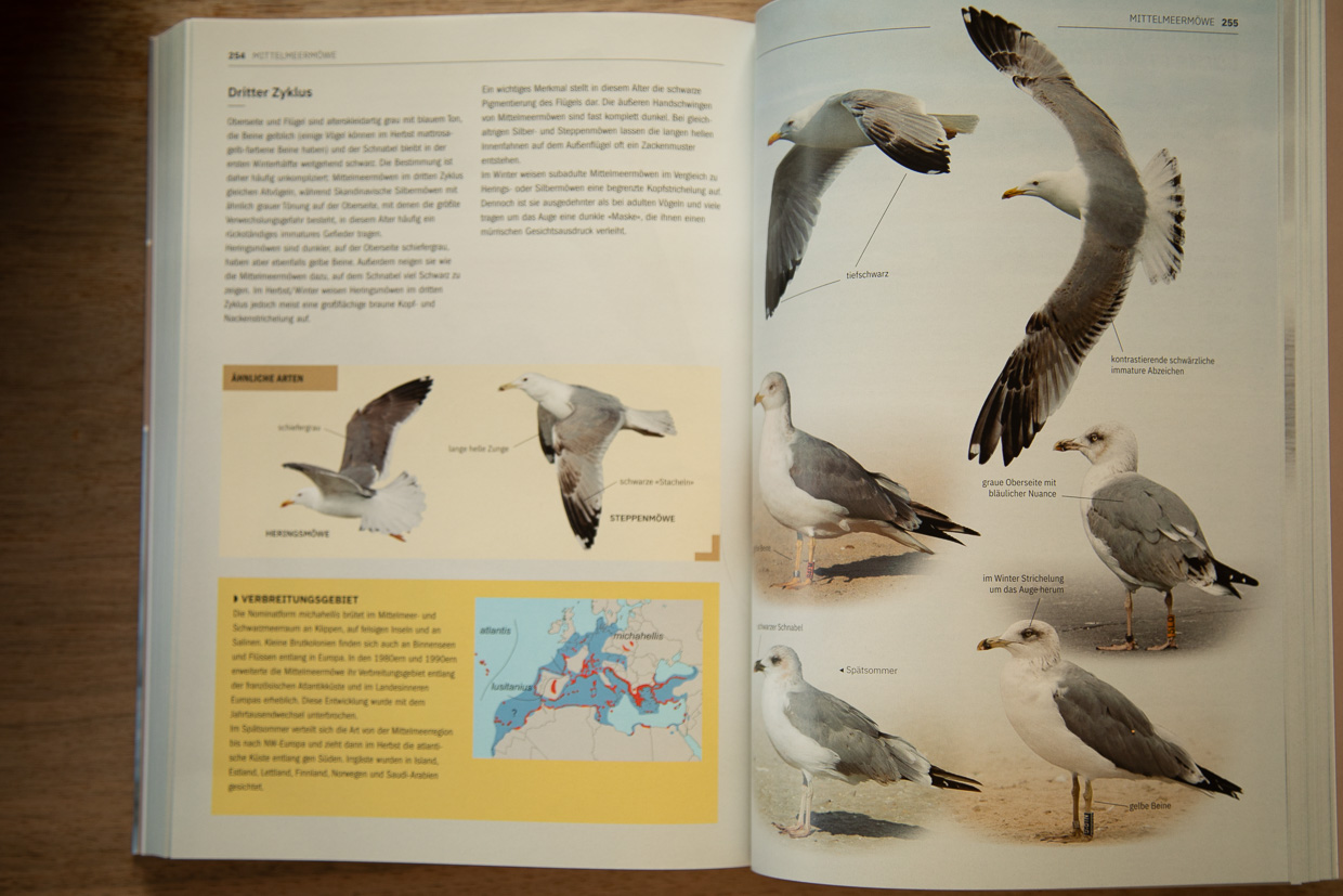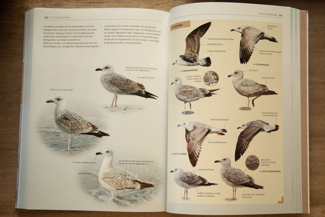 Da die Mittelmeermöwe drei Mauserzyklen durchmacht und dabei viele Merkmale wichtig sind, gibt es dazu gleich sechs Seiten.