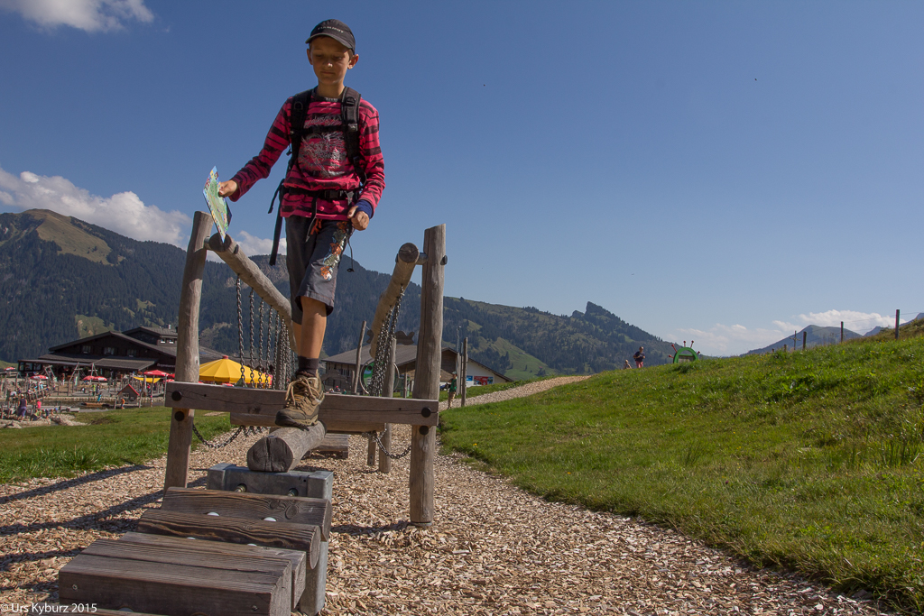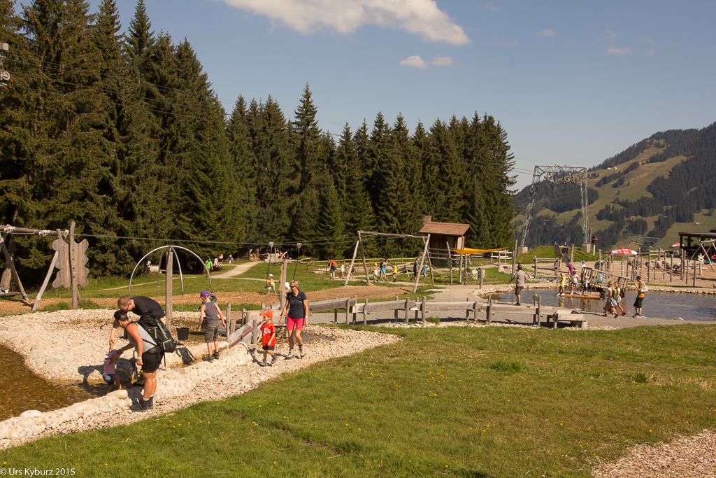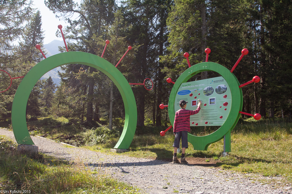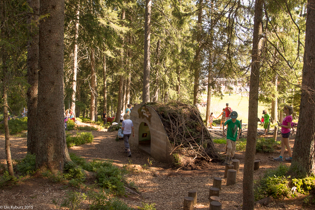 Was machen? Ich las etwas von einem „Mooraculum„. Das würde doch zum Thema passen. Wir lösten also die Billette und fuhren in der Gondelbahn zur Rossweid hoch. Dies scheint kein Geheimtipp zu sein, unzählige Familien bevölkerten die Umgebung der Bergstation. Geradeaus erblickten wir das Tor zum Mooraculum.