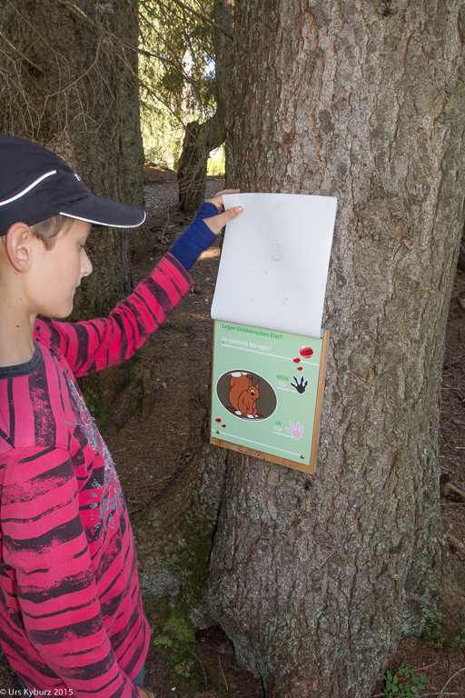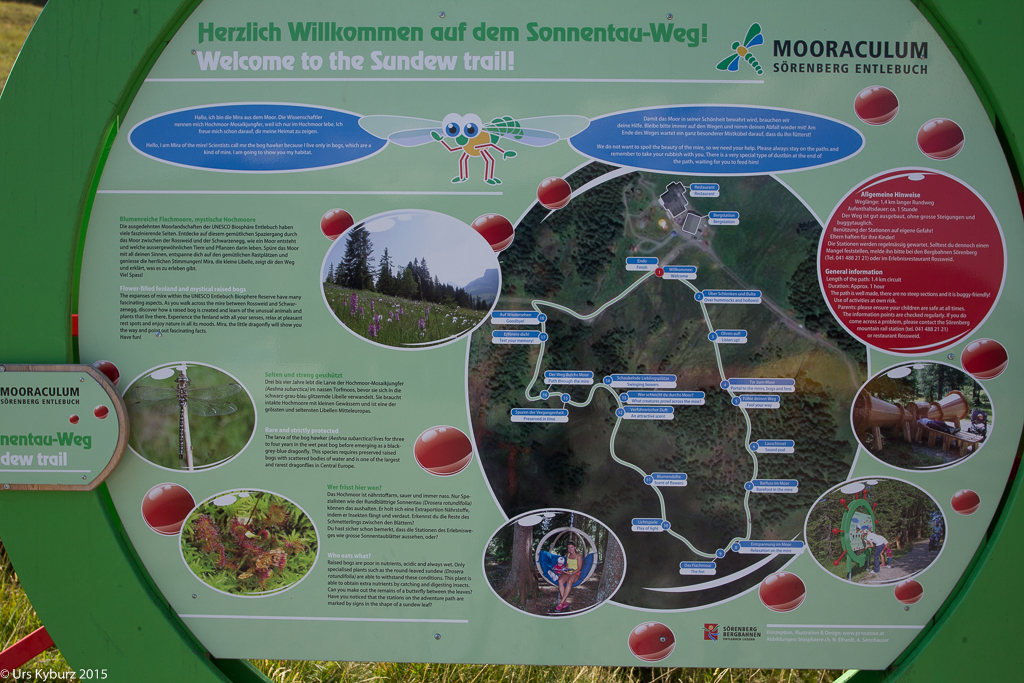 Für die älteren Kinder und die Erwachsenen folgt die Fortsetzung auf dem Sonnentauweg, der kinderwagentauglich ist. 17 Erlebnisstationen vermitteln auf interessante Art und Weise Wissenswertes über die Moore. Es werden hauptsächlich zwei Typen unterschieden: Die Flach- und die Hochmoore. Während Flachmoore laufend von Hang-, Grund- oder Quellwasser gespiesen werden, kriegen die Hochmoore ihre Feuchtigkeit nur durch nährstoffarmes Regenwasser. Entsprechend spezialisiert ist die Artengemeinschaft. Und woher kommt nun der Name des Weges? Der Sonnentau ist eine jener spezialisierten Pflanzen. Er holt sich zusätzliche Nährstoffe, indem er Insekten mittels Tropfen anlockt, die wie Tau aussehen, aber klebrig sind. Die Insekten bleiben daran haften und werden langsam verdaut.
