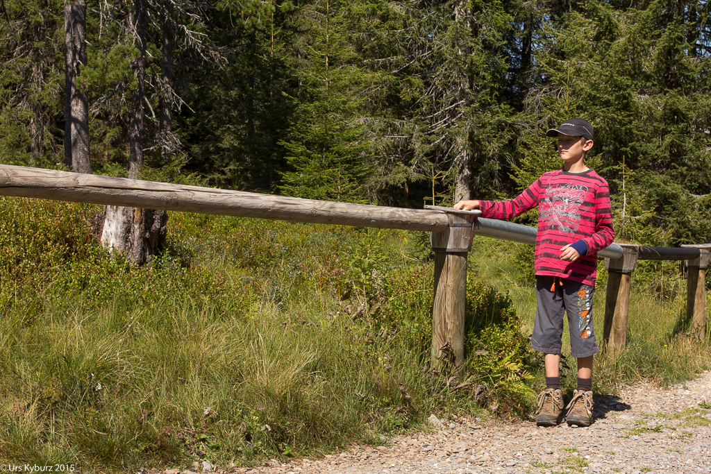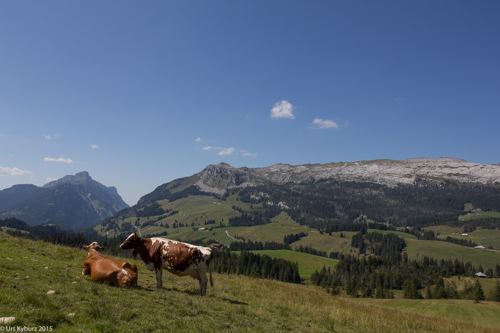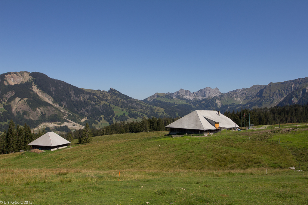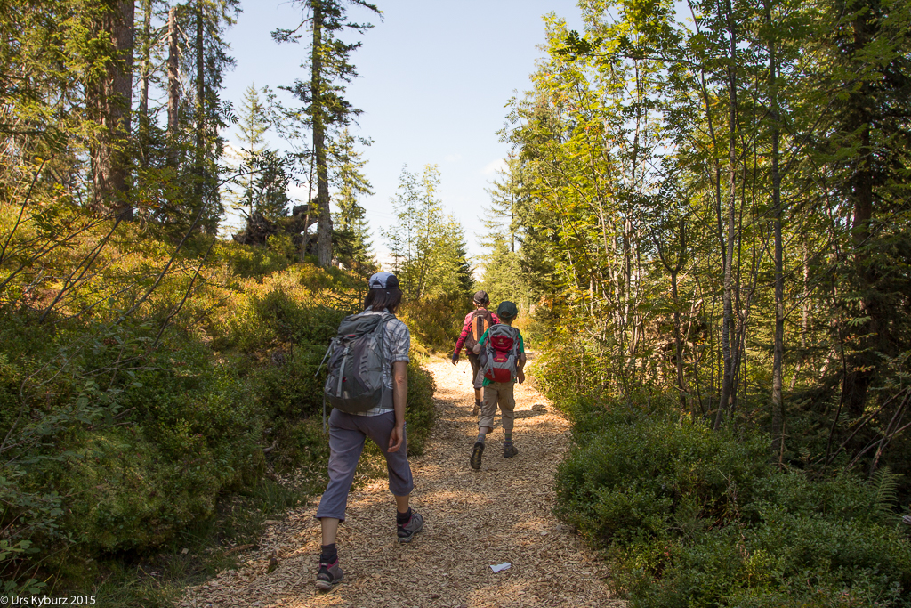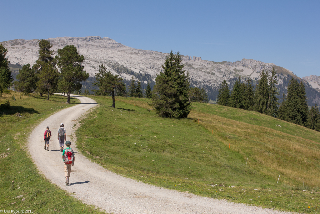 Mit vielen neuen Erkenntnissen trafen wir beim Mooraculum wieder auf den Rest der Familie, die uns gerade entgegen kommen wollte. Eine Wanderung wollte ich eigentlich schon noch machen. Wir konnten die Jungs überzeugen mit dem Ziel Restaurant Salwideli. So wanderten wir zuerst durch den Wald, der Weg war mit Holzschnitzel gedeckt, so dass wir federnden Schrittes flott vorankamen. Für den Schatten waren wir dankbar, denn es war wirklich heiss. Doch er währte nicht ewig, so dass wir bald der Sonne ausgesetzt waren. Dafür bekamen wir jetzt ein grossartiges Panorama zu sehen mit der mächtigen Schrattenfluh voraus. Nach der Alp Salwide reihte sich noch der Hohgant und der Schibengütsch ein. Nach ungefährt einer Stunde erreichten wir das Restaurant, wo wir unseren Durst löschen konnten. Einen öffentlichen Bus gibt es dorthin nicht, man kann also die Tour nicht hier beenden. Wir machten uns bald wieder auf den Rückweg und konnten nun die Aussicht Richtung Glaubenbüelenpass geniessen. Damit war der Tag doch noch gerettet.