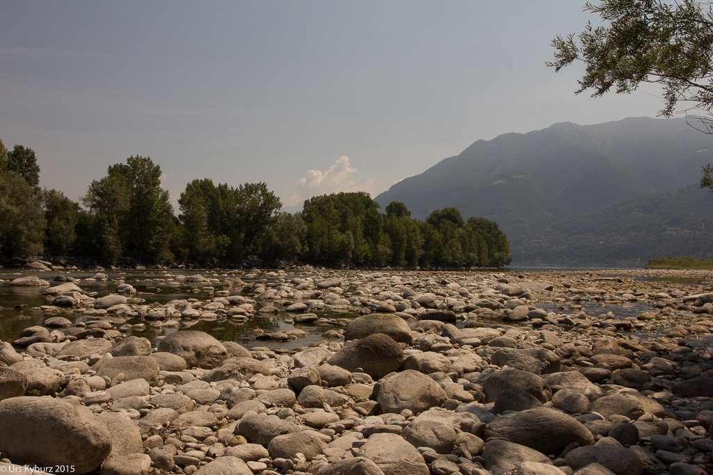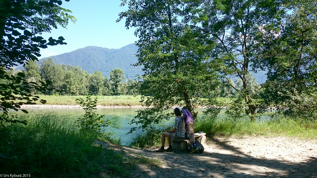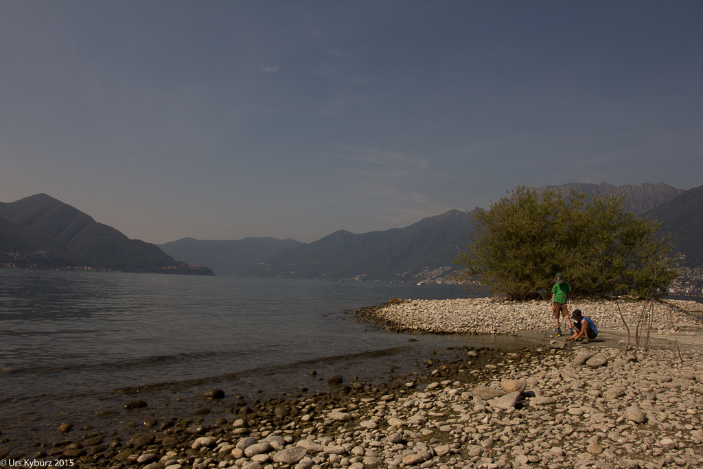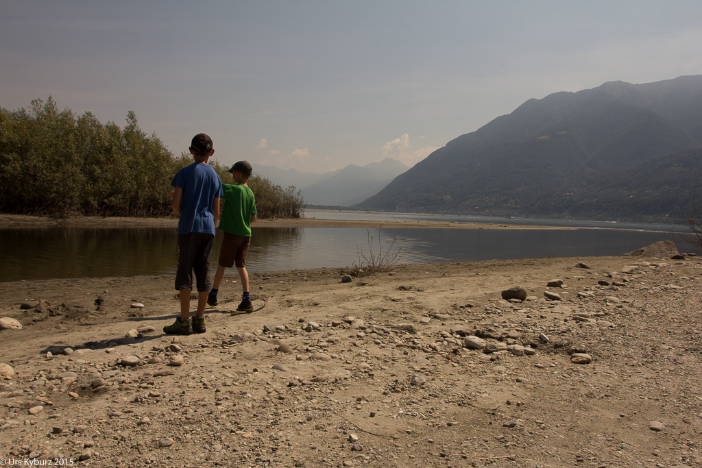 Schlussendlich erreichen wir die Maggia doch noch. Dieser spazieren wir im Schatten von Bäumen entlang und erreichen die Mündung. Dort ist allerdings nichts mit Naturschutzgebiet, die Motorboote reihen sich dort auf wie auf einer Schnur. Wir gehen dem Ufer entlang und folgen dann einem kleinen Pfad durch das Schilf. Dabei treffen wir auf immer neue Pfade, und auch auf einen seltsamen Kauz, der nur mit einem Rucksack bekleidet durch das Unterholz geht. Er ist wohl ebenso überrascht über die Begegnung wie wir. An der Maggia legen wir eine Pause ein, die Kinder spielen mit Sand und Steinen, sie bauen eine Piste für ihre Drahtbikes. Nach der Pause begeben wir uns wieder zu unserem Transportmittel zurück. Damit endet nicht nur diese Wanderung, sondern auch unsere Ferien.