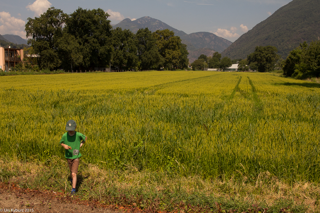 Das zweite naturnahe Gebiet, das wir besucht haben, ist das Maggiadelta, wo die Maggia in den Lago Maggiore mündet. Wir starten in der Nähe des Lido von Ascona. Da hat allerdings vorerst wenig mit Natur zu tun, jedenfalls auf der Landseite. Ein Golfplatz täuscht Natur vor. Dann kämpfen wir uns quasi (es ist immer noch heiss) durch die Quartiere, denn wir sind minimalem Konzept und ohne Karte unterwegs. Dabei passieren wir ein Feld, auf dem ein sonderbares Getreide wächst. Wir sehen uns das näher an: Es ist Reis! Das Maggiadelta ist der einzige Ort in der Schweiz, wo Risotto-Reis angepflanzt wird.