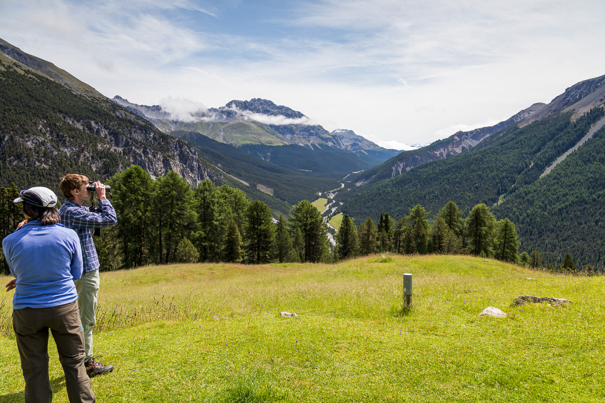 Allen voran natürlich im Nationalpark. Diesen besuchten wir mehrere Male. Eine Wanderung führte uns auf den Munt la Schera. Es war eine lange Wanderung und anstrengend, weil ich viel Kameraequipment mitschleppte, unter anderem das 500 mm-Objektiv mit Kamera, was zusammen schon fast fünf Kilogramm auf die Waage bringt, daneben noch eine kleine Systemkamera und ein Fernglas. Aber gelohnt hat es sich auf alle Fälle.