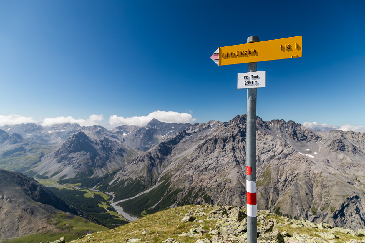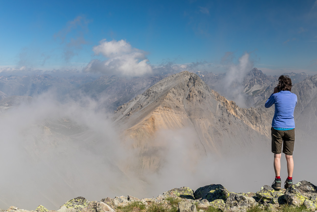Hoch hinaus, auf fast 3000 Meter, geht es auf den Piz Dora, von wo man eine grandiose Aussicht geniesst.