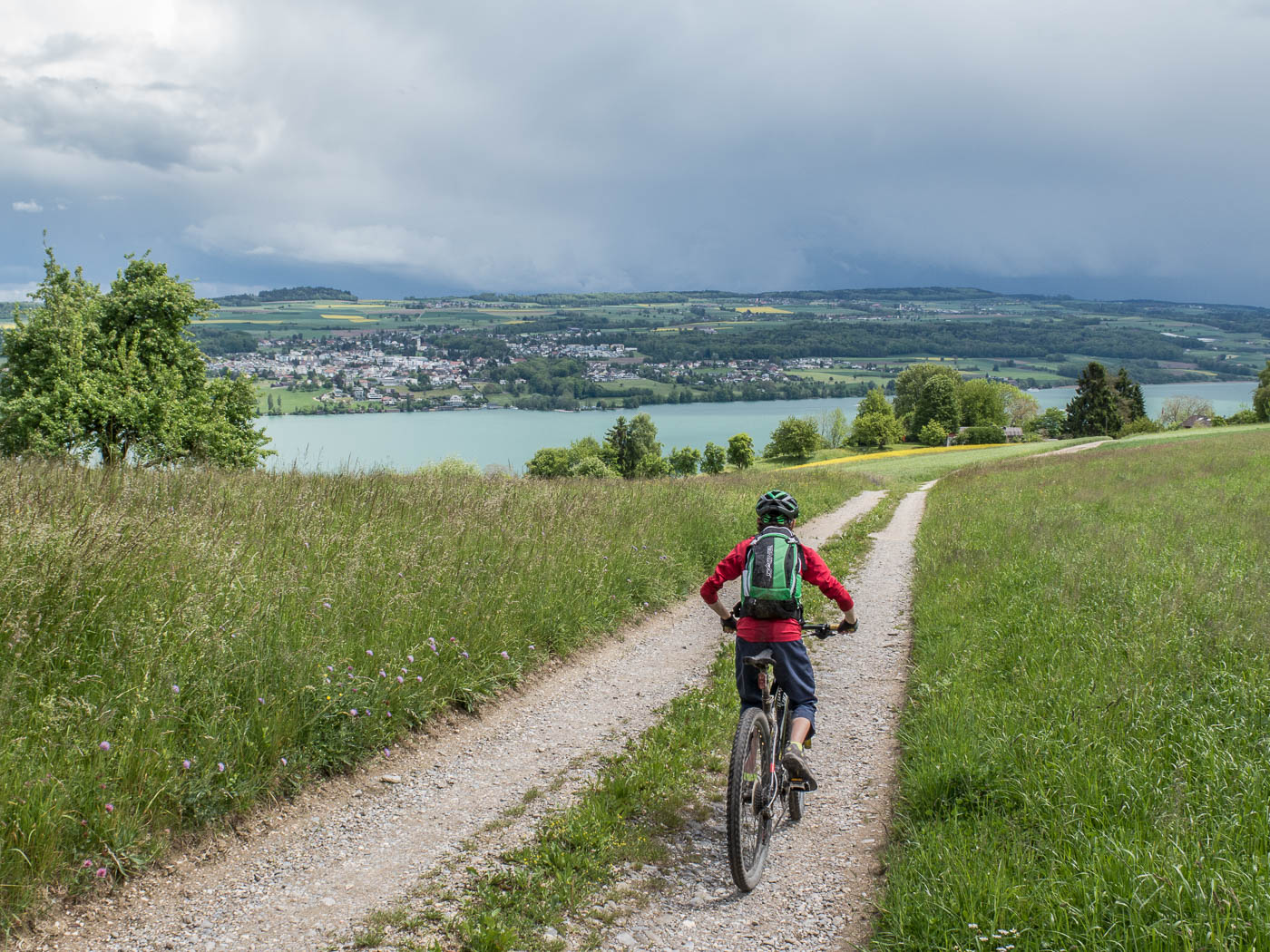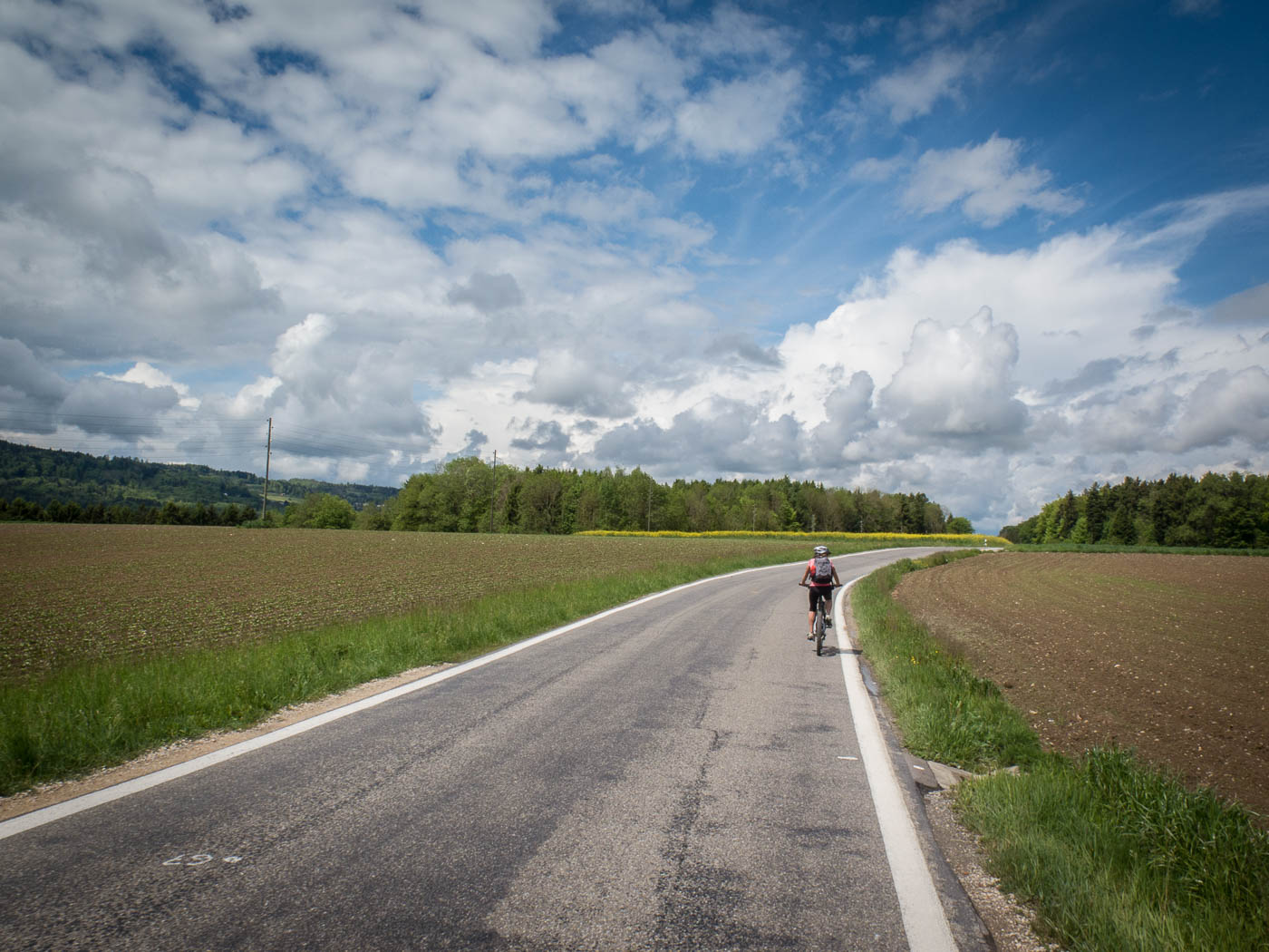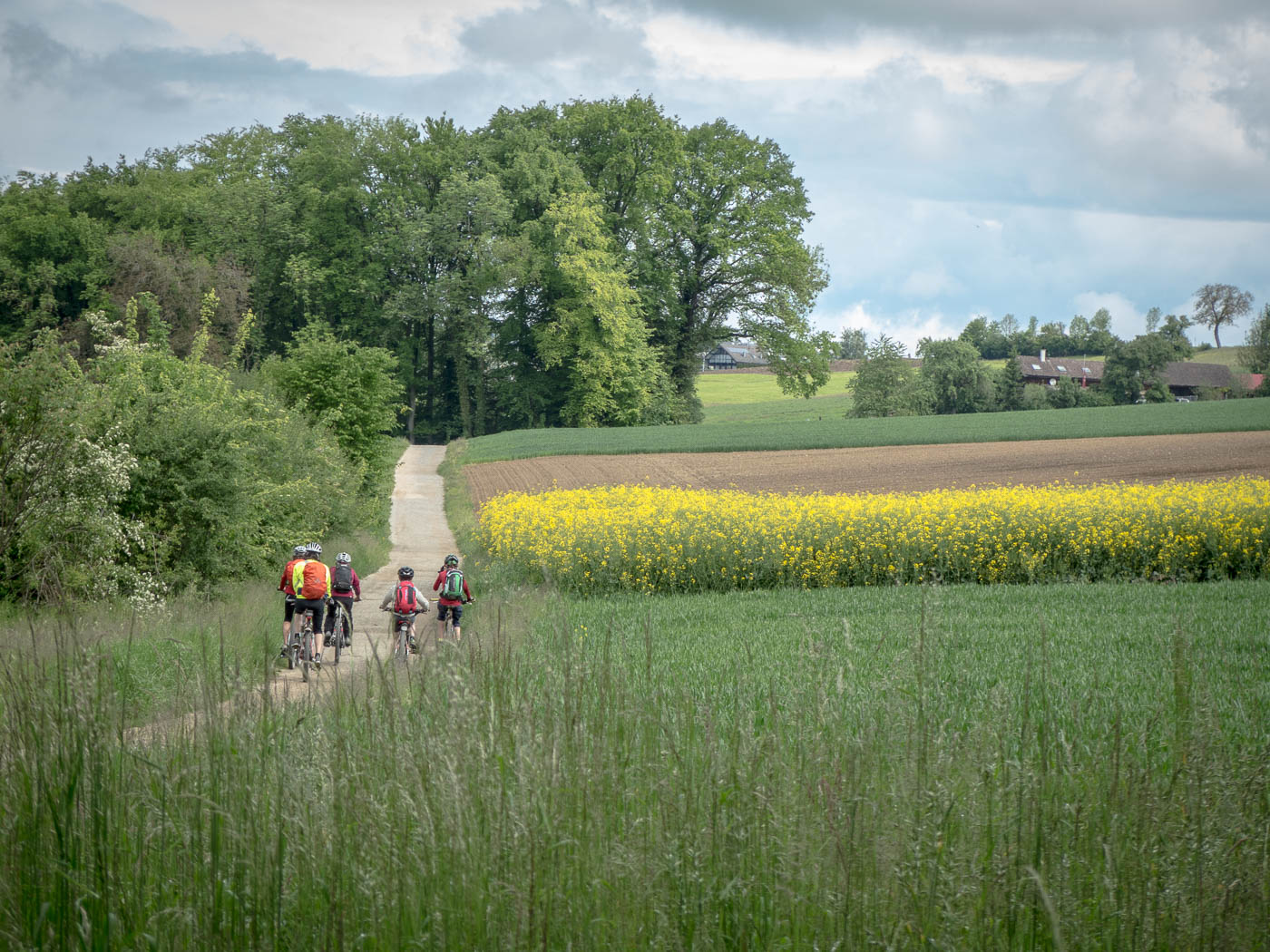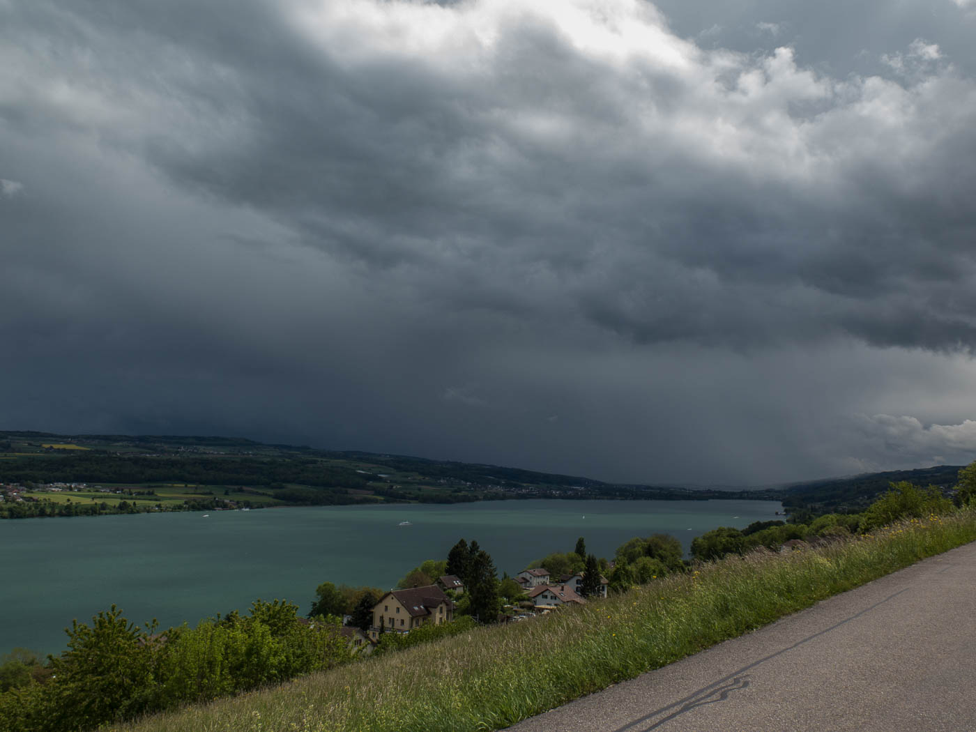 Die Voraussetzungen morgens um acht Uhr waren aber nicht ermutigend: Es schüttete wie aus Kübeln. Ich änderte aber meinen Plan nicht, wir starteten um neun Uhr in Beinwil am See – trocken. Von Schwarzenbach nach Ermensee hinunter wurde es richtig dreckig, wir waren von oben bis unten eingesaut. Was für ein Spass! Bis zum Hofladen Riedweid, wo wir uns einen Kaffee genehmigten, waren wir wieder trocken. Dem See entlang nach Meisterschwanden hatte es überraschenderweise kaum Leute, die waren wohl alle noch beim Brunch.