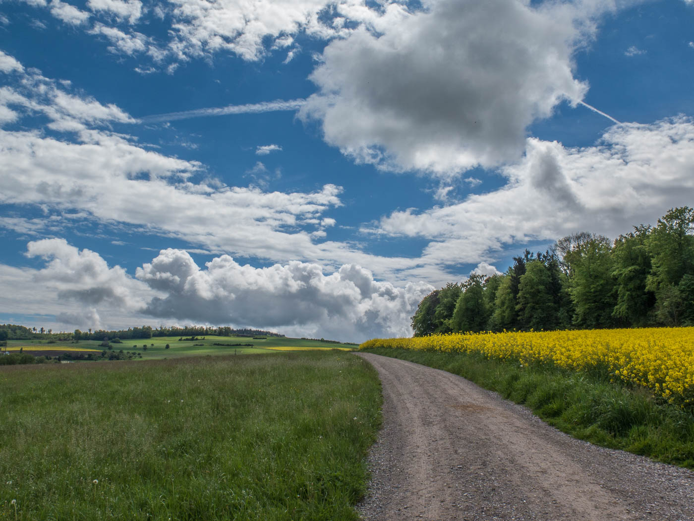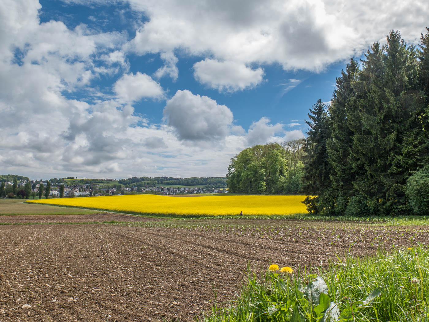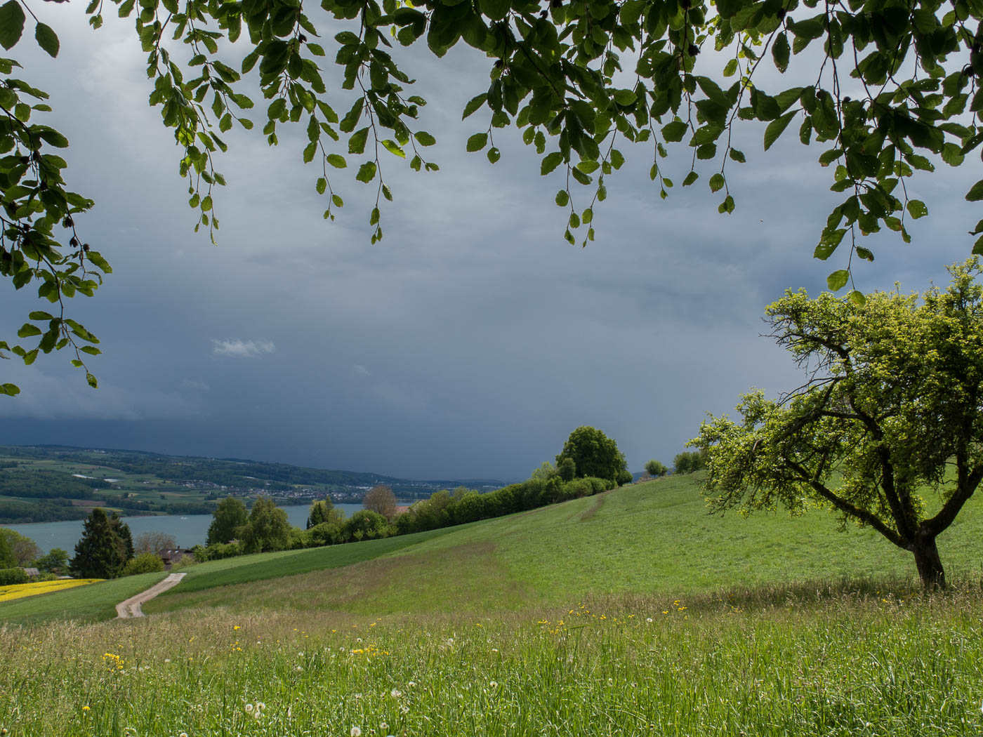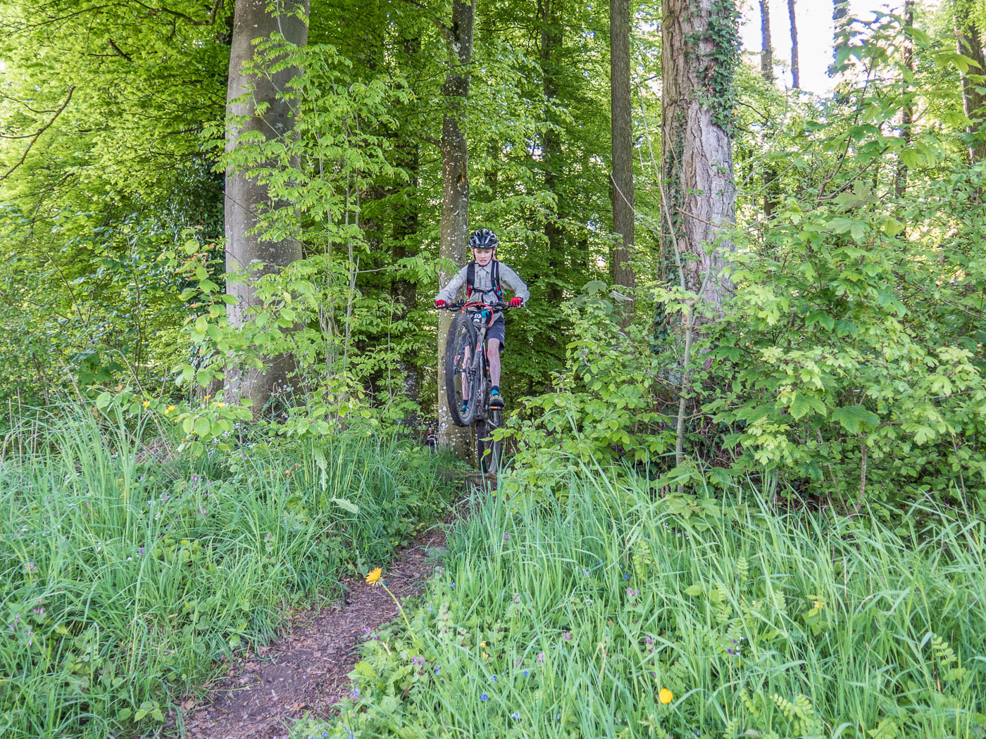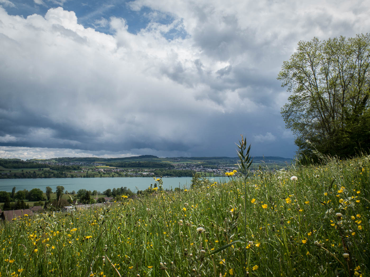 Die Voraussetzungen morgens um acht Uhr waren aber nicht ermutigend: Es schüttete wie aus Kübeln. Ich änderte aber meinen Plan nicht, wir starteten um neun Uhr in Beinwil am See – trocken. Von Schwarzenbach nach Ermensee hinunter wurde es richtig dreckig, wir waren von oben bis unten eingesaut. Was für ein Spass! Bis zum Hofladen Riedweid, wo wir uns einen Kaffee genehmigten, waren wir wieder trocken. Dem See entlang nach Meisterschwanden hatte es überraschenderweise kaum Leute, die waren wohl alle noch beim Brunch.