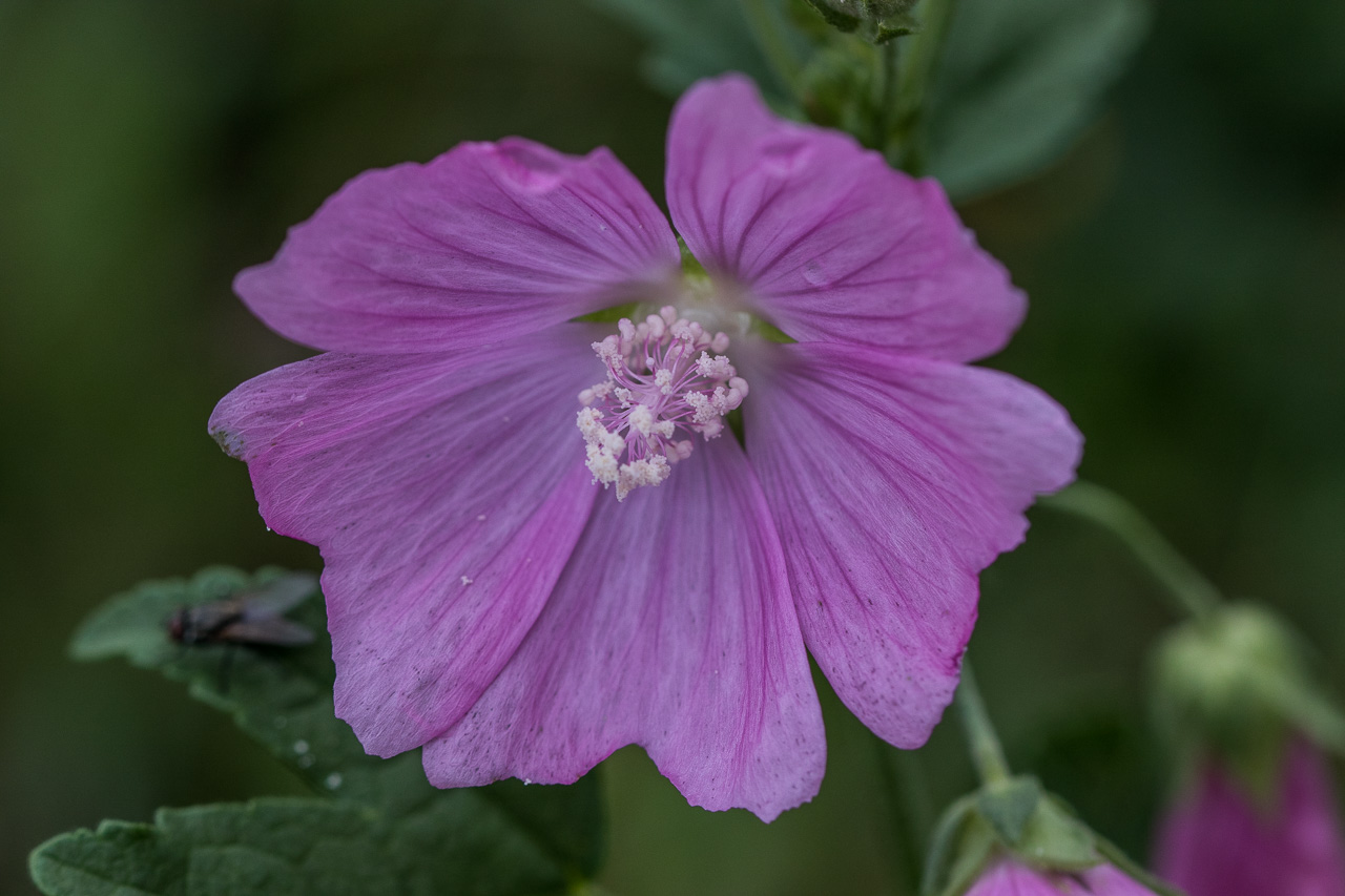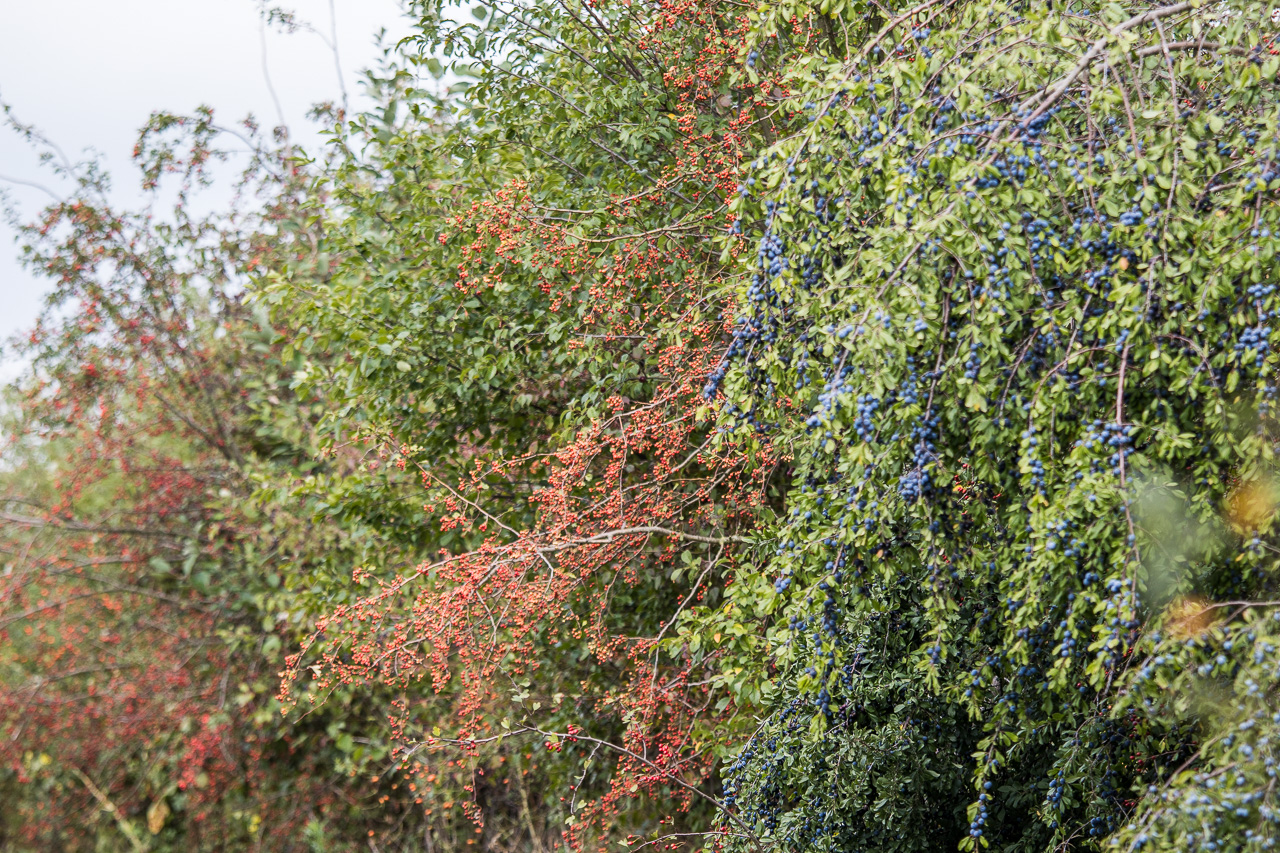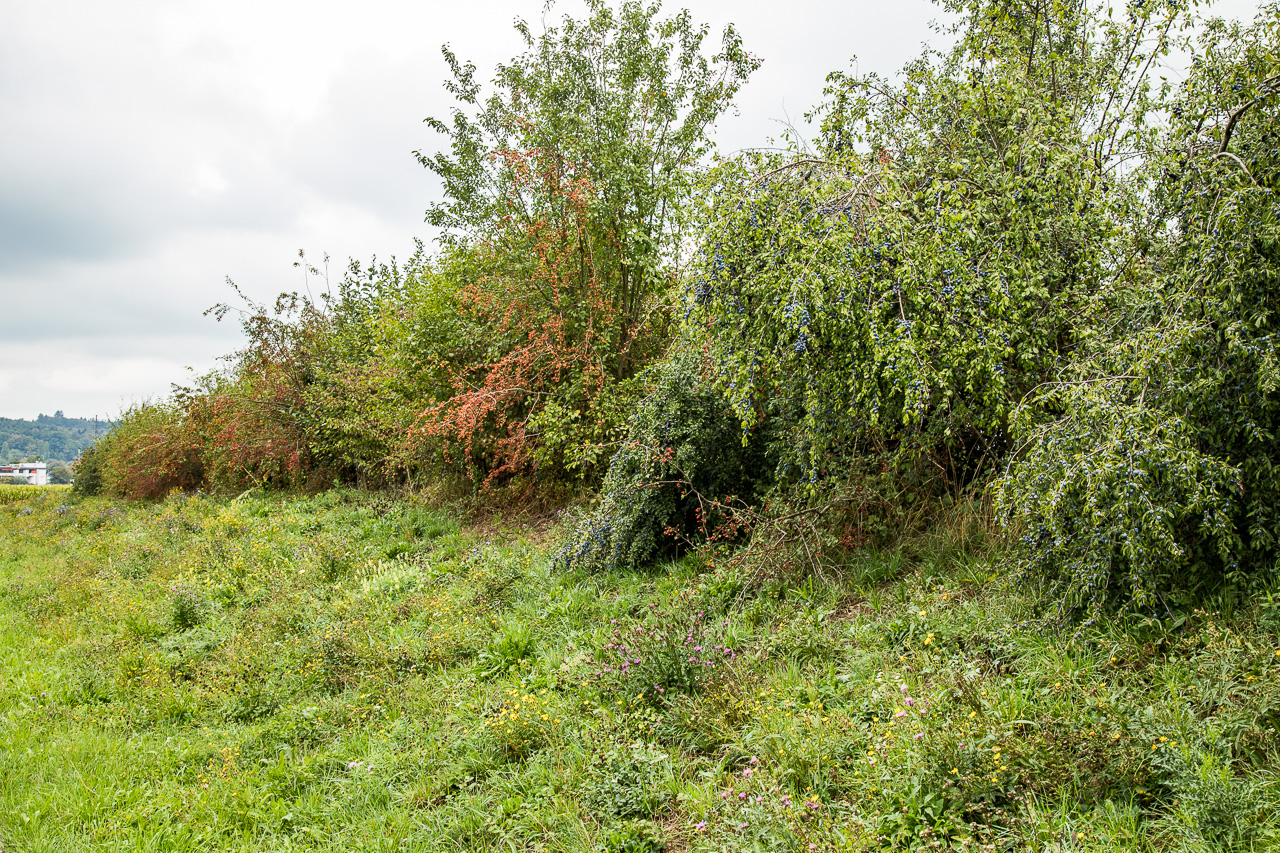 Wir gehen ein Stück westwärts, am Wall blühen noch zahlreiche Blumen, die Sträucher tragen Früchte im Überfluss. Schwarzdorn, Weissdorn und Rosen brechen fast zusammen unter der Last.