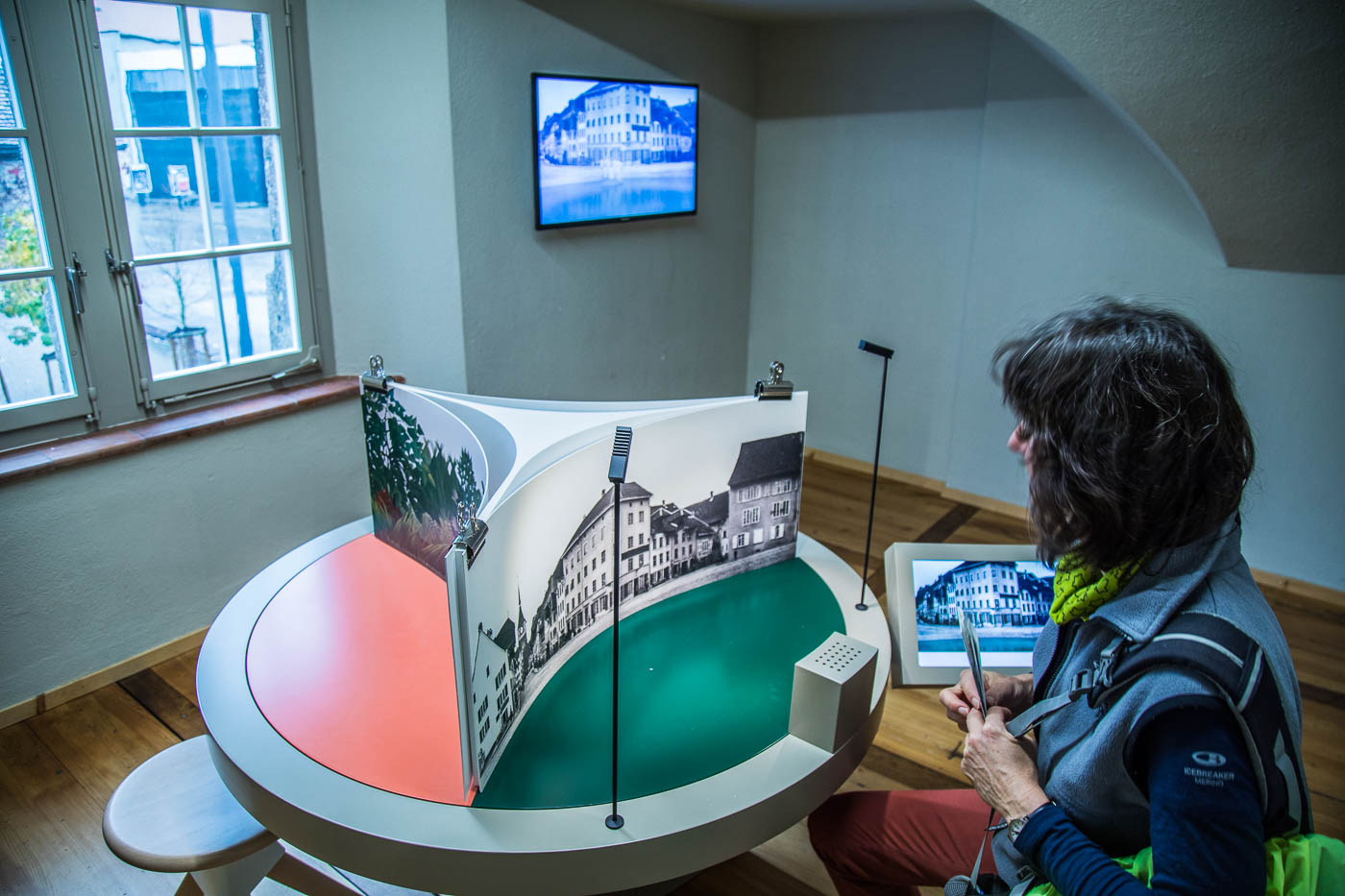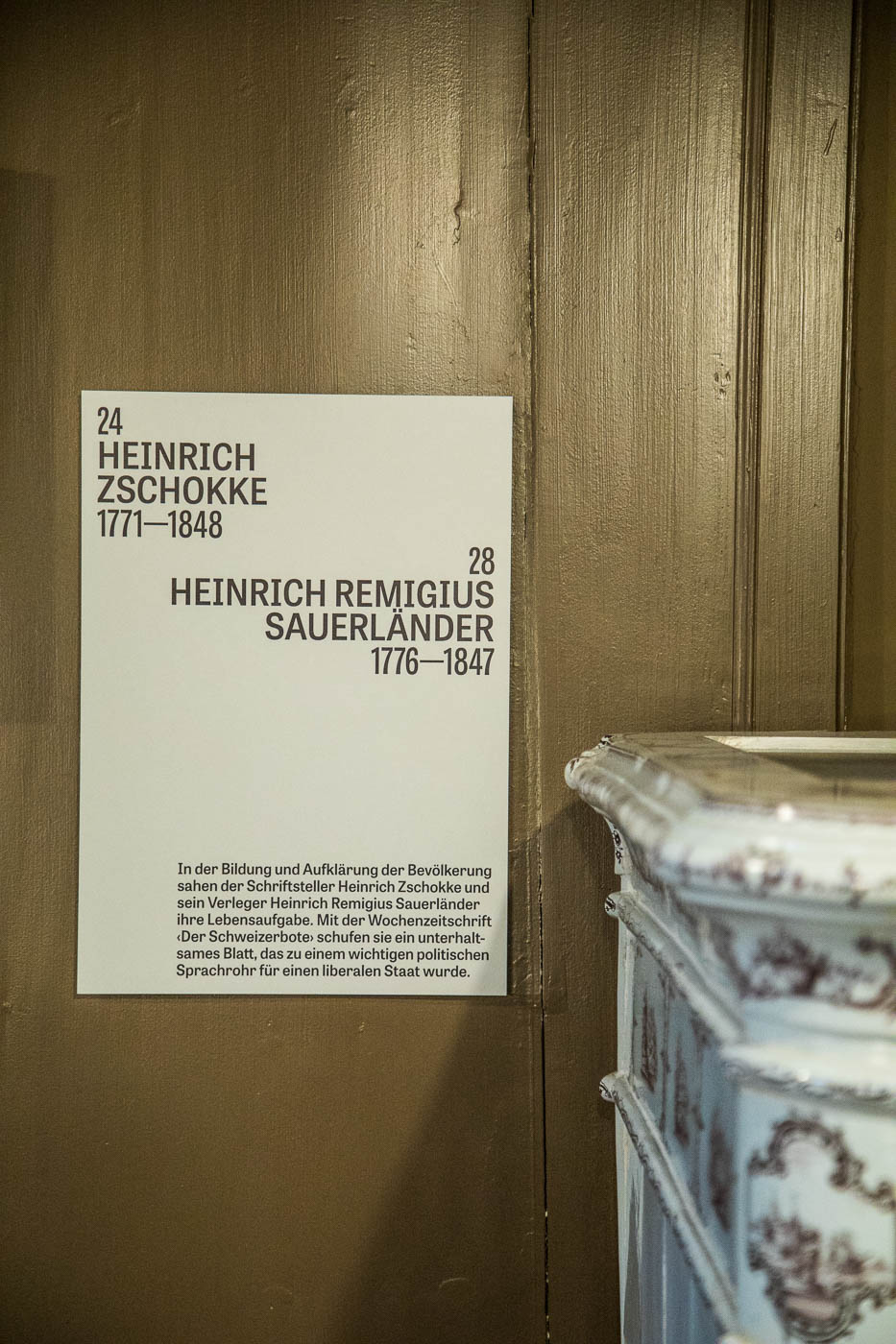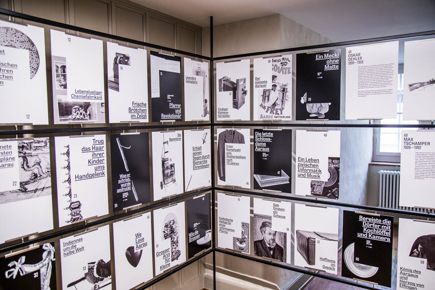 Im alten Gebäudeteil werden 100 Persönlichkeiten der Stadt Aarau vorgestellt, berühmte und unbekannte, aus sieben Jahrhunderten. Eng verbunden mit den Persönlichkeiten ist die Industriegeschichte von Aarau. Namen wie Sauerländer, Zschokke und Kern sind wohl der einen oder dem anderen noch ein Begriff. Wenig bekannt ist, dass Aarau einmal die Hauptstadt der Schweiz war, wenn auch nur provisorisch und nur für drei Monate. In diesem Umfeld taten sich natürlich auch einige Personen hervor. Bekannt waren auch die Präzisionsinstrumente der Firma Kern. Viele haben bestimmt noch einen Zirkel mit diesem ehemals klangvollen Namen.