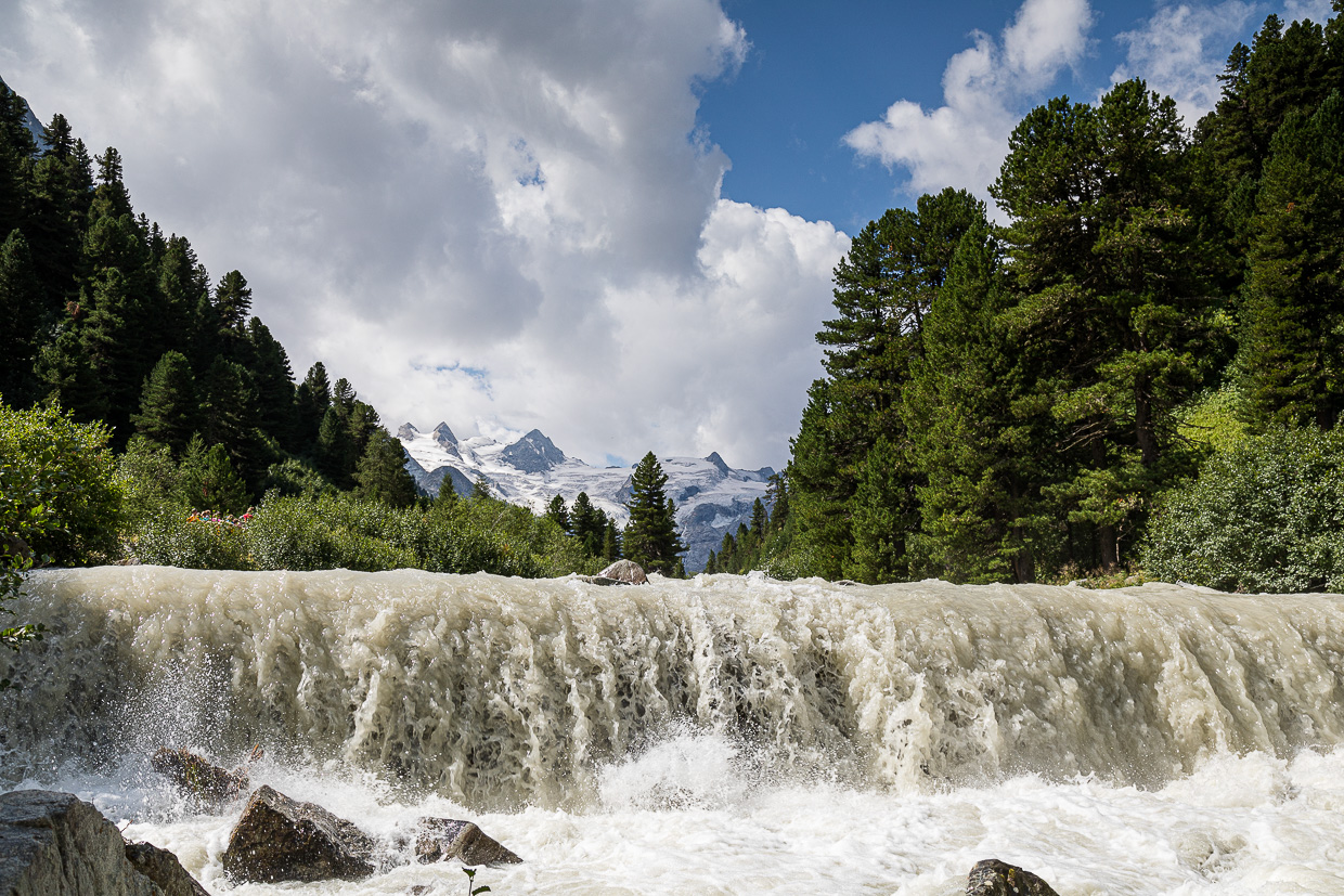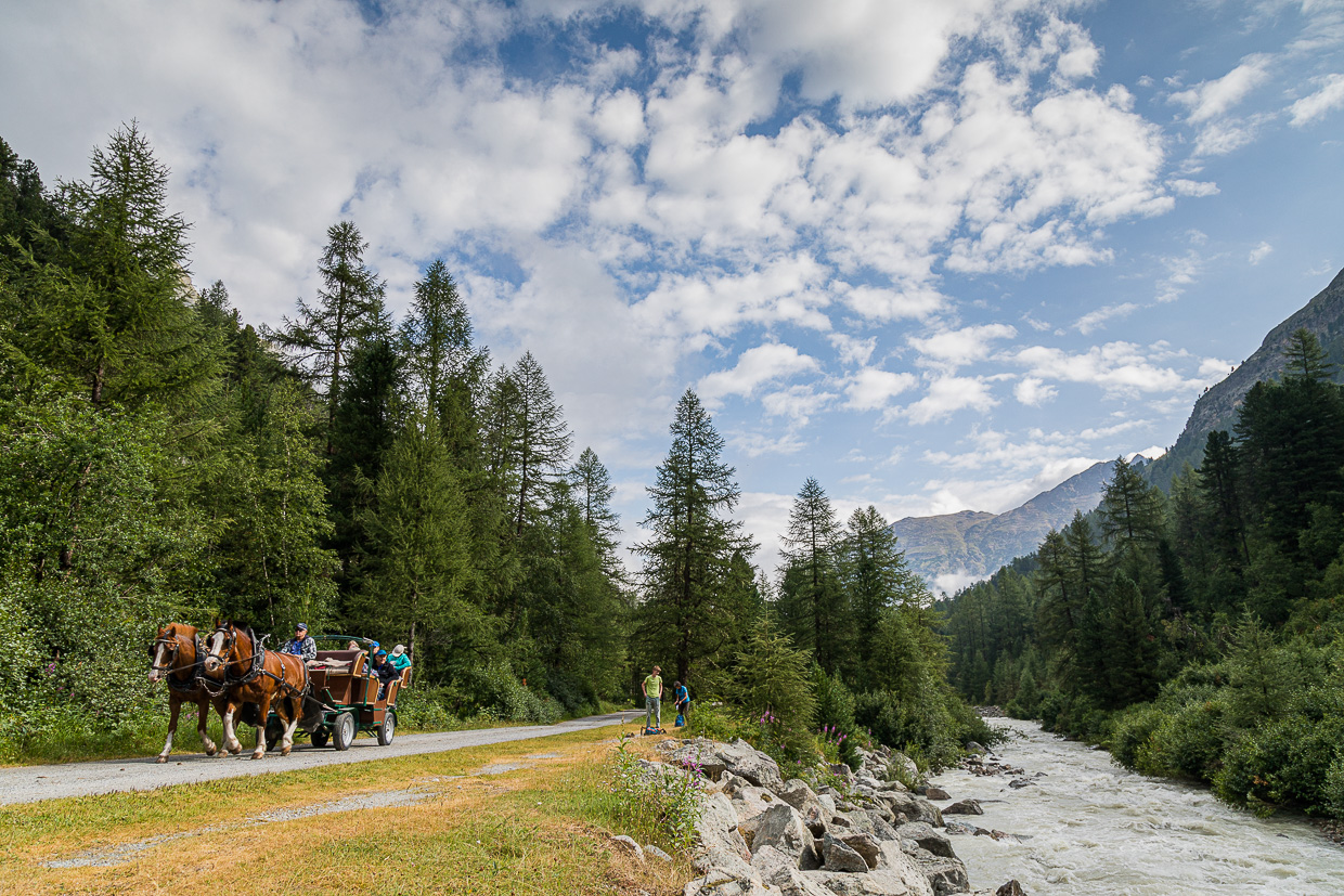 Plötzlich stehen wir vor Absperrband, der Wanderweg ist gesperrt, eine Umleitung markiert. Jä nu, wir wechseln halt über die Ova da Roseg, wie der Rosegbach auf rätoromanisch heisst. Statt aber direkt auf die Strasse zu gelangen, streifen wir auf einem schmalen Pfad dem Ufer entlang. Nach ungefähr 300 Meter müssen wir doch auf die Strasse, was wir für eine kurze Pause nutzen. Da kommt auch schon die erste Pferdekutsche angerollt. Das Tal ist autofrei (zumindest in der Theorie, bei uns fuhren ständig Autos vorbei), wer sich den Fussmarsch ersparen will, kann in Pontresina in eine Kutsche steigen.