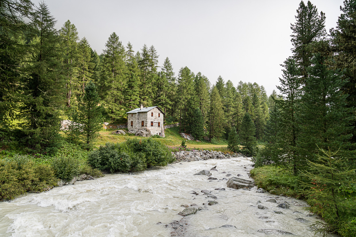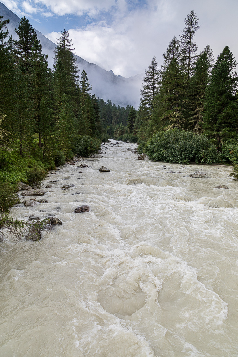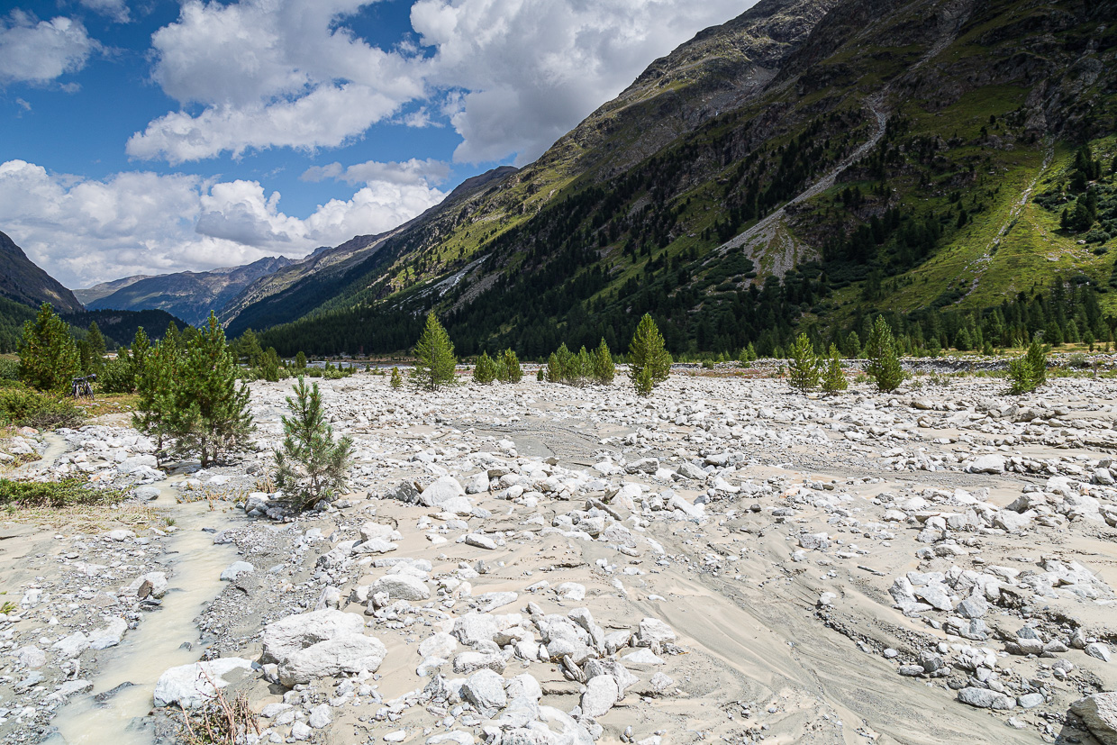 Wir kommen beim Gasthaus Roseg an, wo wir uns entscheiden müssen: Hoch zur Fuorcla Surlej wie geplant oder doch wieder zurück angesichts der fortgeschrittenen Zeit? Silvan will nicht mehr hoch, lieber noch die Natur hier erkunden, auch wir finden, dass es bereits zu spät ist, um noch dort hochzuwandern. Was wir nicht bedacht haben: Kilometermässig wäre es weniger weit, als durch das ganze Tal zurückzuwandern. Jedenfalls gehen wir noch weiter ins Tal hinein.