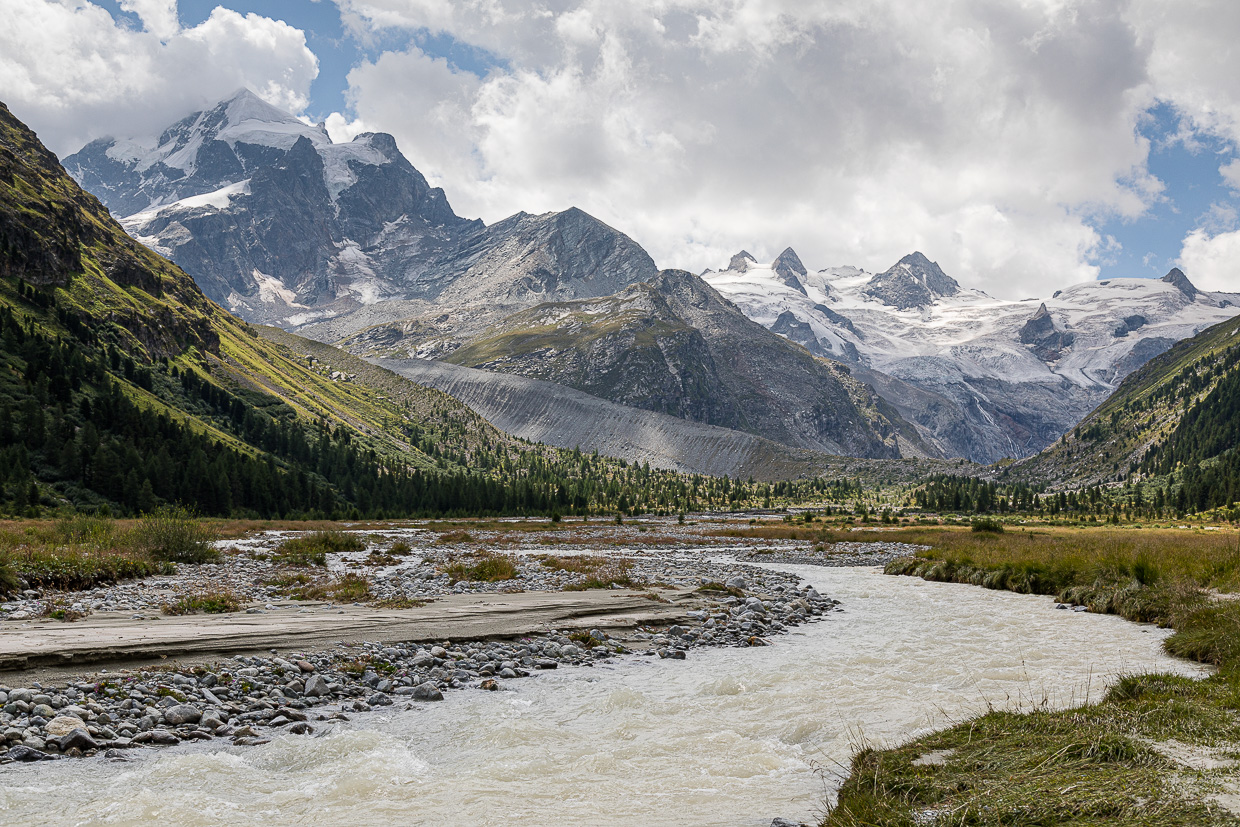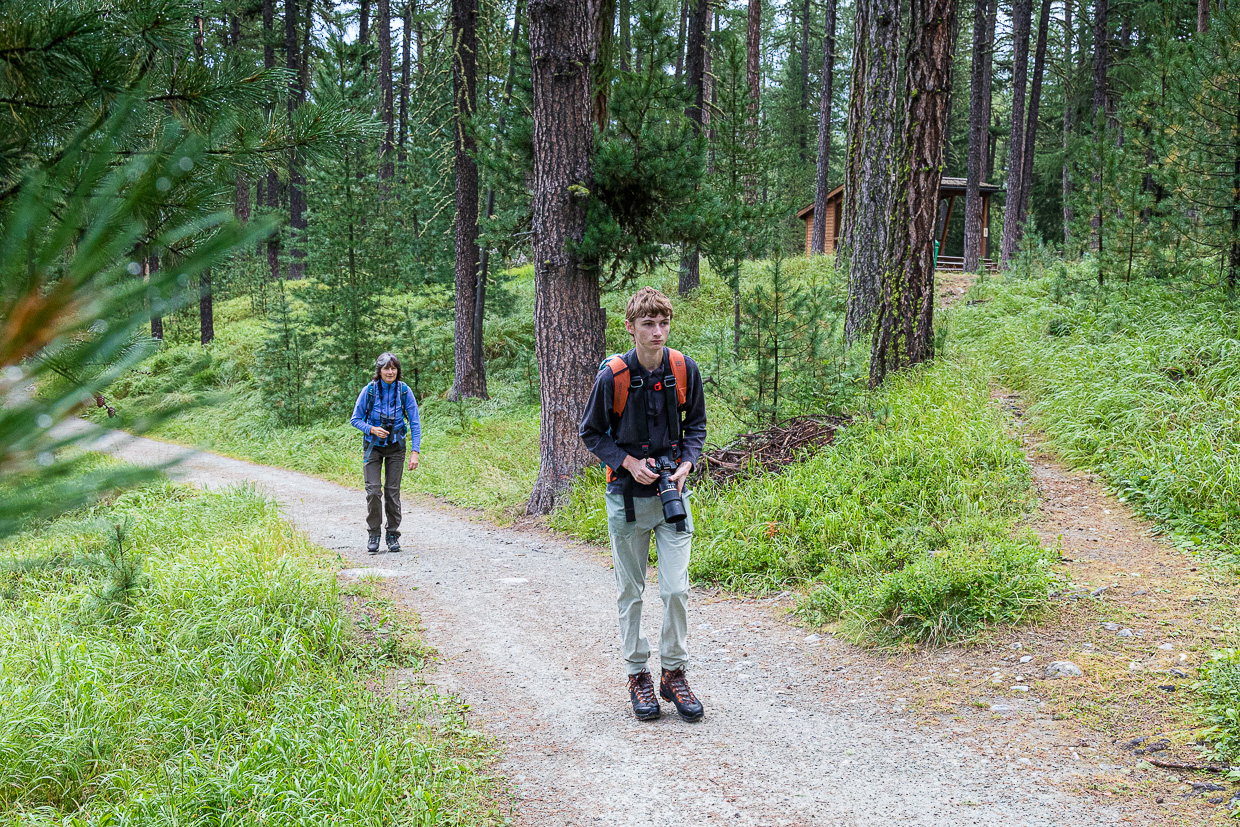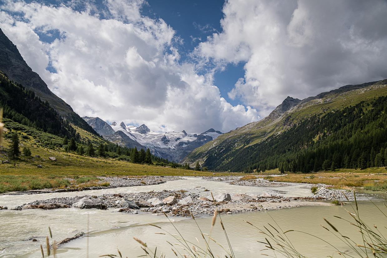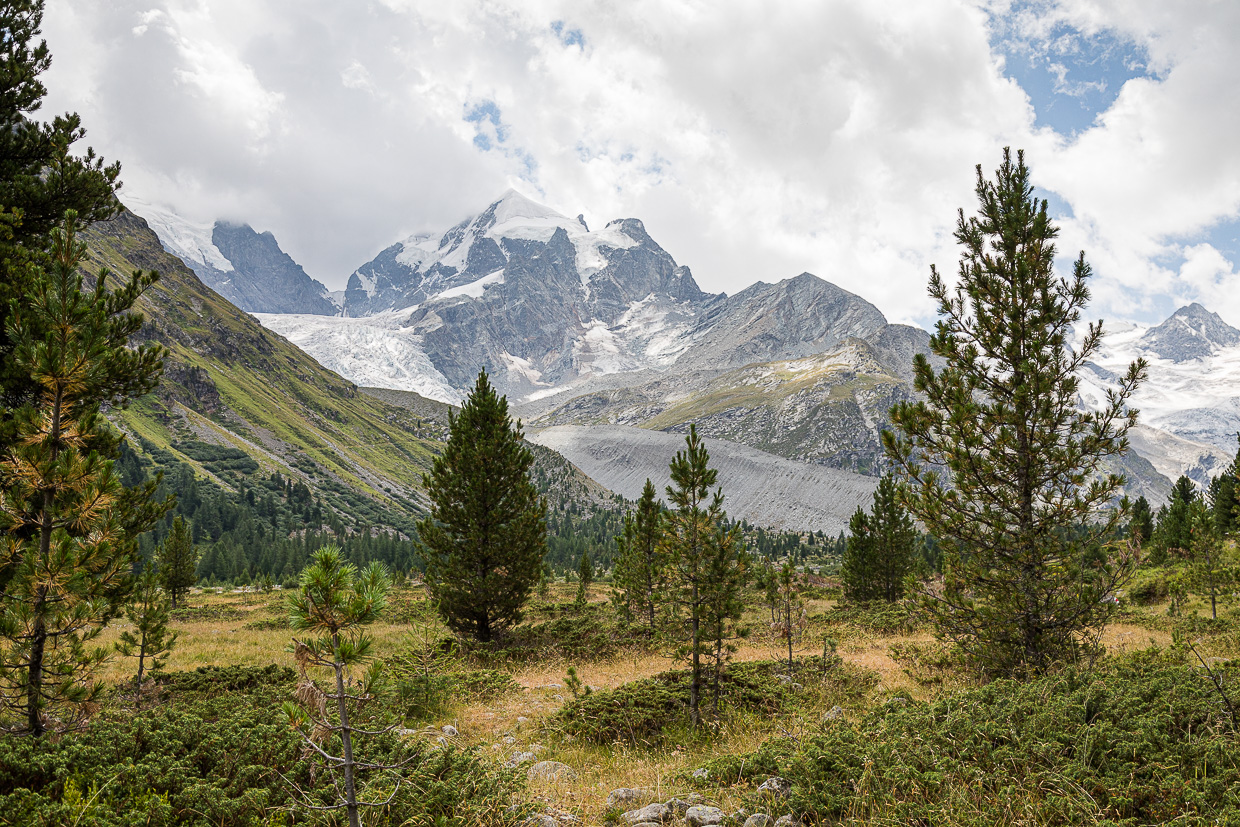 Wir kommen beim Gasthaus Roseg an, wo wir uns entscheiden müssen: Hoch zur Fuorcla Surlej wie geplant oder doch wieder zurück angesichts der fortgeschrittenen Zeit? Silvan will nicht mehr hoch, lieber noch die Natur hier erkunden, auch wir finden, dass es bereits zu spät ist, um noch dort hochzuwandern. Was wir nicht bedacht haben: Kilometermässig wäre es weniger weit, als durch das ganze Tal zurückzuwandern. Jedenfalls gehen wir noch weiter ins Tal hinein.