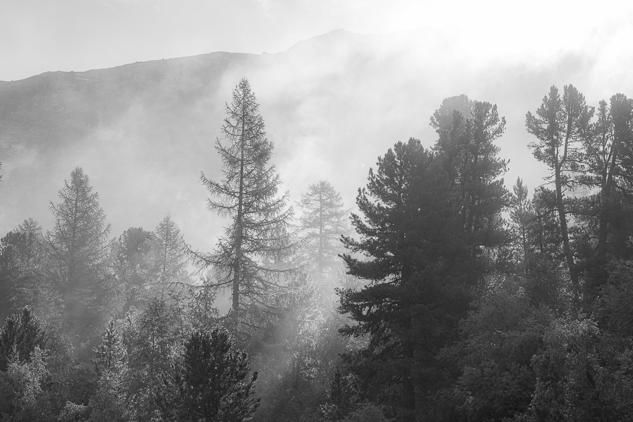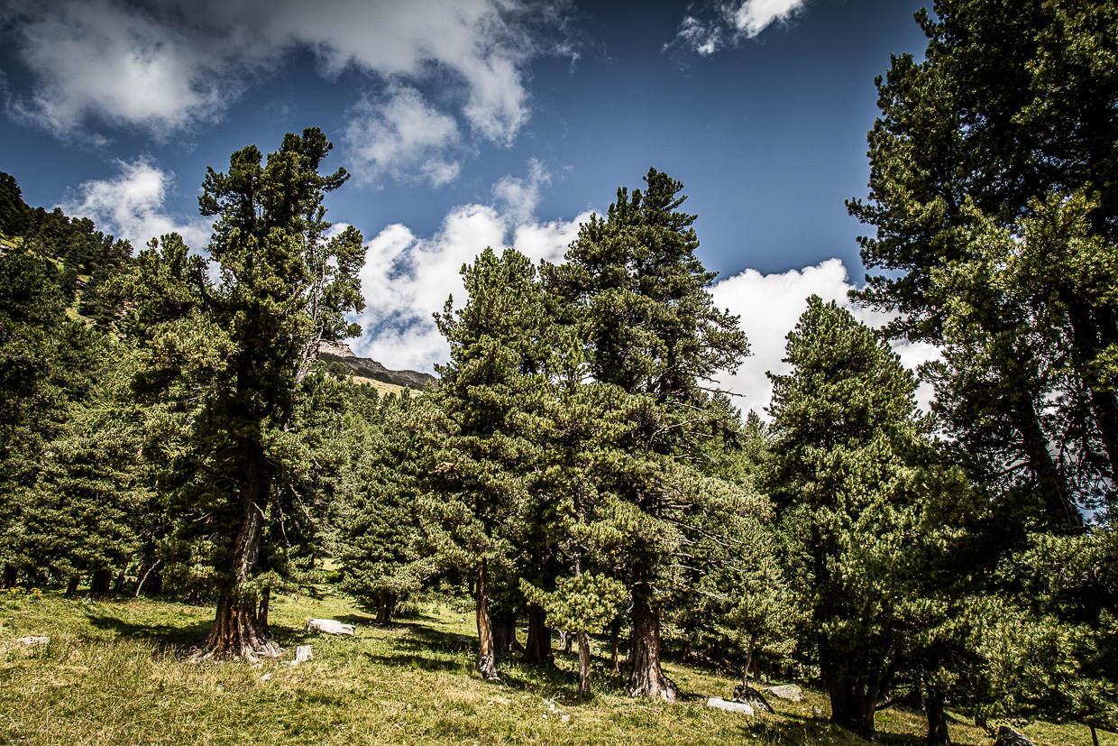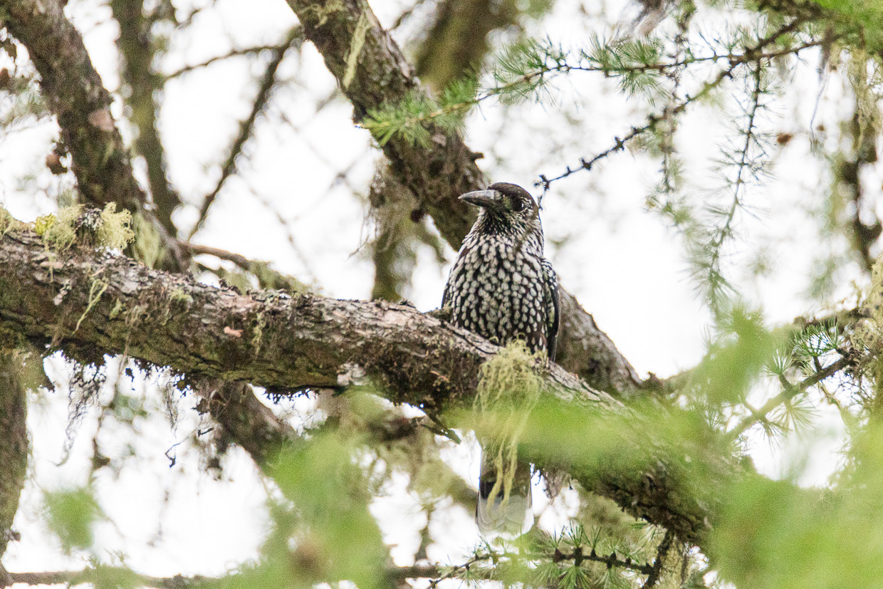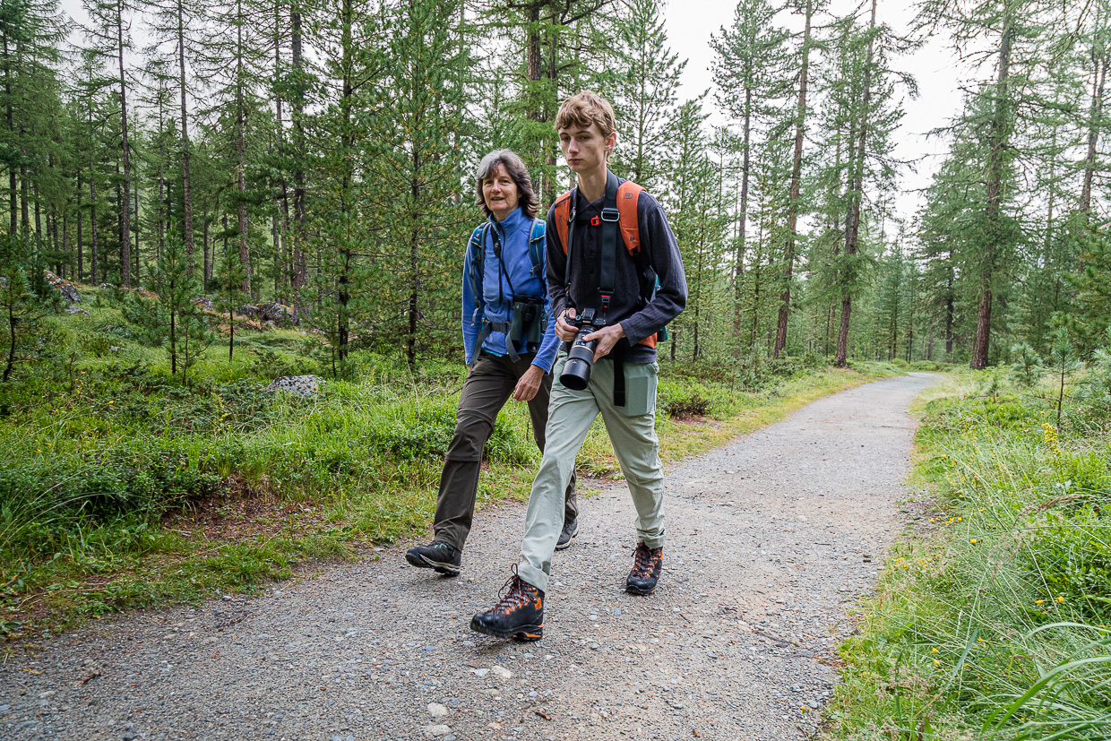 Wir starten um halb acht, Pontresina scheint noch wie ausgestorben. Gut so! Unser Ziel soll die Corvatsch Mittelstation Murtèl sein. Wir tauchen in den Wald ein, uns umgibt eine wunderbare Stille. Nur Vögel huschen und fliegen umher. Wir beobachten eine Spechtfamilie, ungefähr fünf Buntspechte brechen die Stille und machen mit ihren Rufen auf sich aufmerksam. Haubenmeisen und Tannenmeisen wuseln in den Ästen herum auf der Suche nach Nahrung.