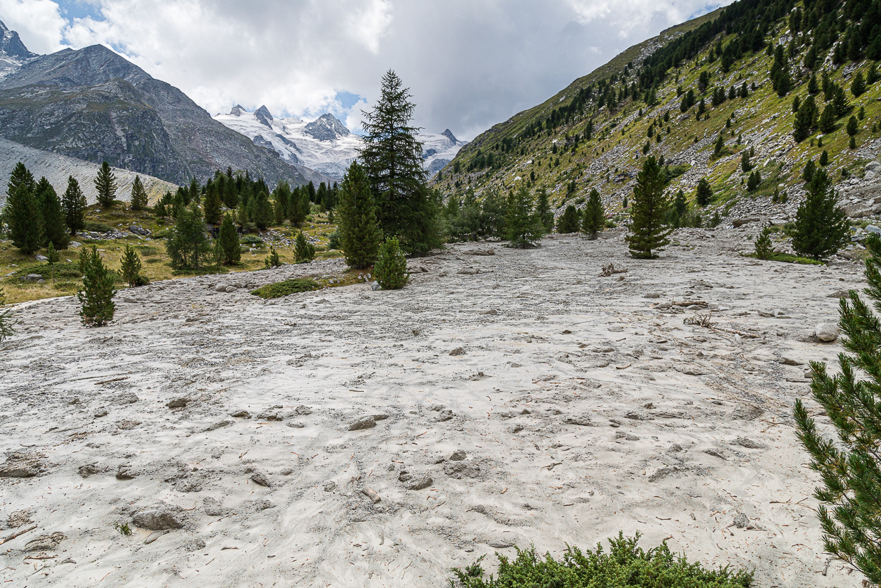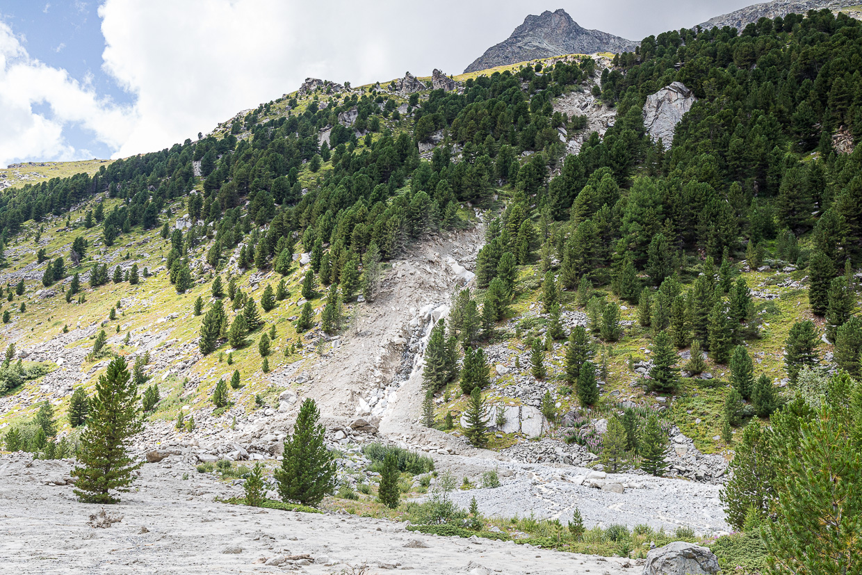 Ein Mann kommt uns entgegen, verschlammt bis zu den Knien. „Wollt ihr zur Coaz-Hütte? GEHT! NICHT! HIER! DURCH!“ Hatten wir nicht vor, aber danke für die Warnung. Ein Murgang hat beim Gewitter letzte Nacht den ganzen Weg hüfthoch mit Schlamm bedeckt. Entweder kämpften sie sich da durch, oder sie kehrten wieder um und nahmen den oberen Weg. Es kommen noch mehrere Leute entgegen, alle warnen uns. Das weckt natürlich unsere Neugier. Bald sehen wir das Ausmass: Eine Geröll- und Schlammlawine hat sich über hundert Meter breit in die Ebene ergossen!