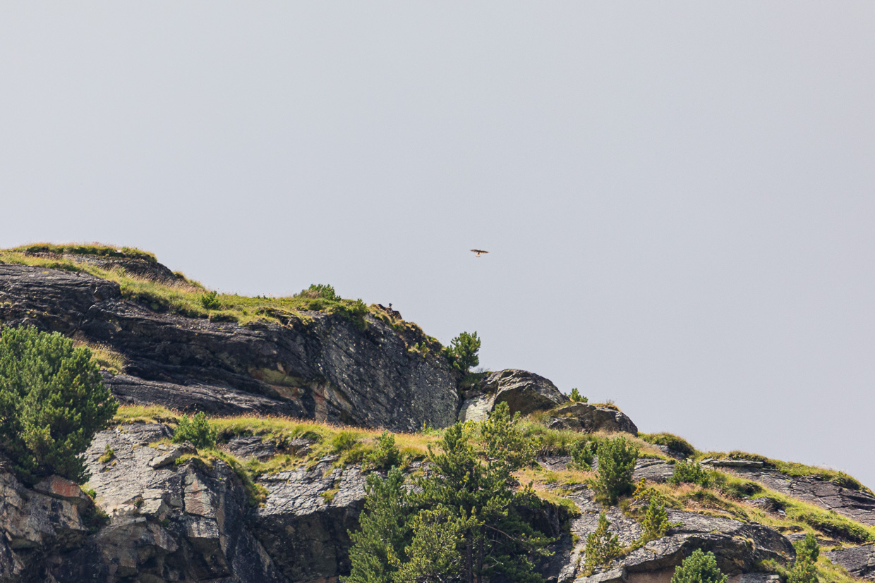 Wir verzichten auf den Besuch des Sees, es gibt hier schon genug zu sehen. Nach einer kurzen Pause kehren wir zurück. Natürlich schauen wir uns um, da entdecken wir am Himmel einen Bartgeier! Allerdings nur kurz, dann verschwindet er. Kurz darauf setzt er sich auf einen Felsen am Horizont, wir können ihn grad noch so erkennen mit den Ferngläsern. Ein Turmfalke taucht auf, fliegt dauernd Angriffe, der Geier breitet zur Abwehr seine mächtigen Schwingen aus. Da kommt jemand entgegen und fragt, was wir da sehen. „Einen Bartgeier, dort oben auf dem Felsen, der Turmfalke attackiert ihn.“ Er guckt mit seinem Fernglas: „Tatsächlich, so schön, super!“ Er ruft seiner Begleitung, die ein wenig voraus war. Endlich mal ein richtiger Naturfreund, der sich wirklich freut. Einer, für den es nicht nur Steinböcke, Gämsen und Murmeltiere gibt.