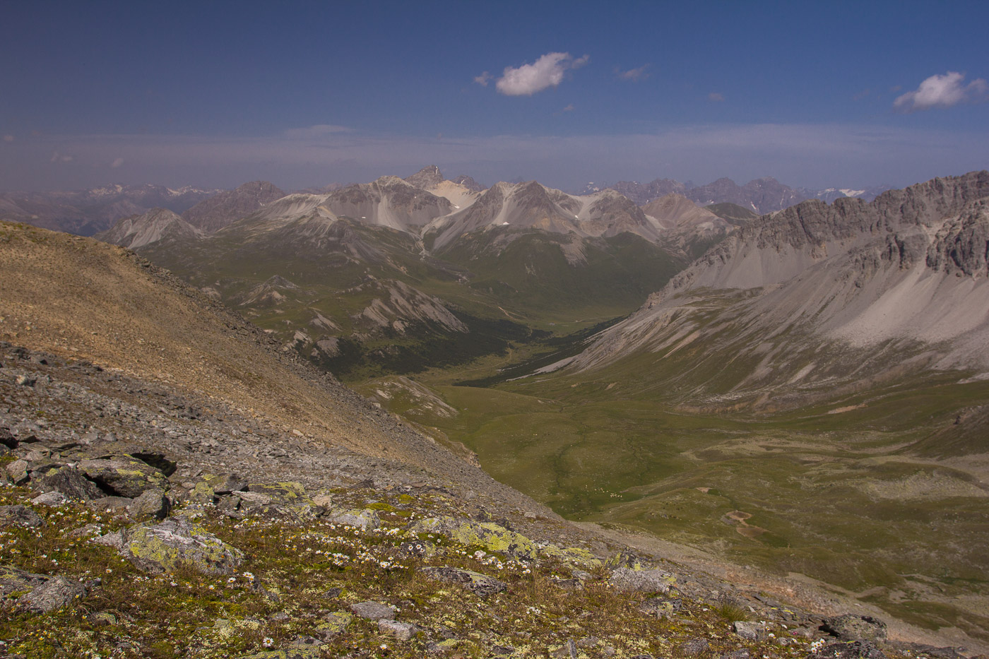 Bezüglich Blumennamen lasse ich mich gerne belehren. Bald erreichten wir den Gipfel. Wir genossen eine wunderbare Aussicht bis ins Südtirol, auf den Ortler, den Nationalpark und alle anderen Bündner Berge.