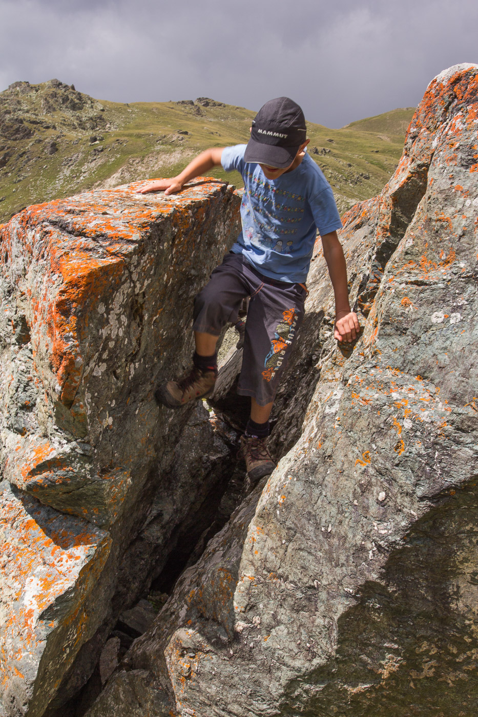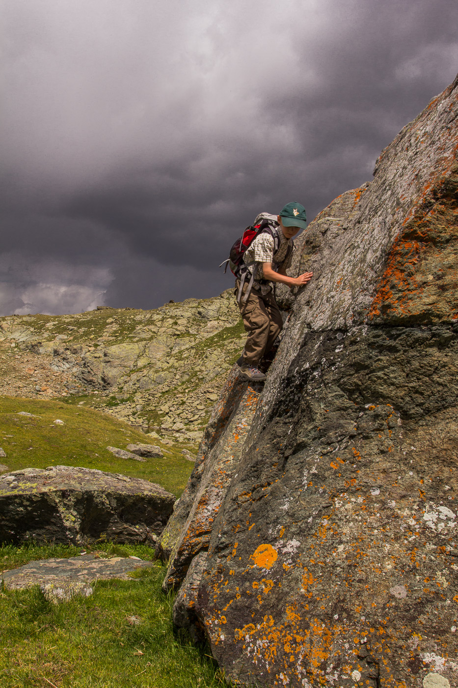 Allmählich verdüsterte sich der Himmel. Als auch noch Donner grollte, war das das Zeichen zum Aufbruch. Wir machten uns wieder an den Abstieg. Fabian klagte über Schmerzen beim Rucksacktragen und überlegte sich eine neue Tragart, die sich allerdings nicht durchsetzen wird.