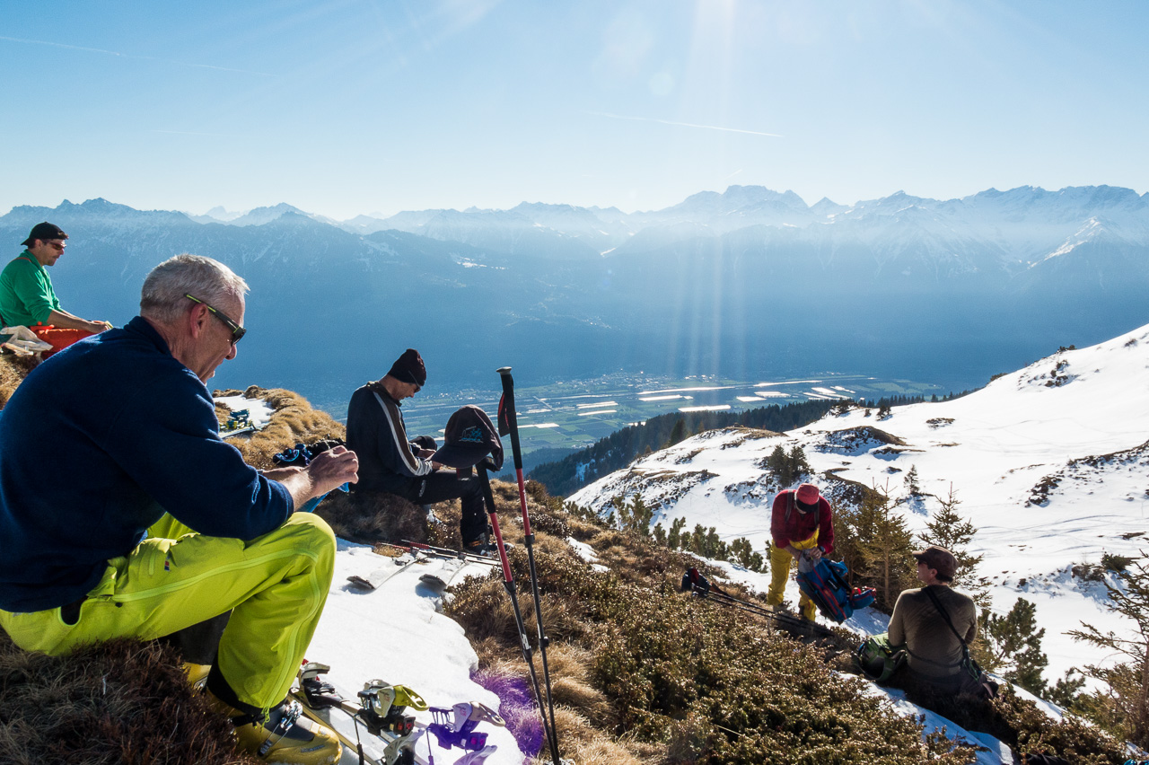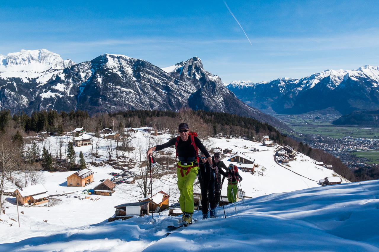 Wir treffen uns beim Tourenleiter in seinem Wochenendhaus in Wangs und lassen es uns erst mal gut gehen. Mal schauen, was diese Woche bringt, denn das Lawinenbulletin zeigt die Stufe 4 „gross“ an. Frisch gestärkt starten wir spät, um elf Uhr, zur Tour bei Vermol am Eingang zum Weisstannental. Der Schnee ist schon ziemlich weich. Durch Schneisen im Wald steigen wir höher zur Waldgrenze, von dort weiter zum Gipfel. Ich erspähe den Garmil, unser Ziel eineinhalb Monate zuvor. Noch einige Meter, dann stehen wir auf dem Gipfel und geniessen eine grossartige Aussicht.